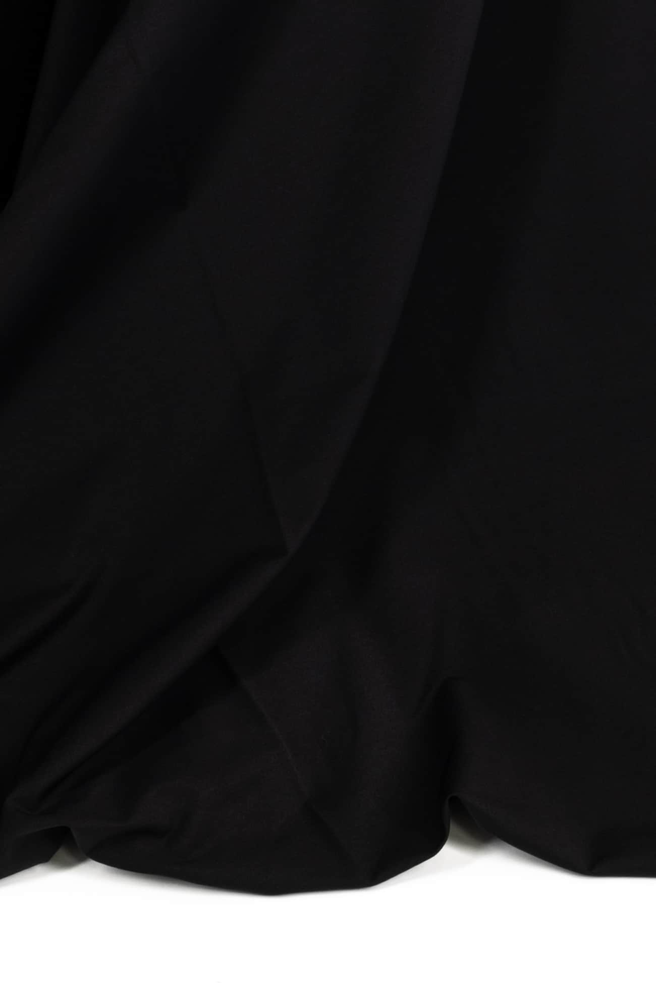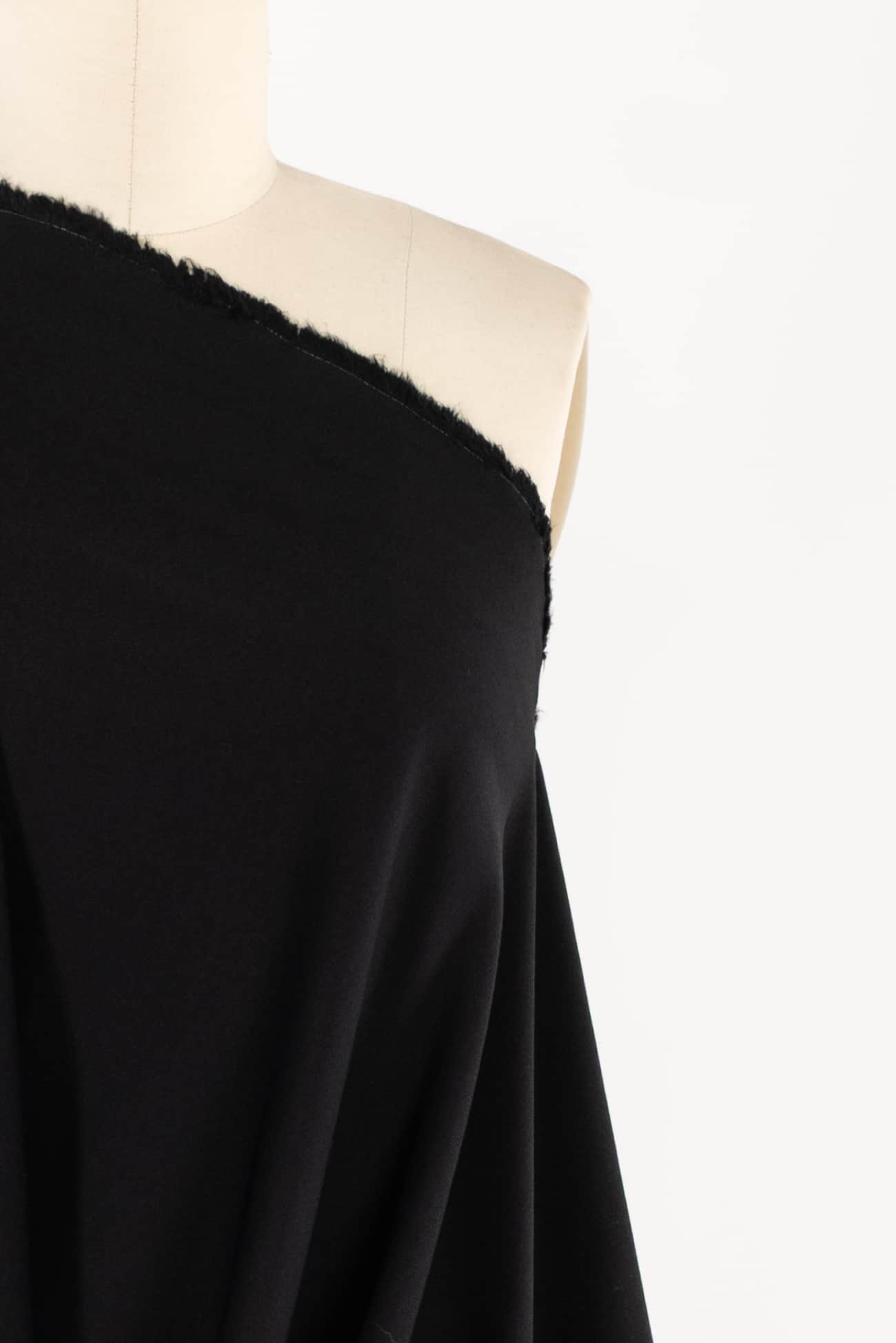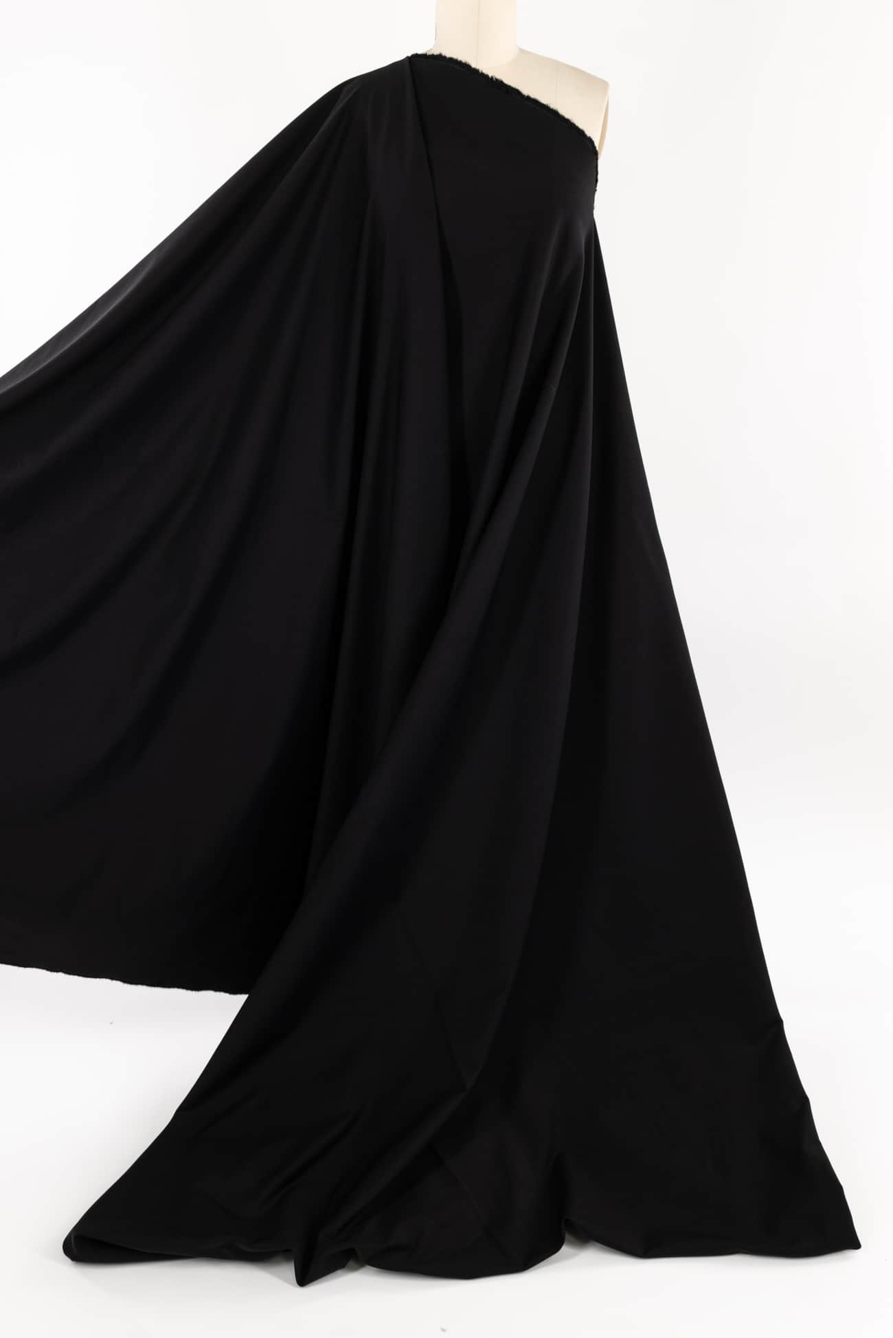 Classic black in a bengaline stretch woven that is ideal for both tops and bottoms. I search for this type of fabric which is similar to those used in some of my own favorite RTW pants and jackets as it has excellent stretch and recovery, a smooth surface so other garments slide over/under easily, and is comfortable to wear and is an ideal fiber blend. Mid-weight, (slimming, not thick or heavy). Has lengthwise stretch; cut on the cross grain so the stretch goes around the body. Matte, with a cool, dry hand and lightly crisp drape. Pant perfect - right for fitted and softer pants. A good choice for a jacket, vest, duster coat, skirt, structured dress or jumpsuit. Ideal for travel and wardrobing.