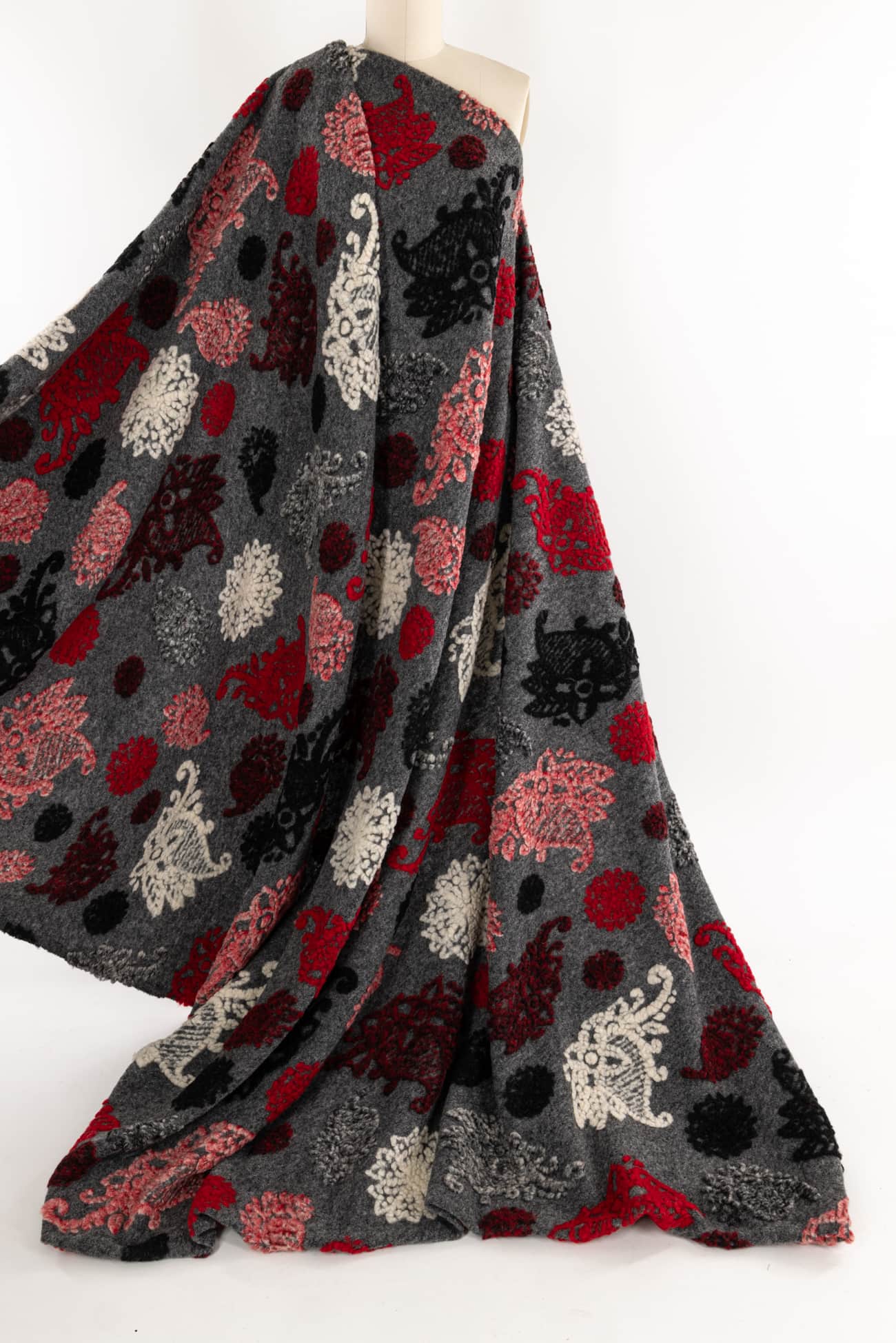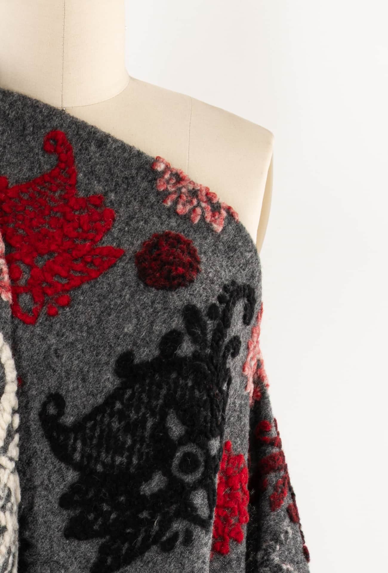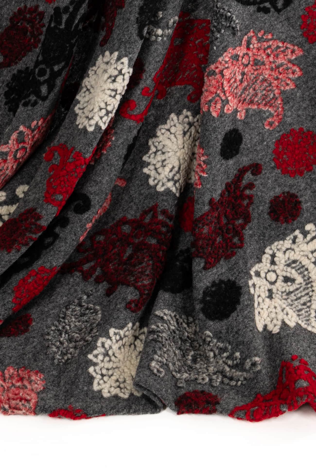 Dramatic wool knit with a burst of stylized dimensional flowers in shades of red, black and white on a gray ground. A uniquely beautiful fabric, it appears felted but is actually produced on specialized knitting looms in an Italian mill. Designer deadstock, a dramatic and richly colored wool knit with a lovely selvedge, 27" repeat and some crosswise stretch. Cozy and soft, with a brushed surface. A touch of rolling at the cut edge - easy to sew, as the cut edge does not ravel, so no seam finish is needed. Airy coating weight with a bit of loft. Right for a coat, jacket, vest, sweater, poncho or accessories