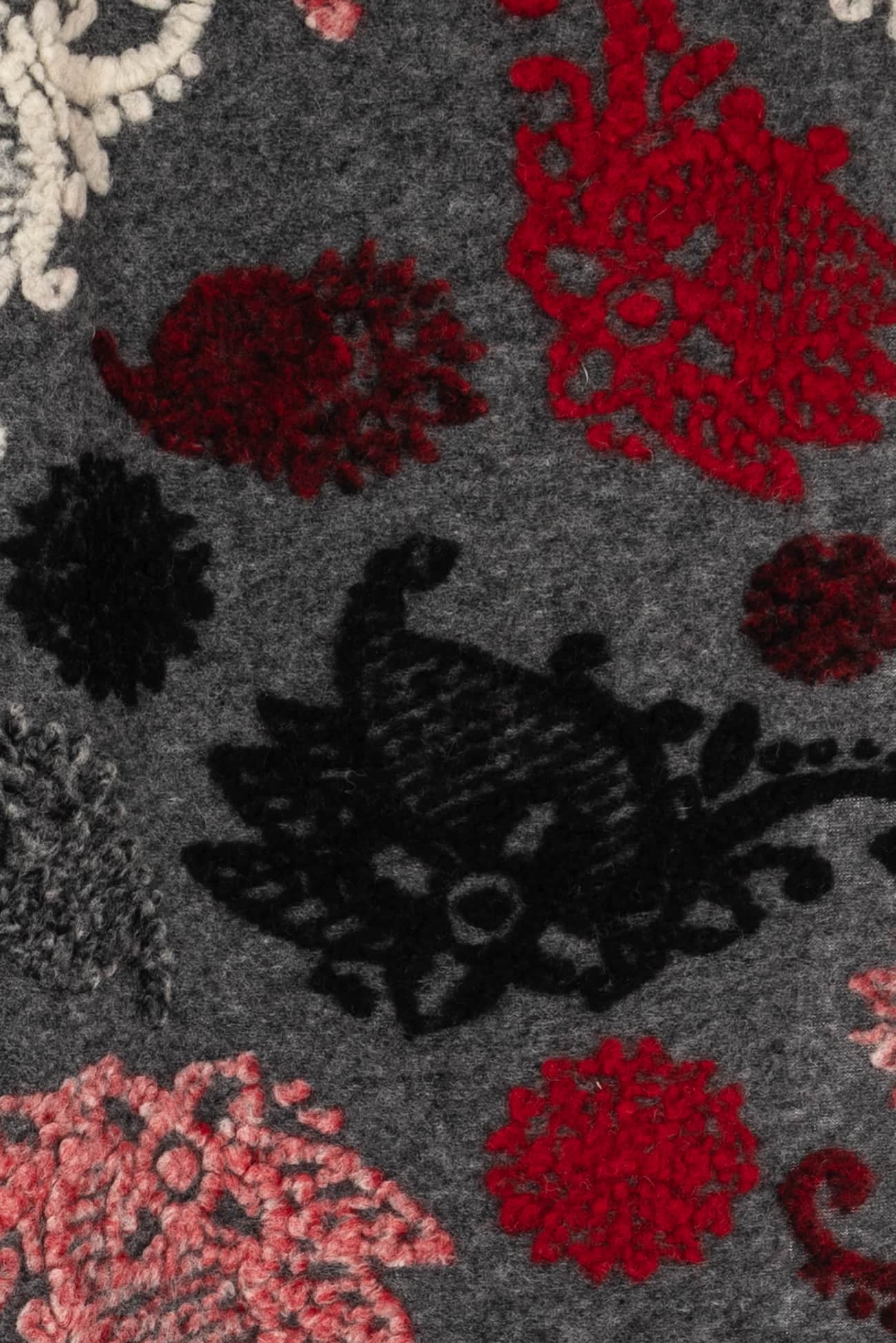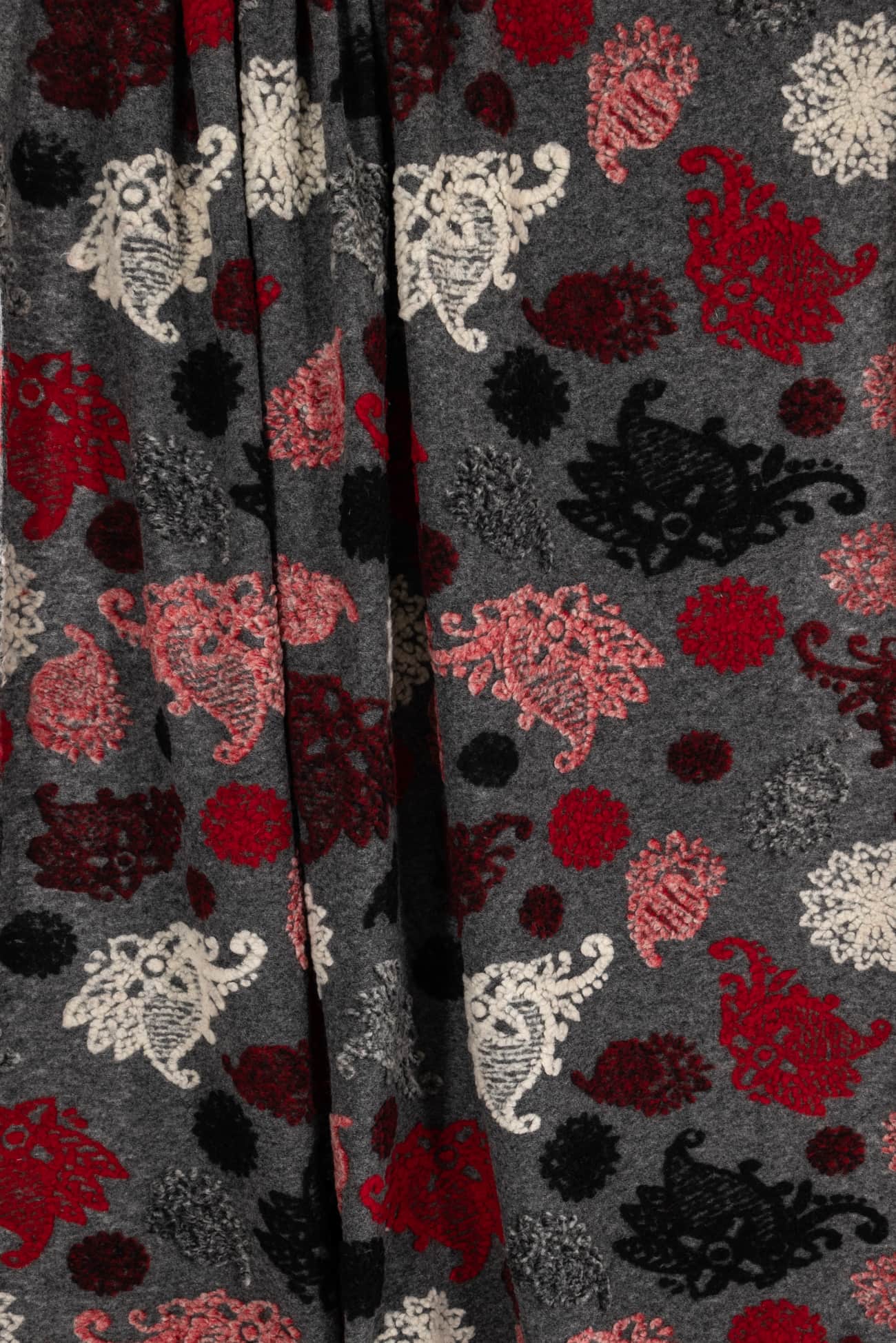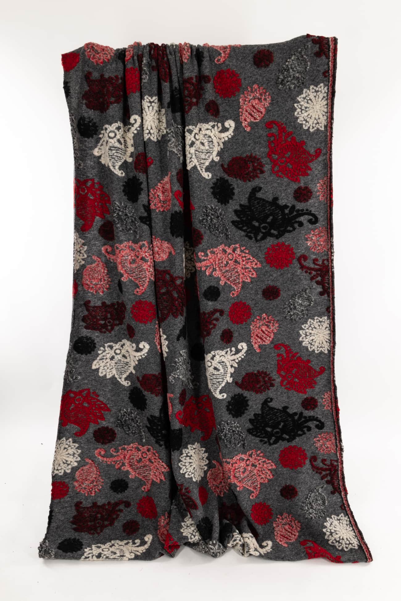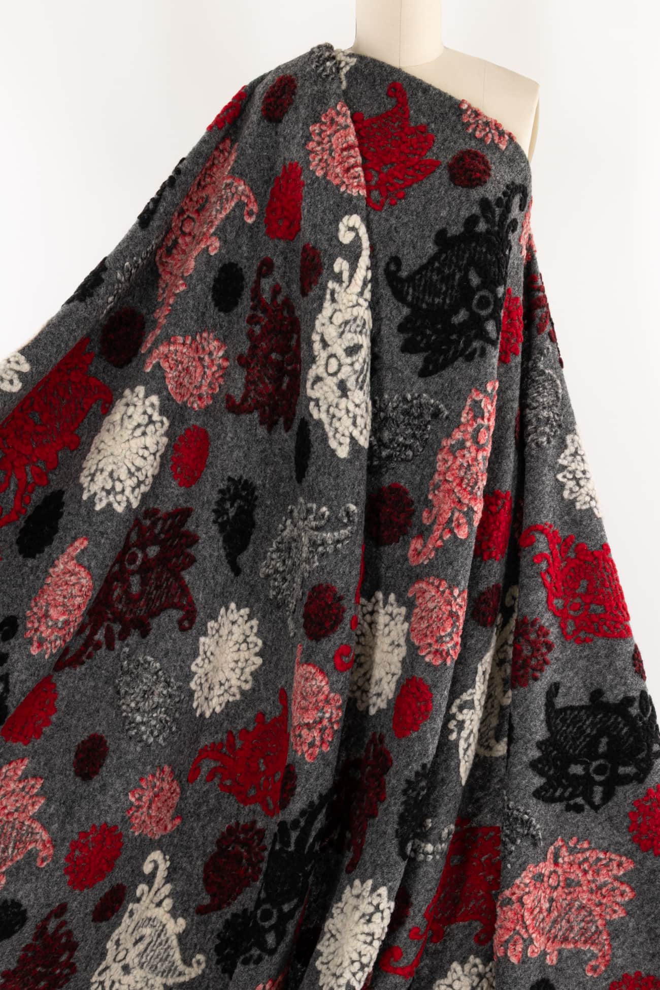 Dramatic wool knit with a burst of stylized dimensional flowers in shades of red, black and white on a gray ground. A uniquely beautiful fabric, it appears felted but is actually produced on specialized knitting looms in an Italian mill. Designer deadstock, a dramatic and richly colored wool knit with a lovely selvedge, 27" repeat and some crosswise stretch. Cozy and soft, with a brushed surface. A touch of rolling at the cut edge - easy to sew, as the cut edge does not ravel, so no seam finish is needed. Airy coating weight with a bit of loft. Right for a coat, jacket, vest, sweater, poncho or accessories
