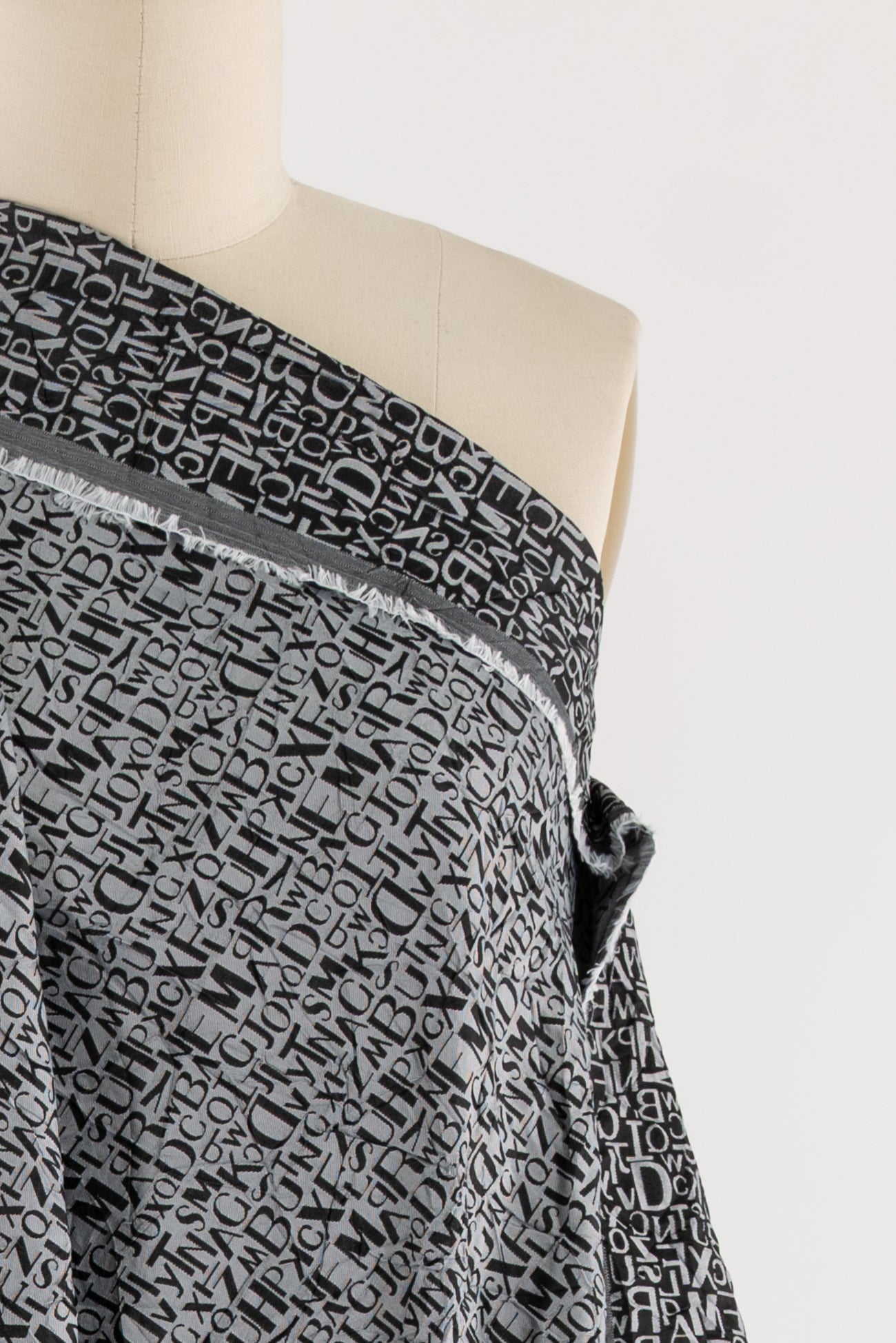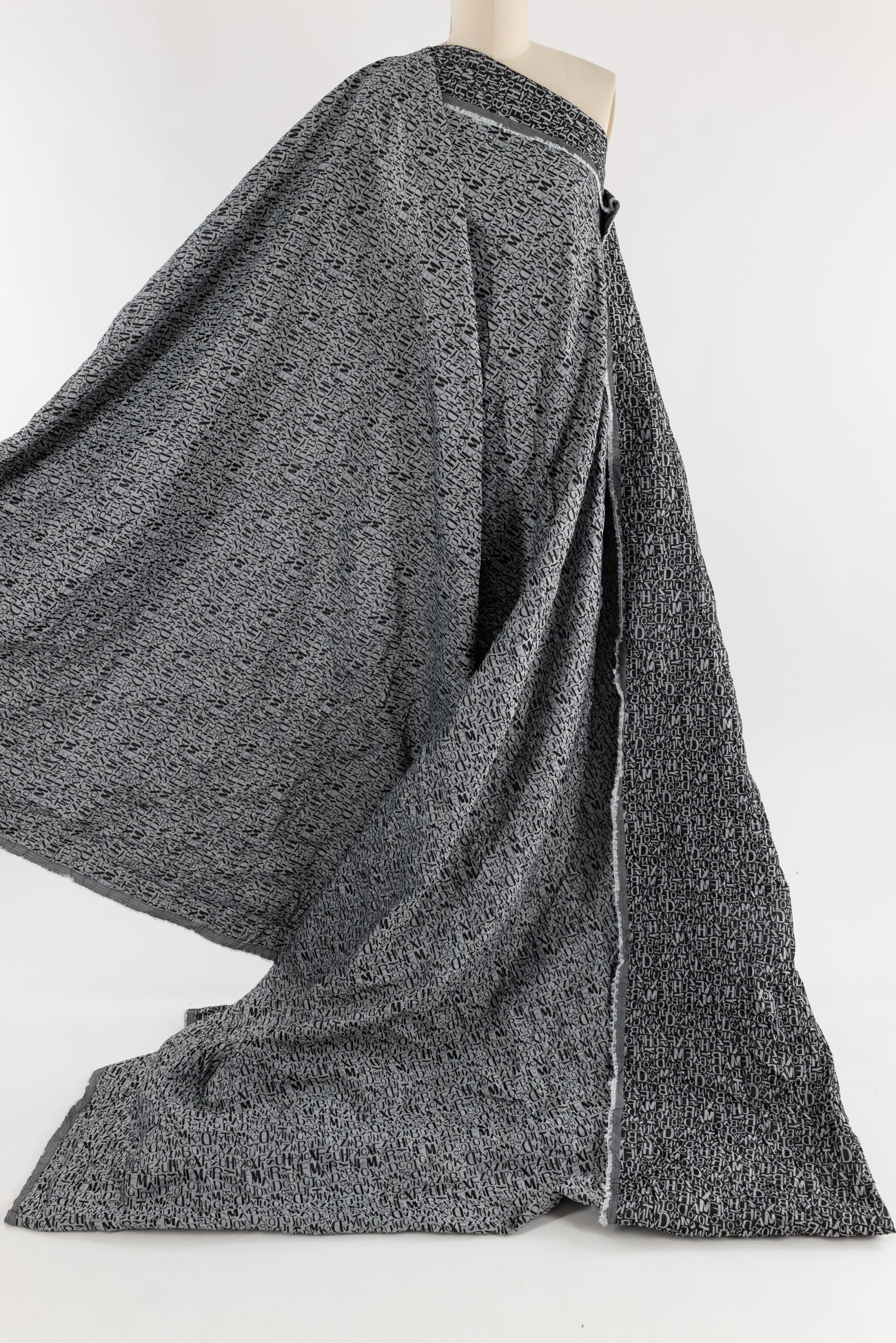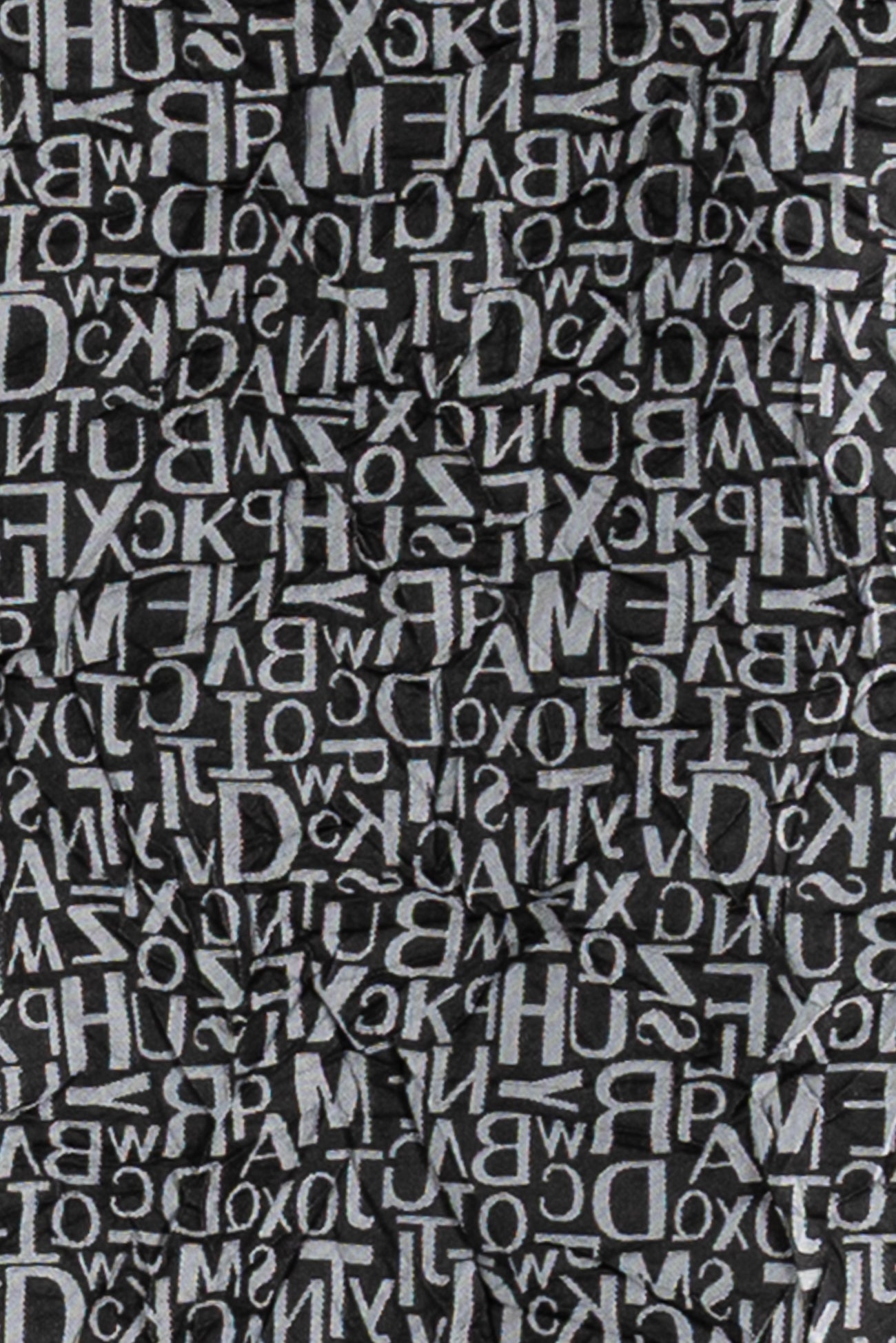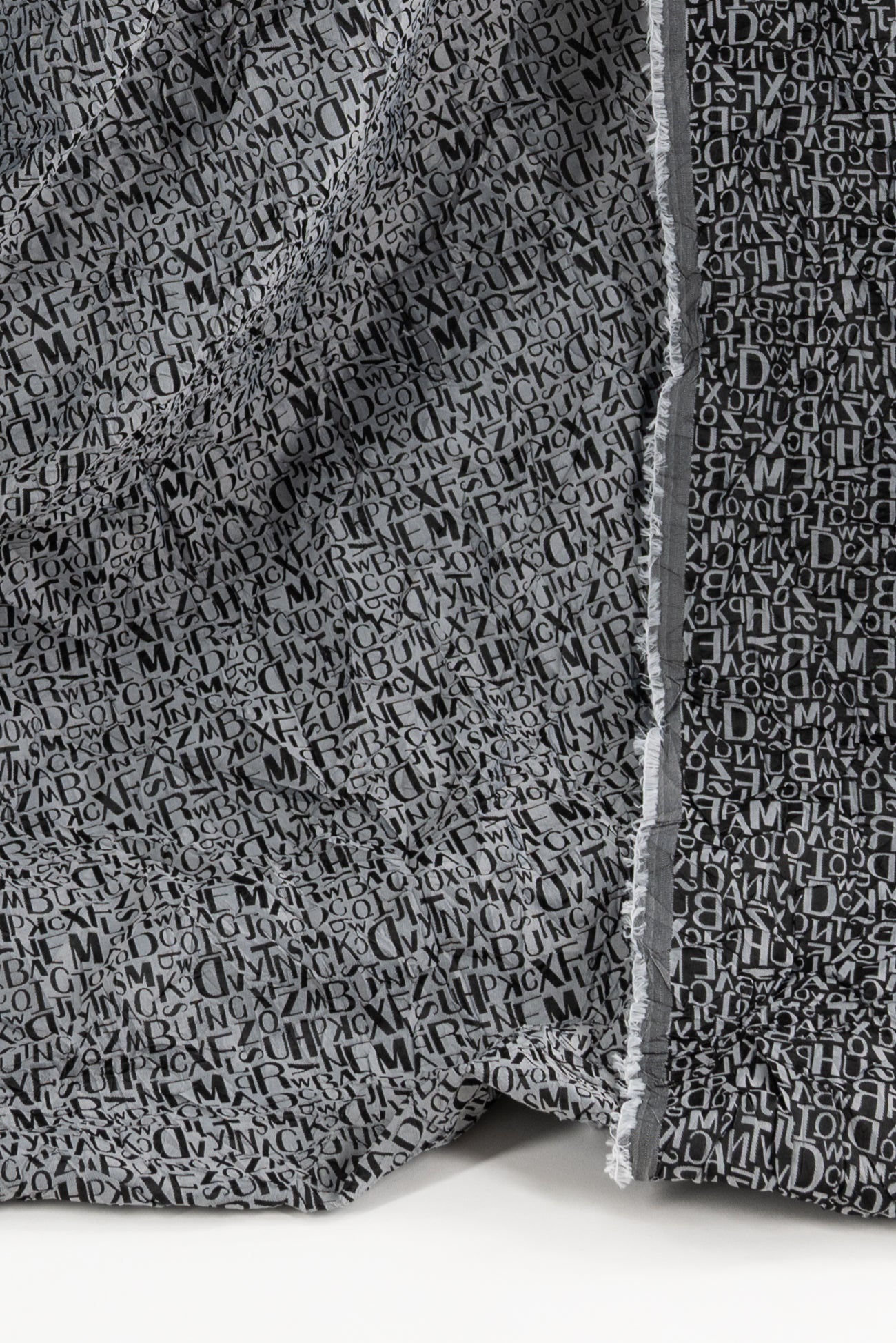 Fab, fun and funky tumbled text in a black and gray viscose/poly jacquard, permanently crinkled deadstock from an LA designer. The pattern is reversible, use either or both sides. Light/mid-weight with a light drape, 16½" repeat and crinkled hand. Right for a dress, shirt, tunic, soft pants, light jacket or duster coat, skirt, vest or kimono.