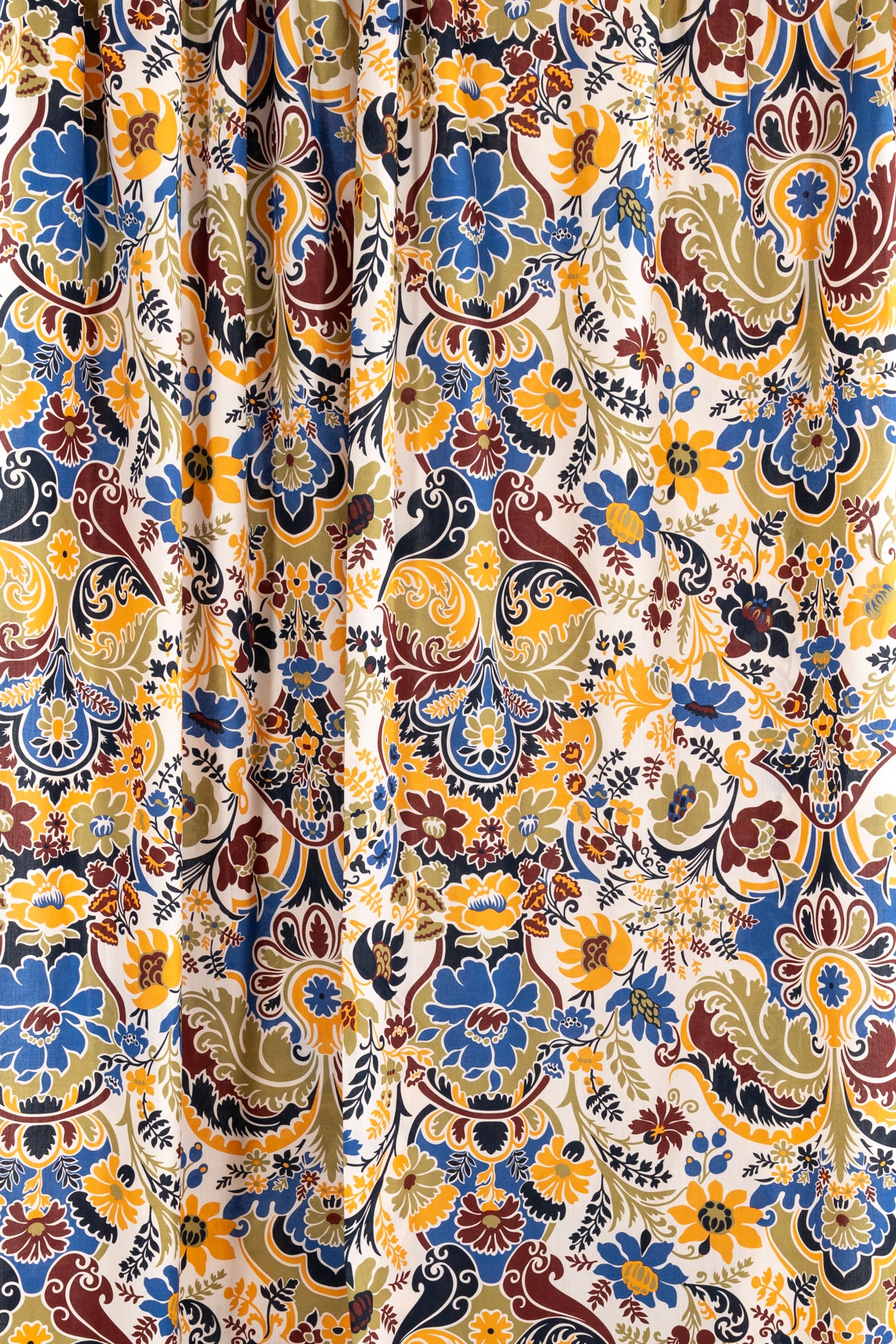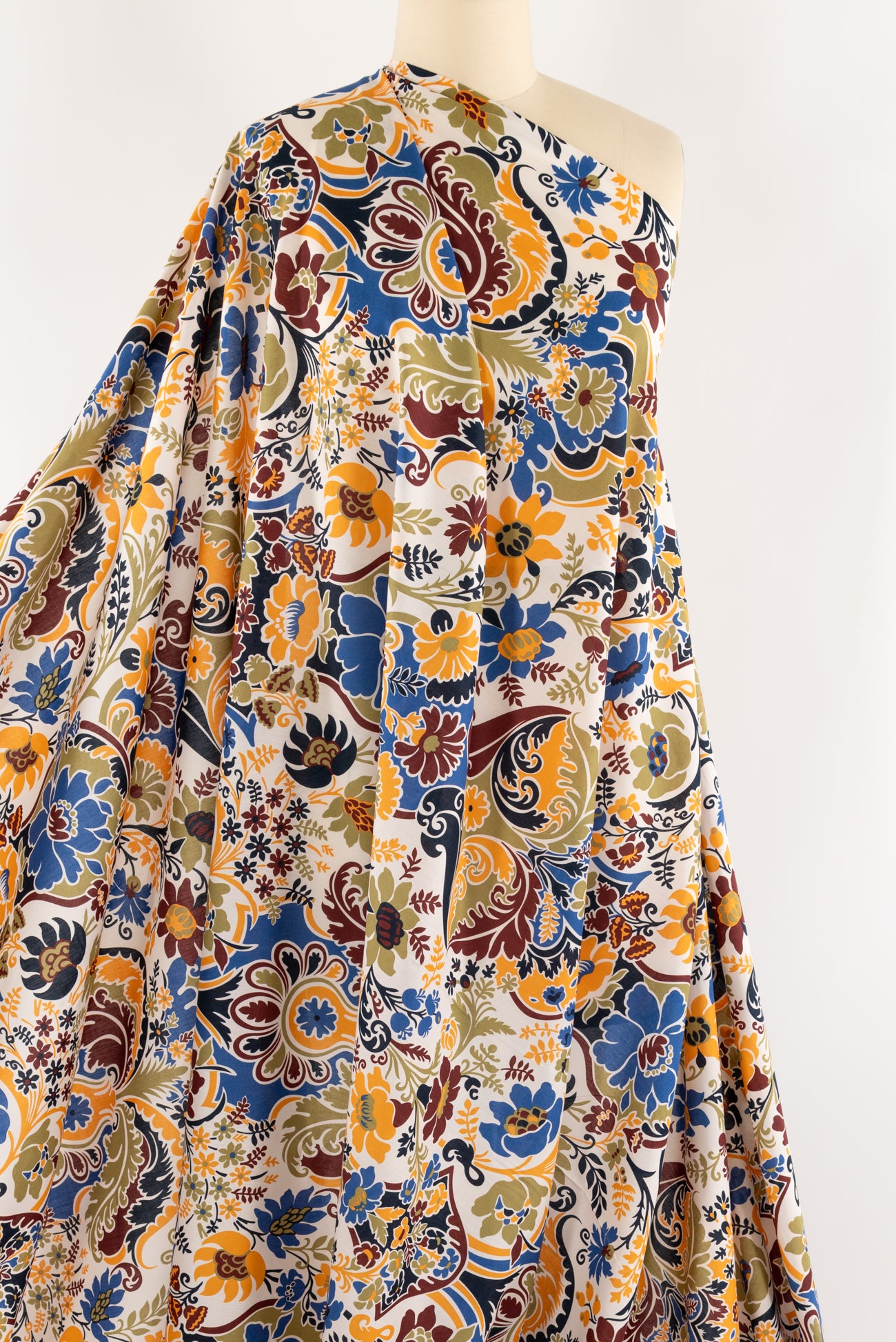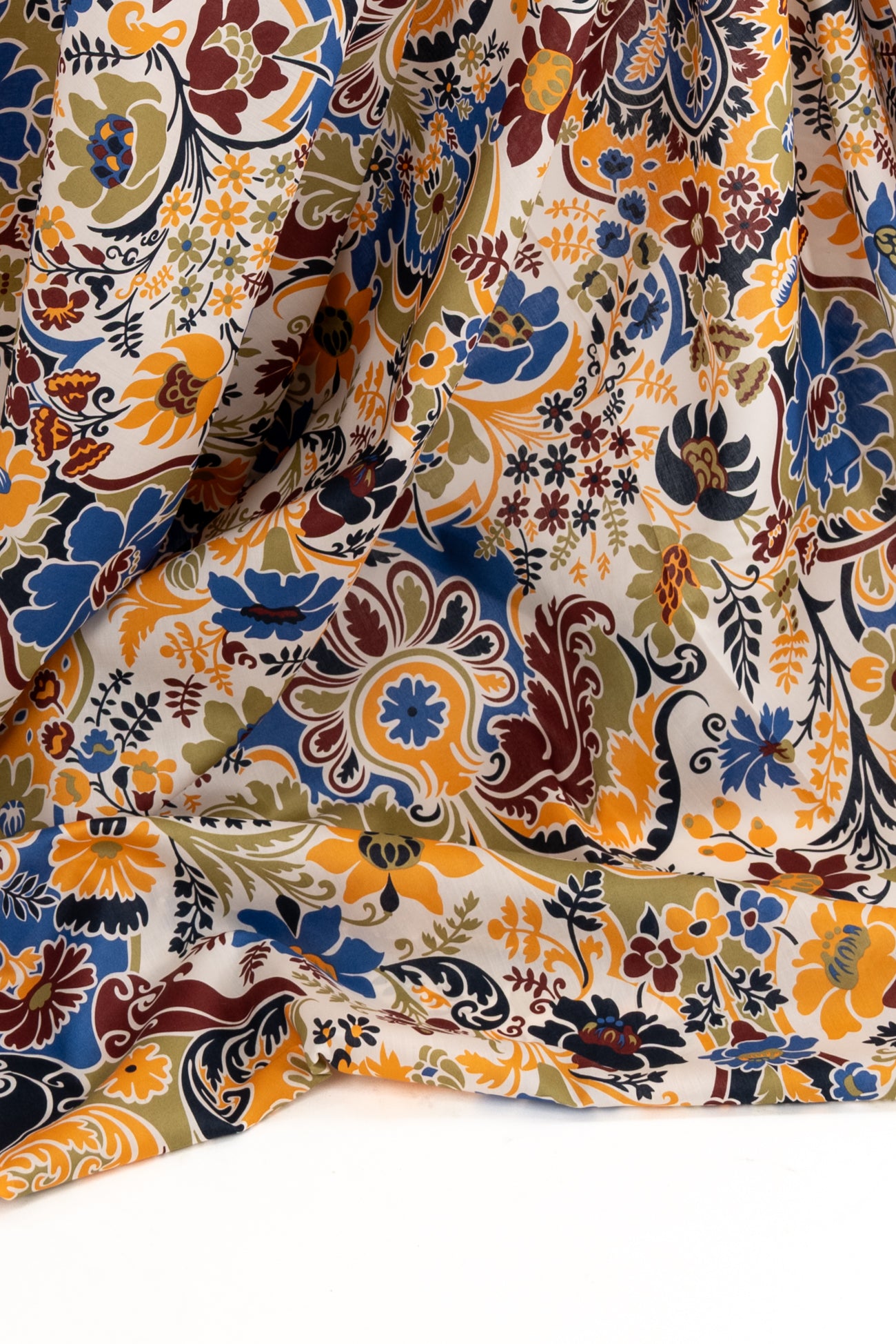 Spirited and stylized leaf and floral motifs in rich colors on parchment, inspired by Liberty's archival studio designs. Produced in Northern Italy for Liberty of London, printed on the renowned and exceptional Tana Lawn, the cotton that behaves and feels like silk. Fine-grained, with a cool, smooth, soft hand, fluid drape and depth of color. Perfect for a shirt, dress, skirt, tunic, caftan, loungewear, children's, accessories, or home decor. Right to wear everyday or for statement pieces. One-way design, 24½" repeat. OEKO-TEX® certified.