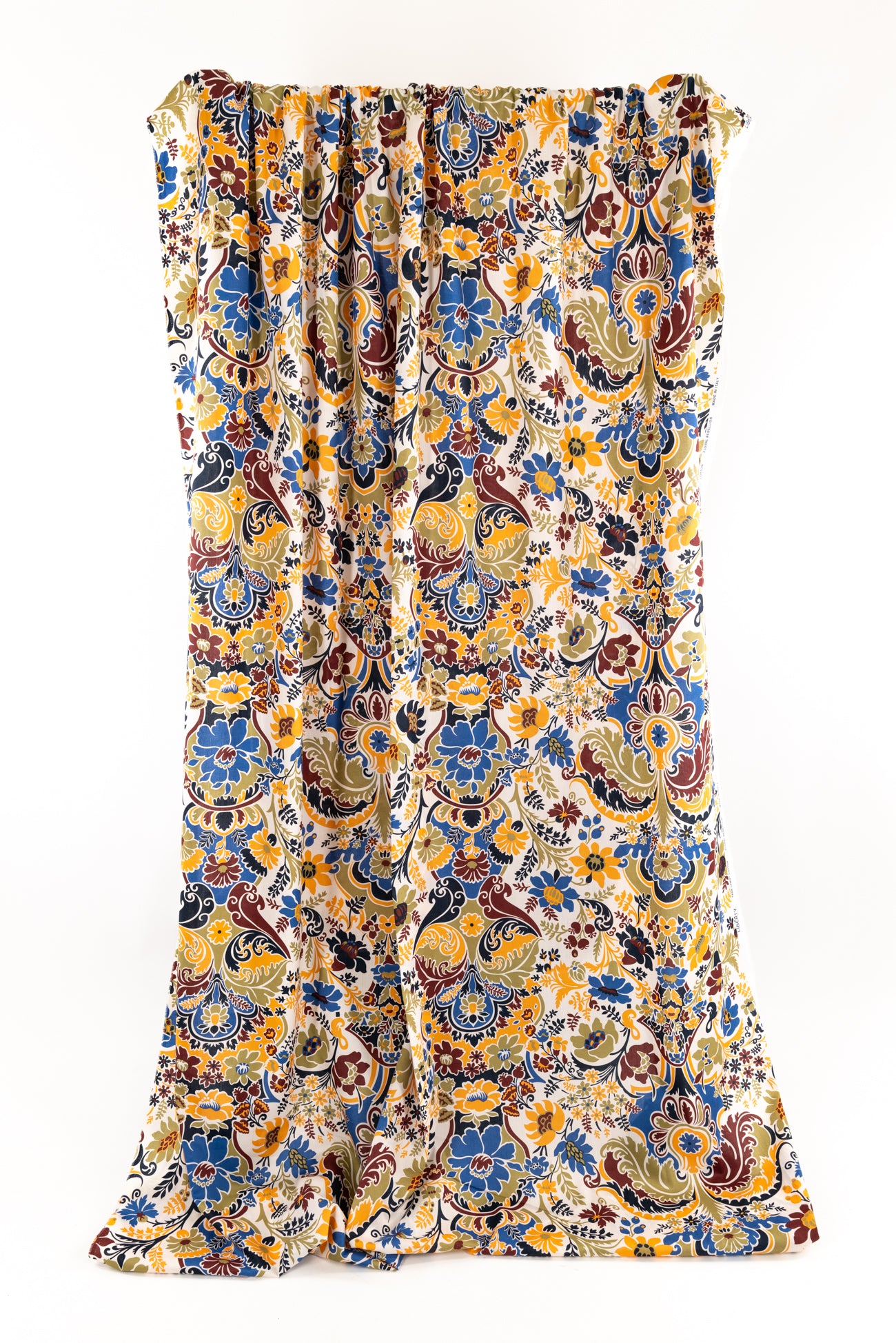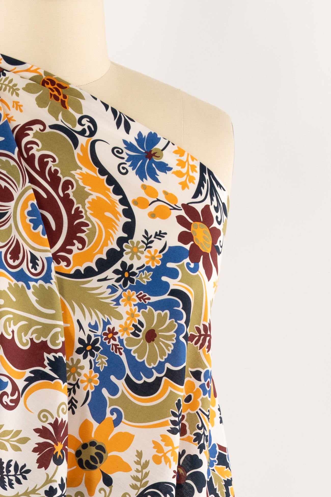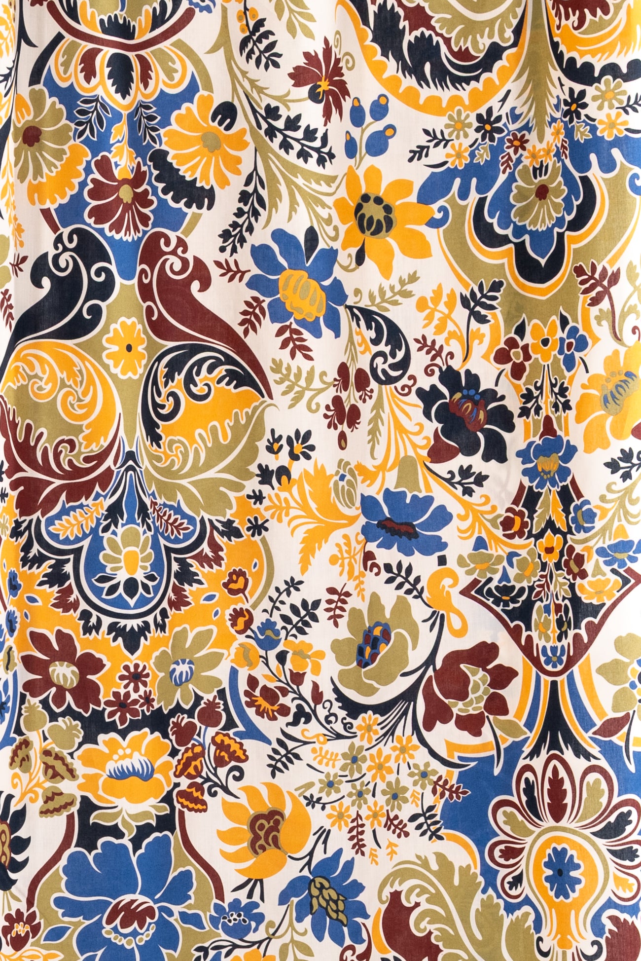 Spirited and stylized leaf and floral motifs in rich colors on parchment, inspired by Liberty's archival studio designs. Produced in Northern Italy for Liberty of London, printed on the renowned and exceptional Tana Lawn, the cotton that behaves and feels like silk. Fine-grained, with a cool, smooth, soft hand, fluid drape and depth of color. Perfect for a shirt, dress, skirt, tunic, caftan, loungewear, children's, accessories, or home decor. Right to wear everyday or for statement pieces. One-way design, 24½" repeat. OEKO-TEX® certified.