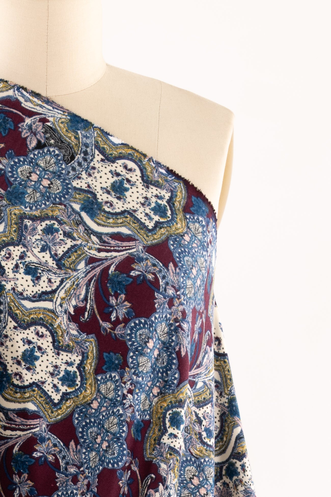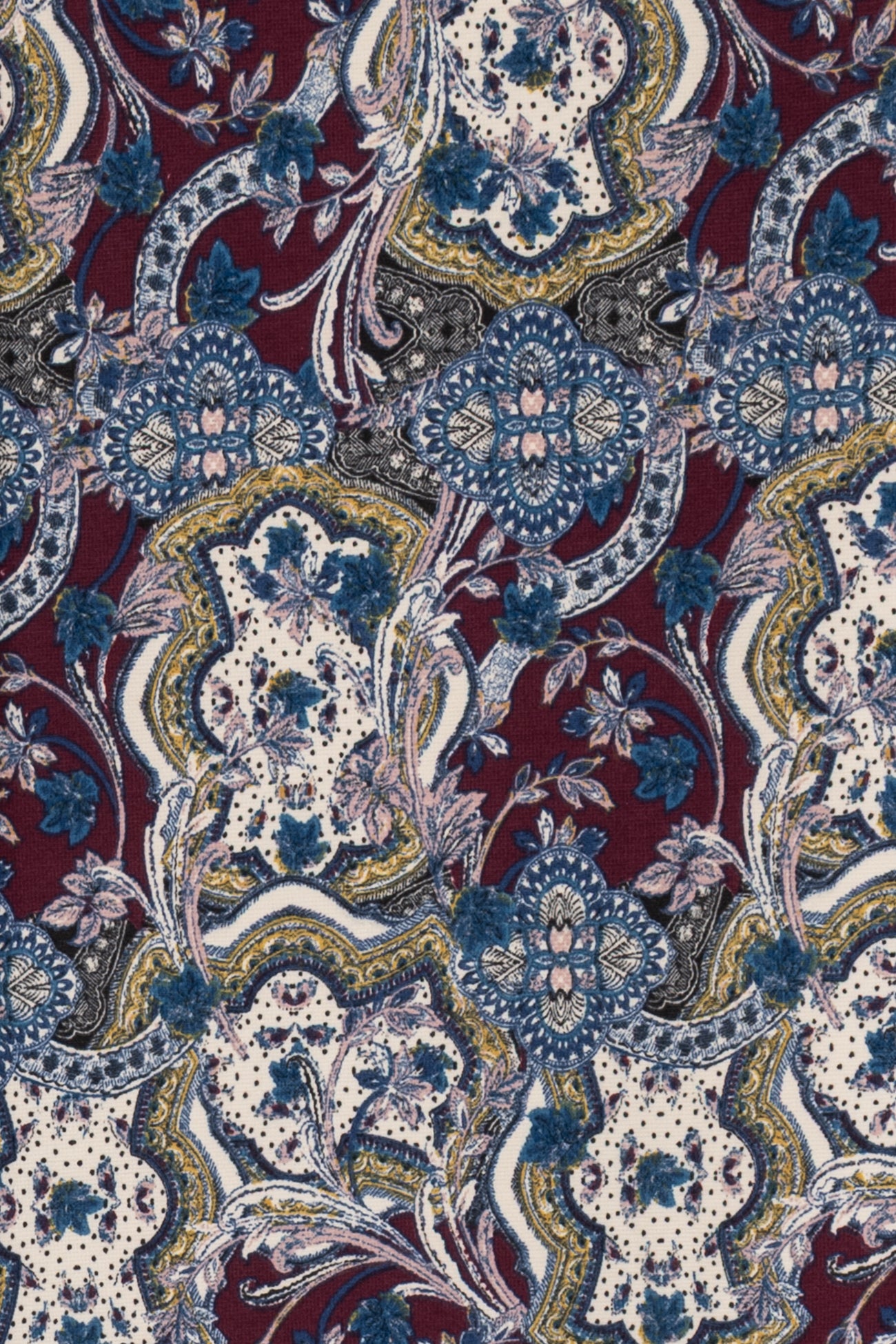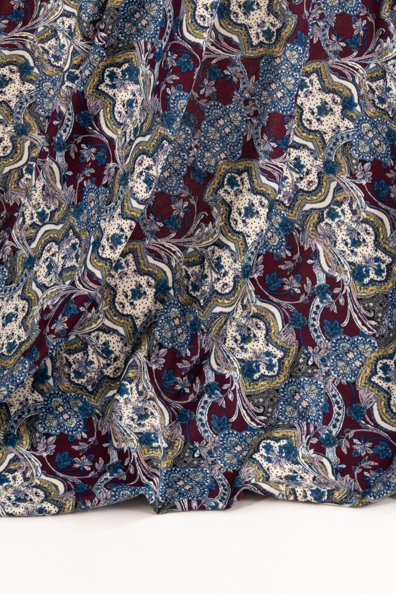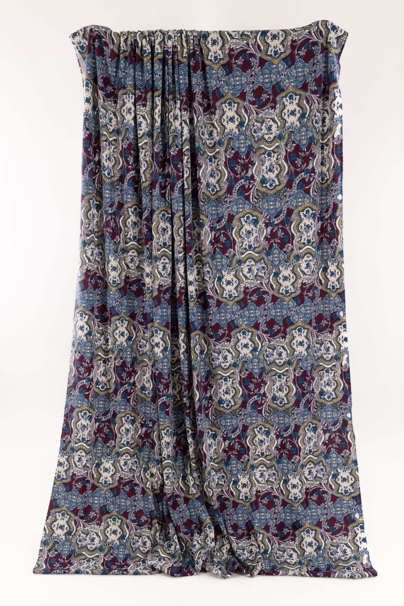Modern interpretation of a classic design interpreted in blue, pink, burgundy, etched with black on warm white, deadstock from LA designer, Novella Royale (who recently closed their 16 year business). Beautiful quality and weight rayon/spandex jersey - has just a touch more weight than most, opaque, with a soft, smooth, matte hand, 4 way stretch, minimal rolling at the cut edge. Right for a dress, skirt, tunic, t-shirt, soft pants, leggings, caftan, kimono, jumpsuit. One way design, 26" repeat.