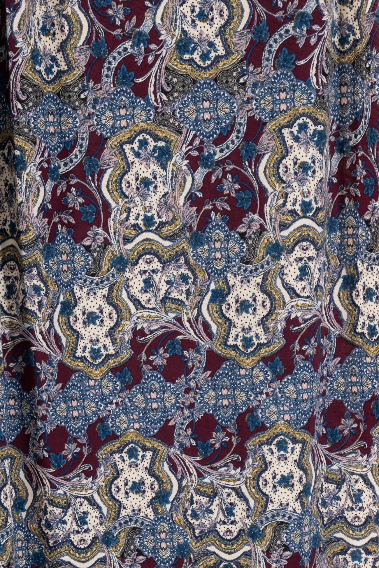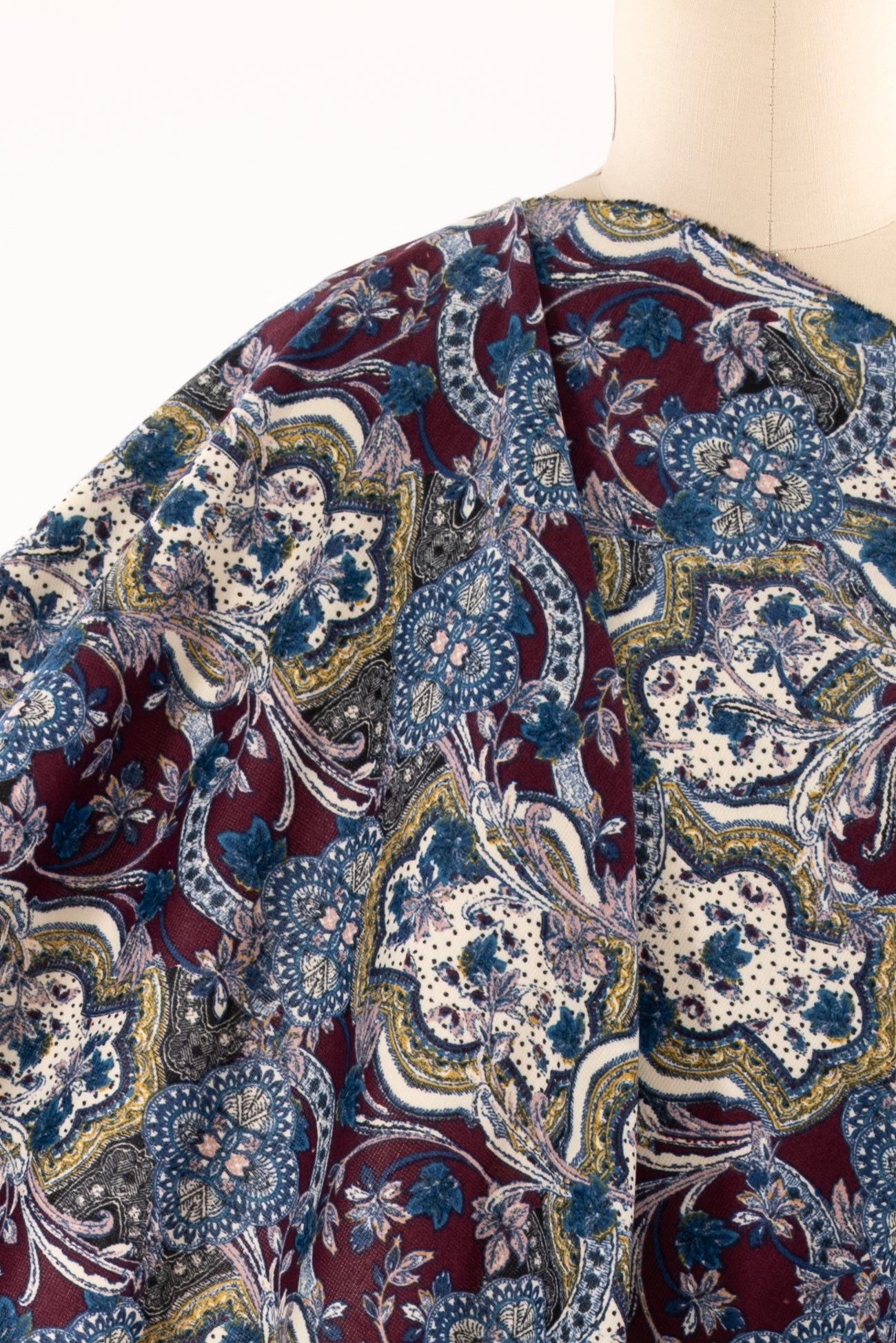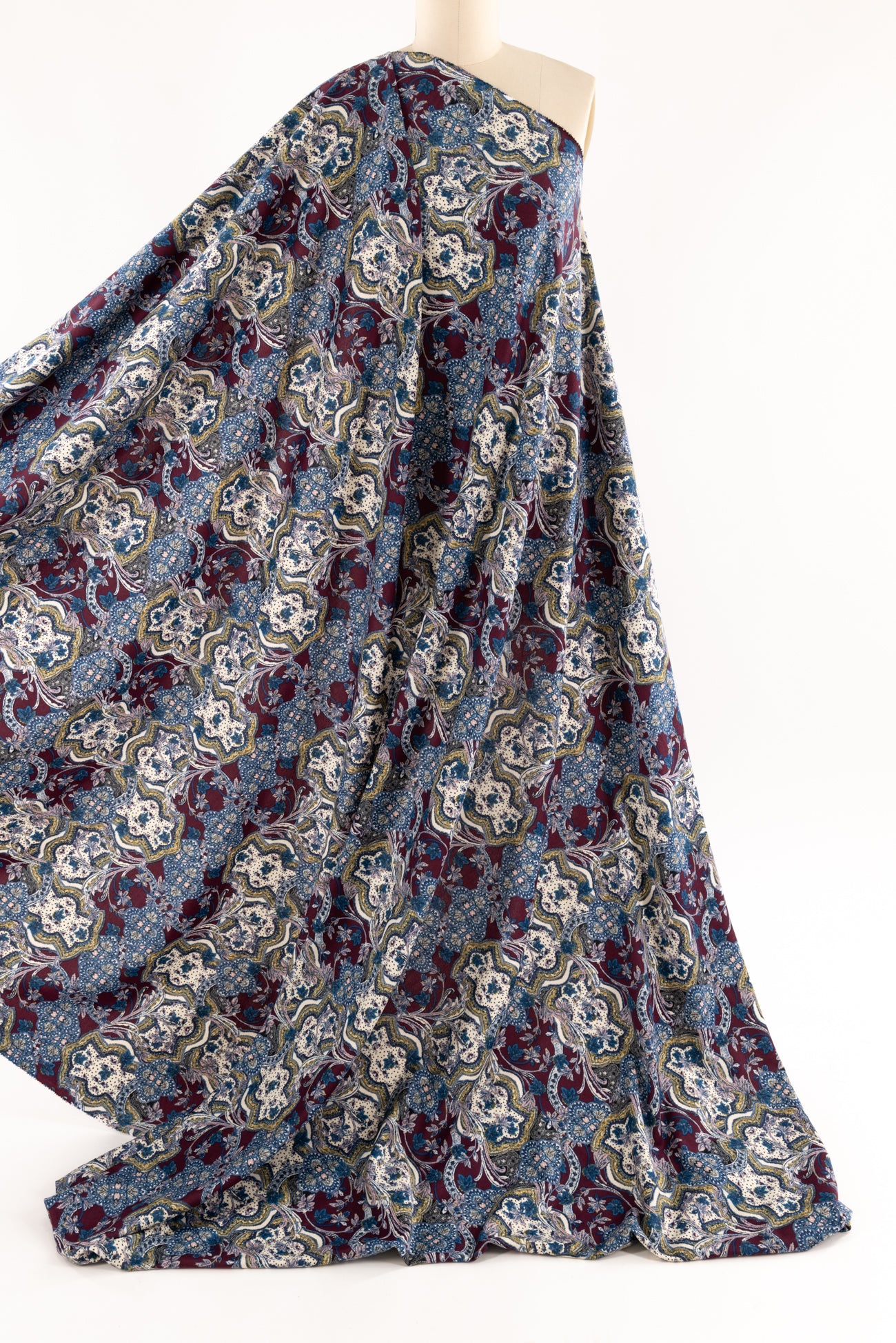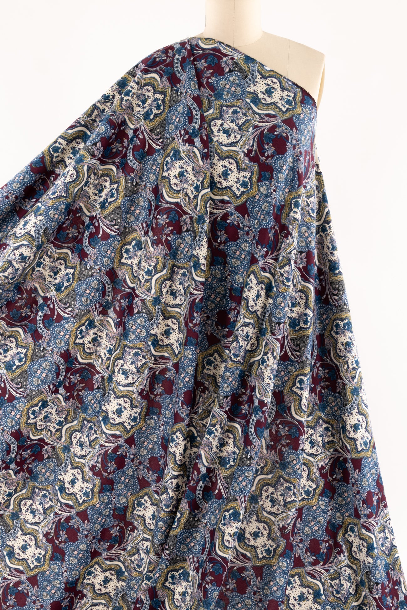 Modern interpretation of a classic design interpreted in blue, pink, burgundy, etched with black on warm white, deadstock from LA designer, Novella Royale (who recently closed their 16 year business). Beautiful quality and weight rayon/spandex jersey - has just a touch more weight than most, opaque, with a soft, smooth, matte hand, 4 way stretch, minimal rolling at the cut edge. Right for a dress, skirt, tunic, t-shirt, soft pants, leggings, caftan, kimono, jumpsuit. One way design, 26" repeat.