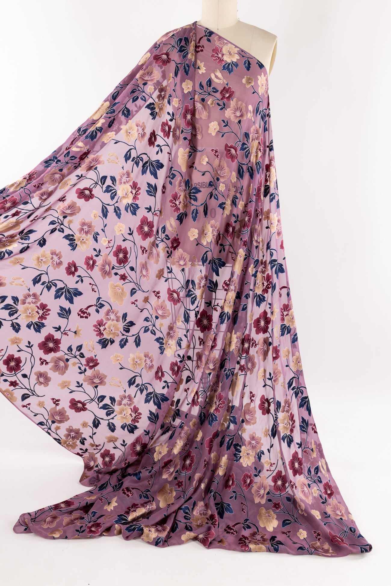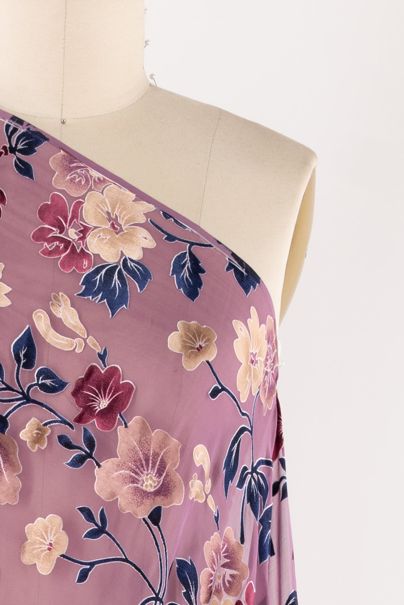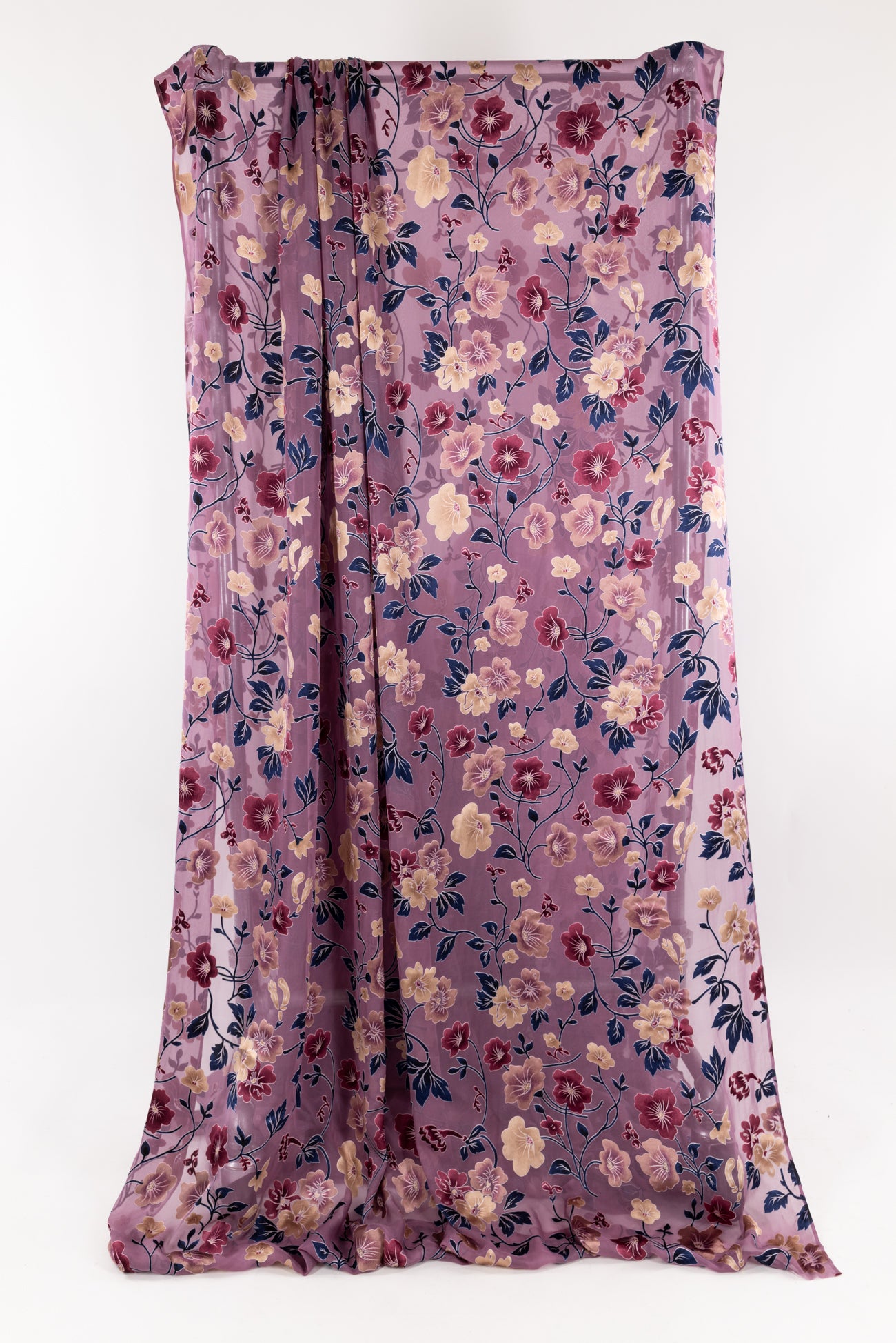Romantic silk burnout floral in shades of plum, navy and champagne on mauve. Lovely deadstock is a lightweight very flat panné velvet, sheer in the burnout areas, with a soft hand, 18" repeat and supple drape. To line or use as an overlay. Right for a dress, shirt, skirt, light jacket, kimono.
