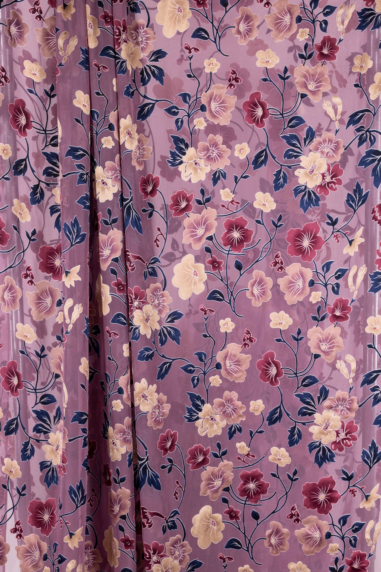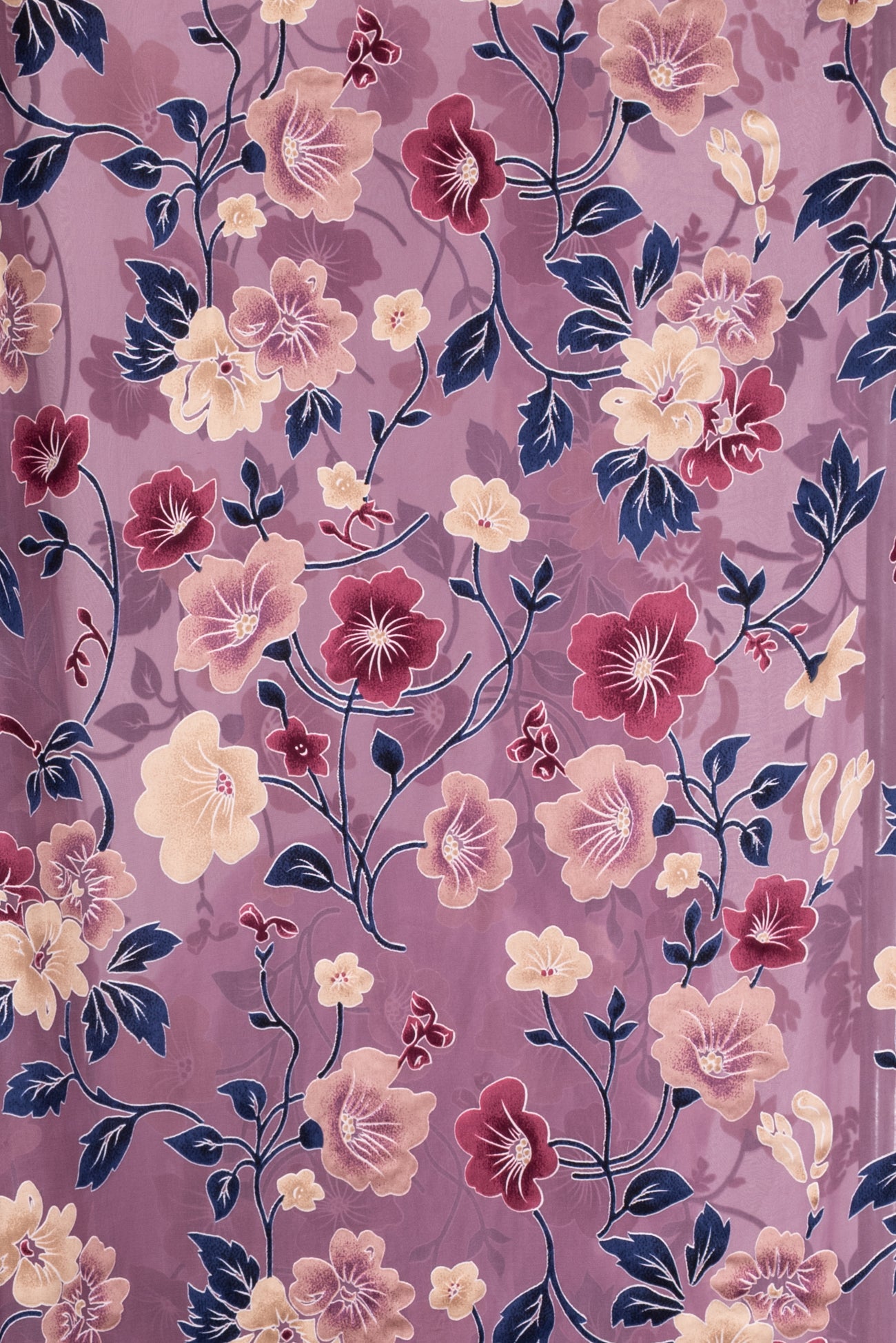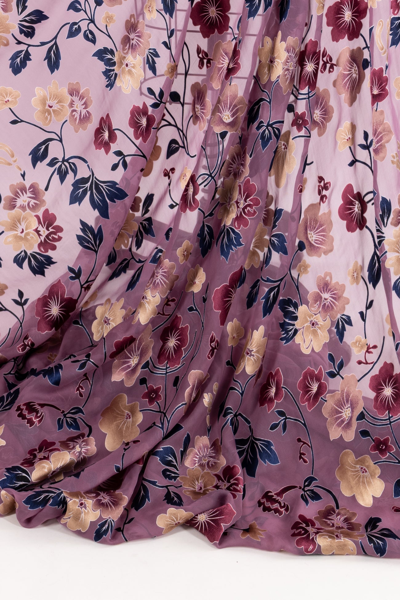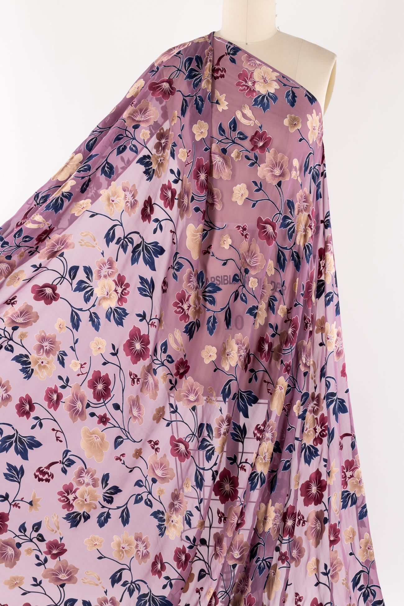 Romantic silk burnout floral in shades of plum, navy and champagne on mauve. Lovely deadstock is a lightweight very flat panné velvet, sheer in the burnout areas, with a soft hand, 18" repeat and supple drape. To line or use as an overlay. Right for a dress, shirt, skirt, light jacket, kimono.