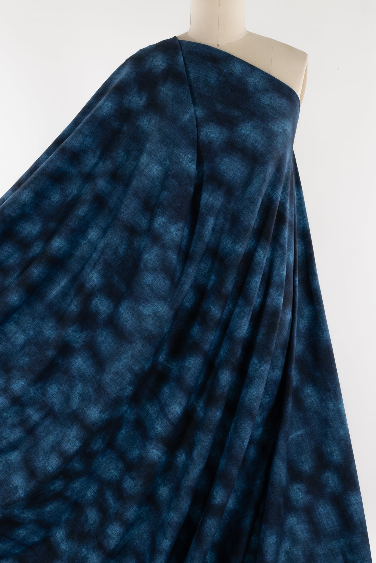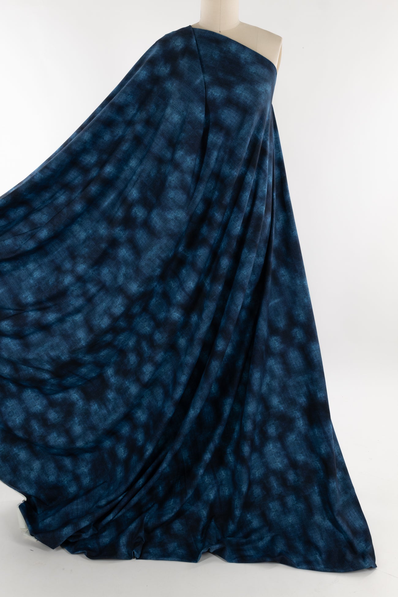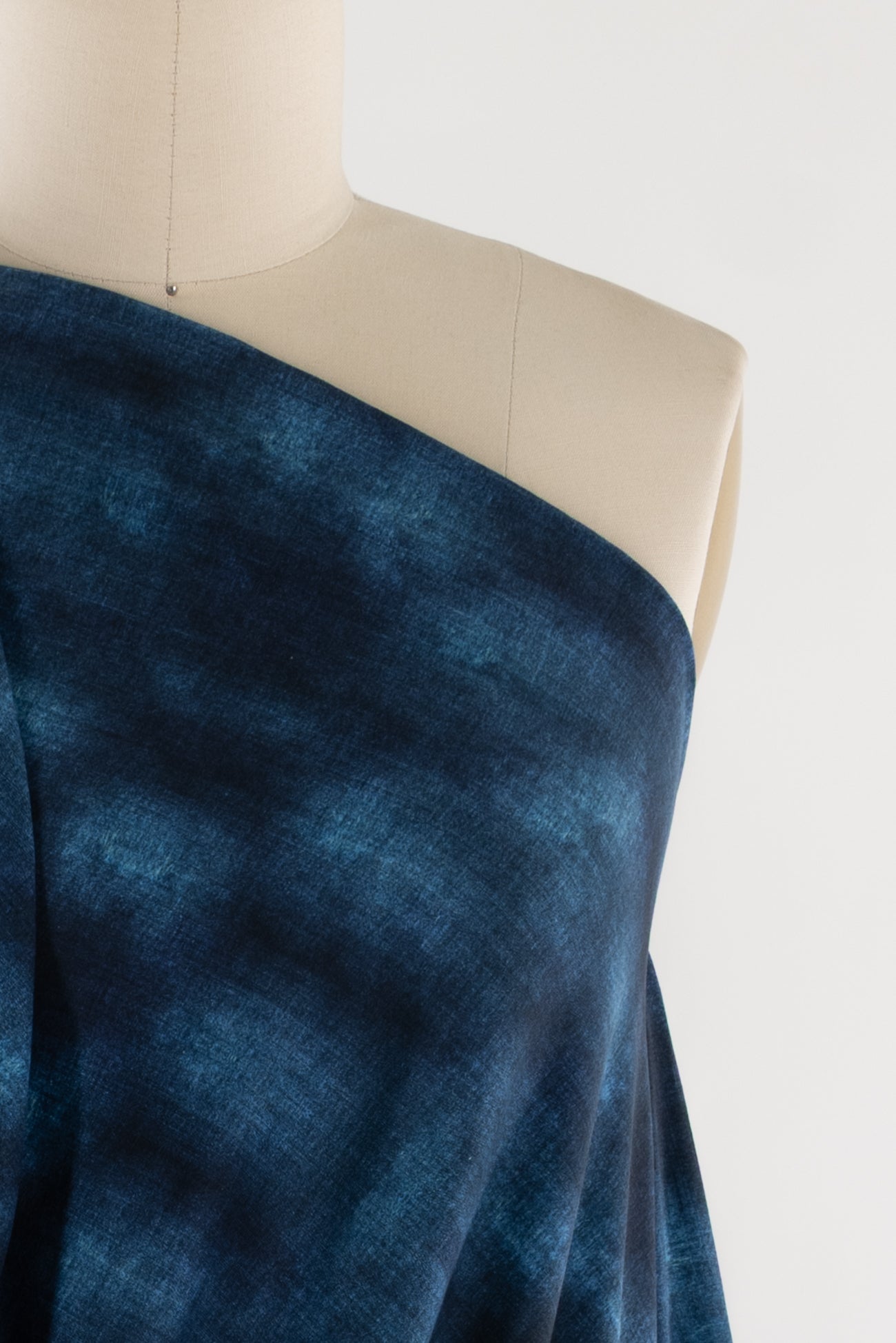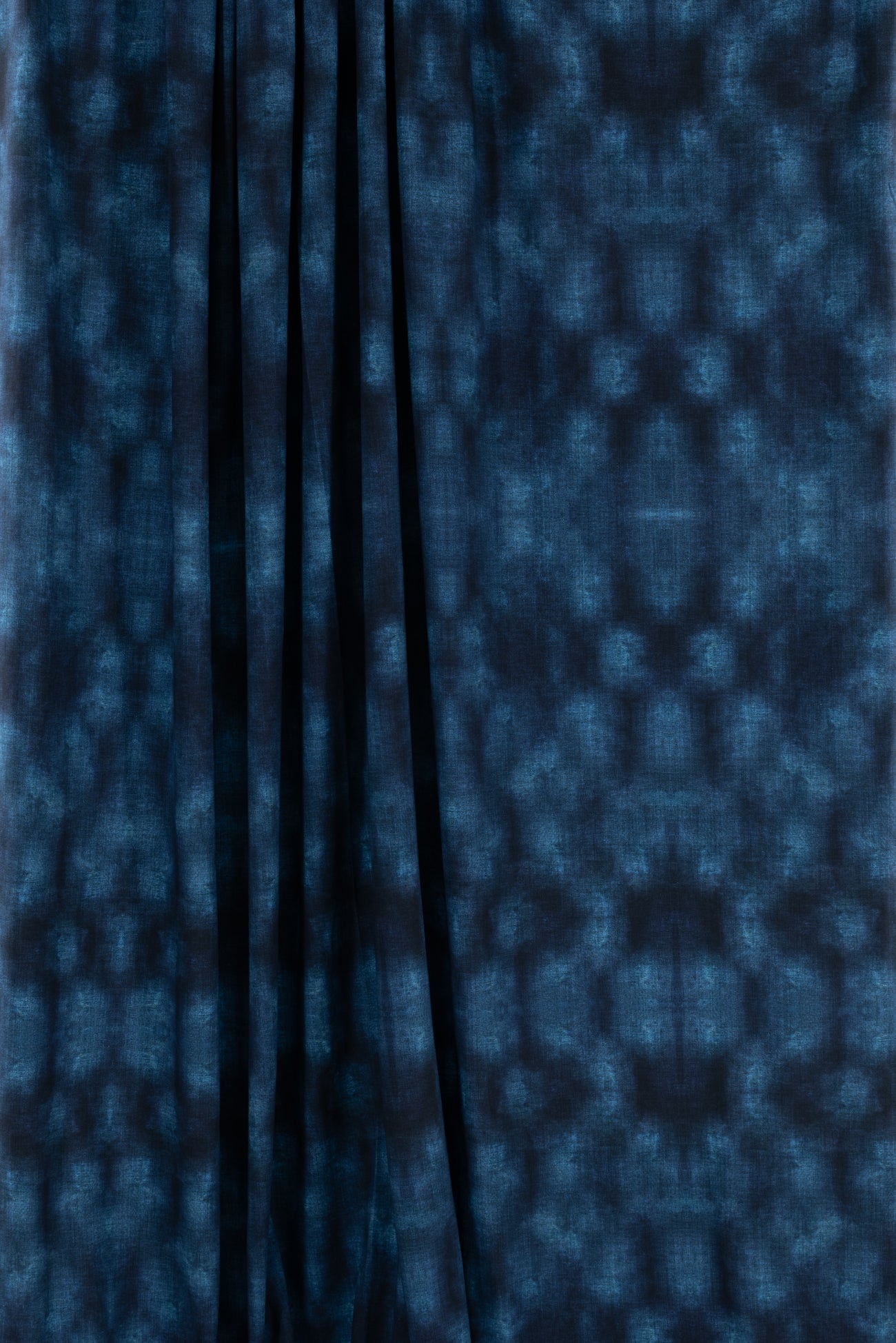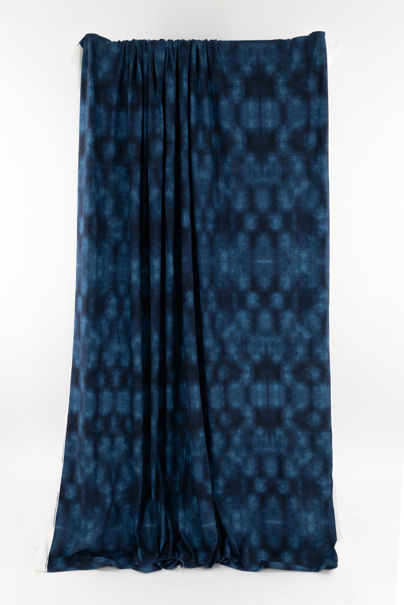 Blue on blue ombré - softly edged shifting shapes, in shades dark and light, digitally printed on luxurious cotton knit jersey from the Netherlands. Impeccable quality, light/mid-weight, opaque, with a flattering body-skimming flow, appealing soft hand, fluid drape, crosswise stretch, some lengthwise stretch, a 19½" repeat, and some rolling at the cut edge. Ideal for a wide range of garments, t-shirt, tunic, dress, skirt, soft pants, loungewear, caftan, kimono, men's, or children's. Oeko-Tex® certified.