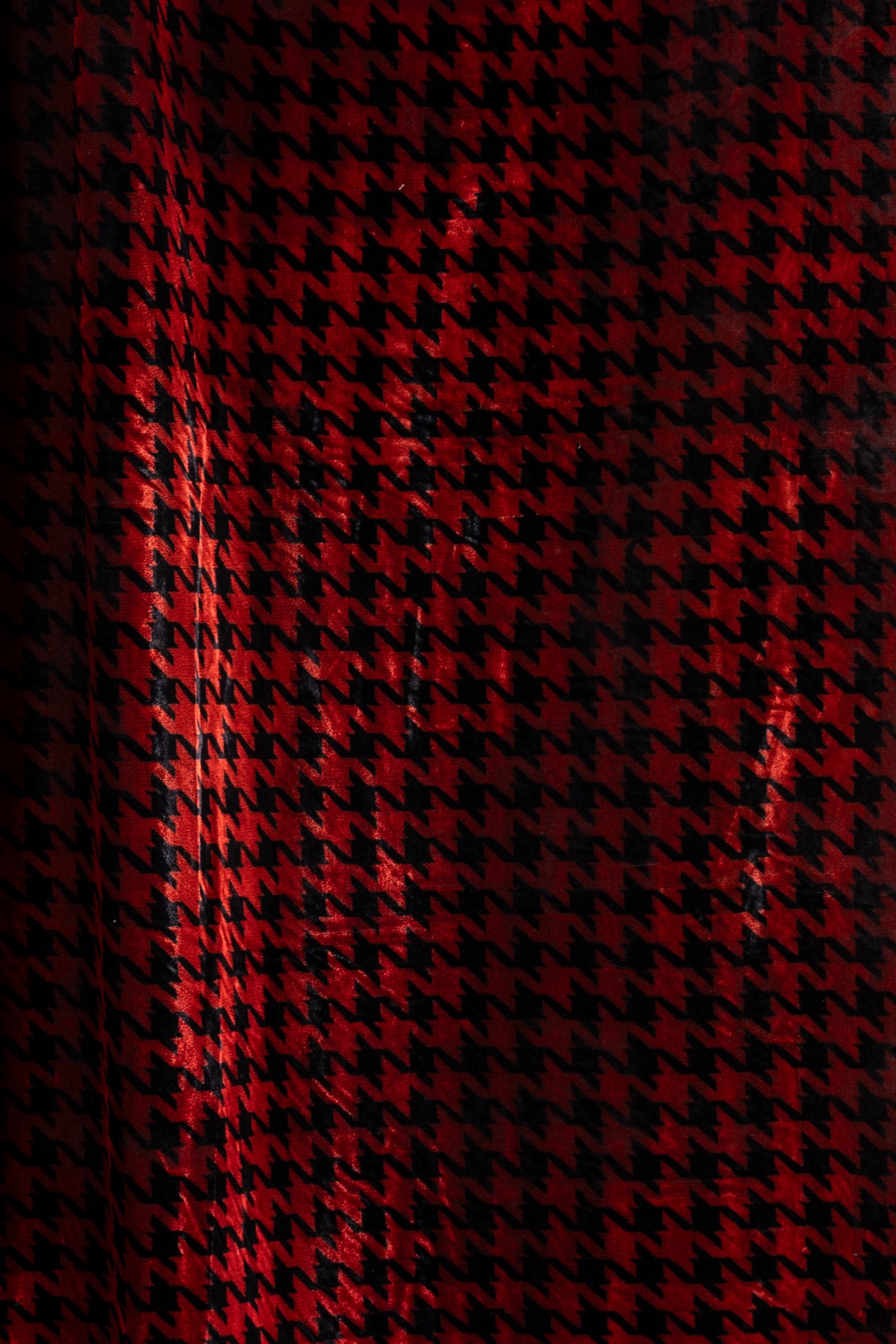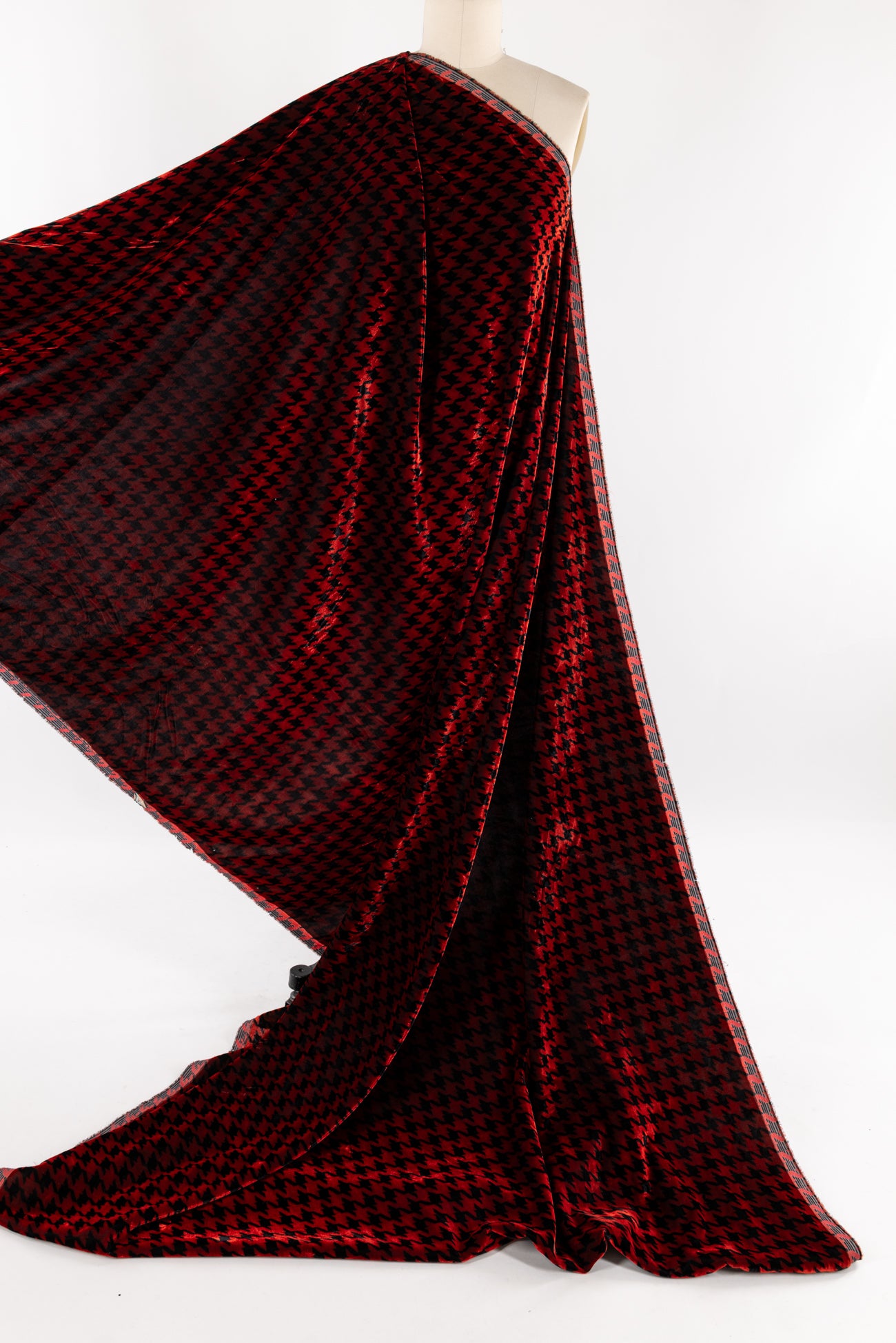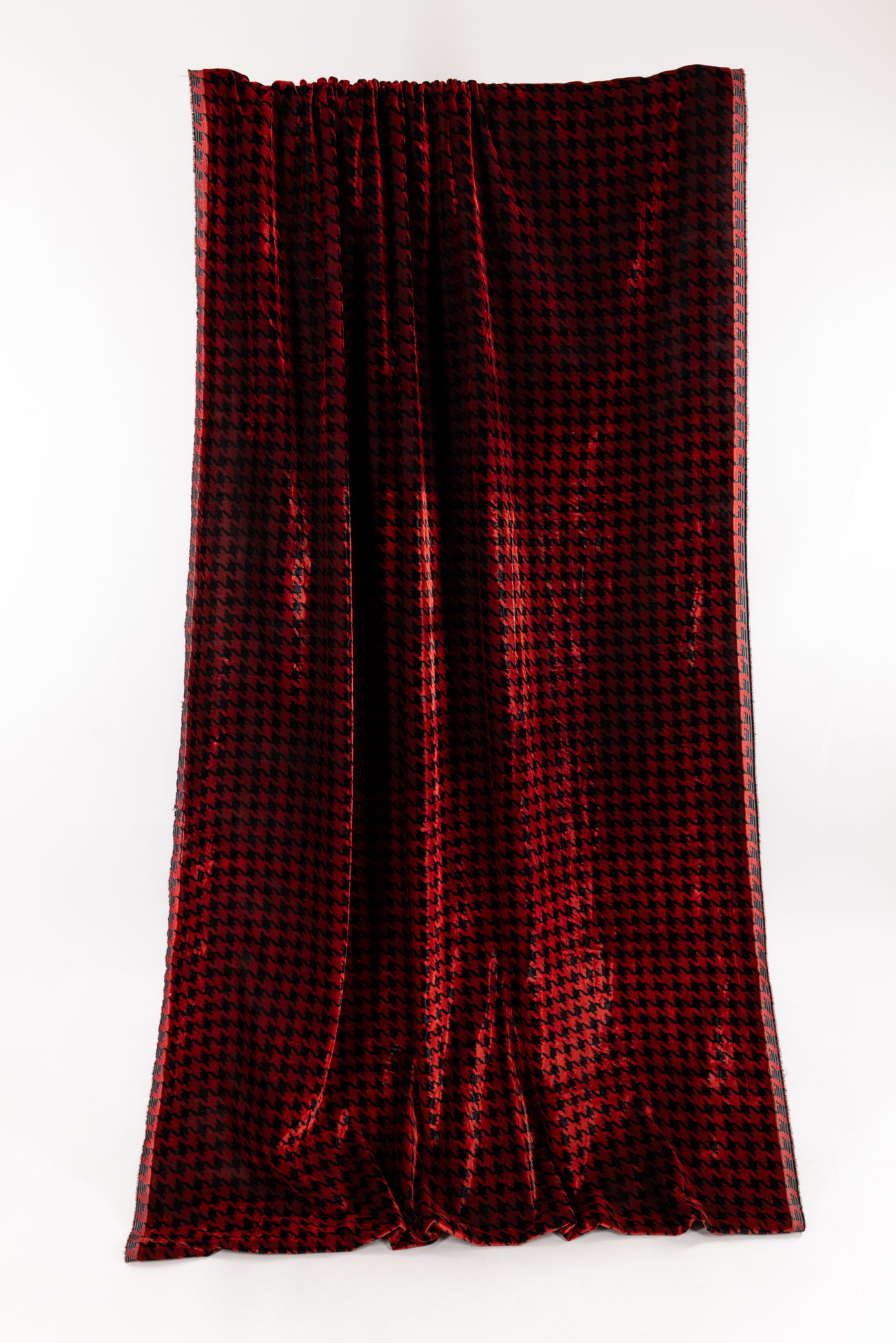 Elegant bittersweet and black houndstooth rayon velvet woven. Fine quality deadstock from a southern California designer. Light/mid-weight with a soft plush hand, 1" repeat and soft supple drape. Right for a dress, shirt, tunic, soft pant, cardi, jacket or loungewear.