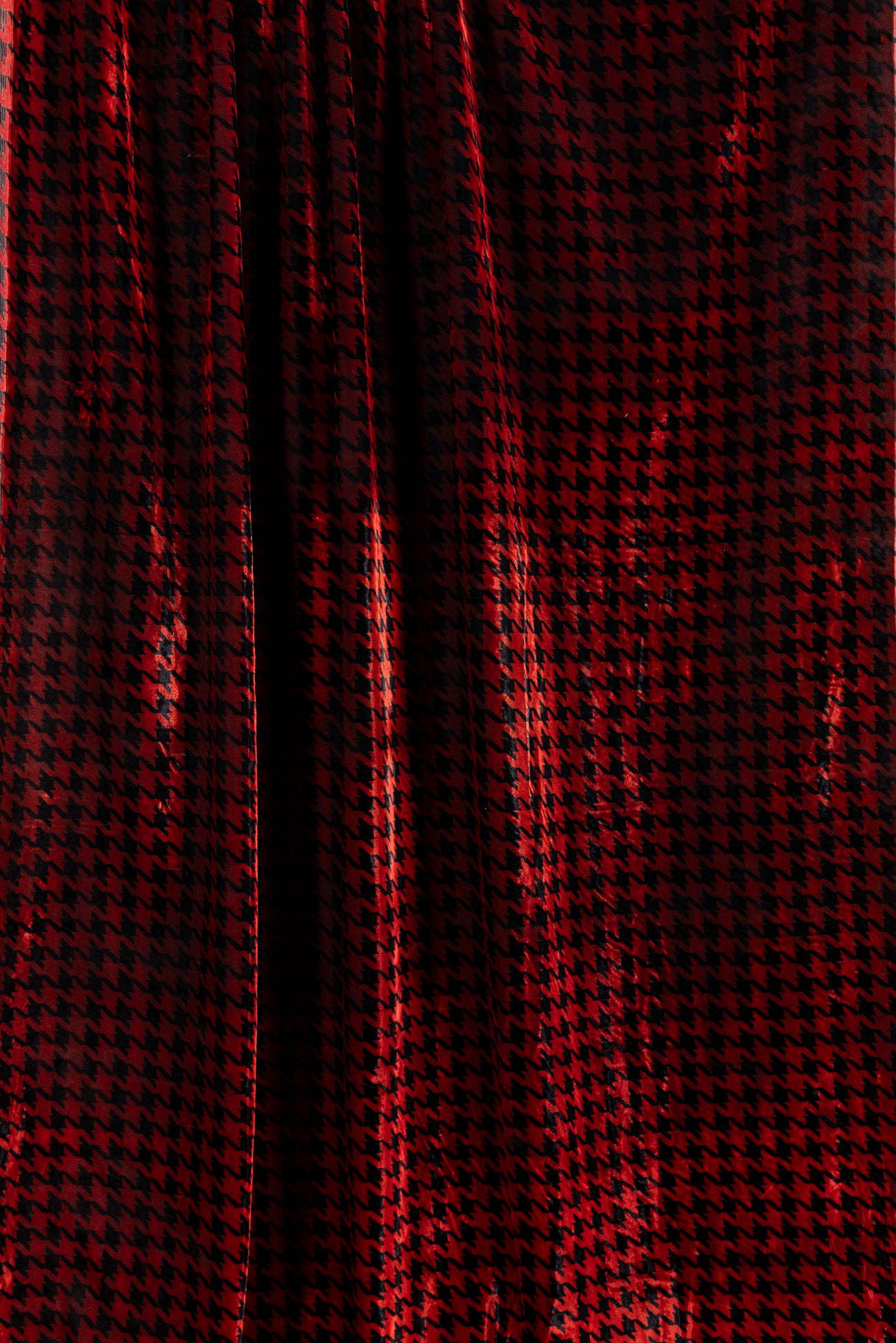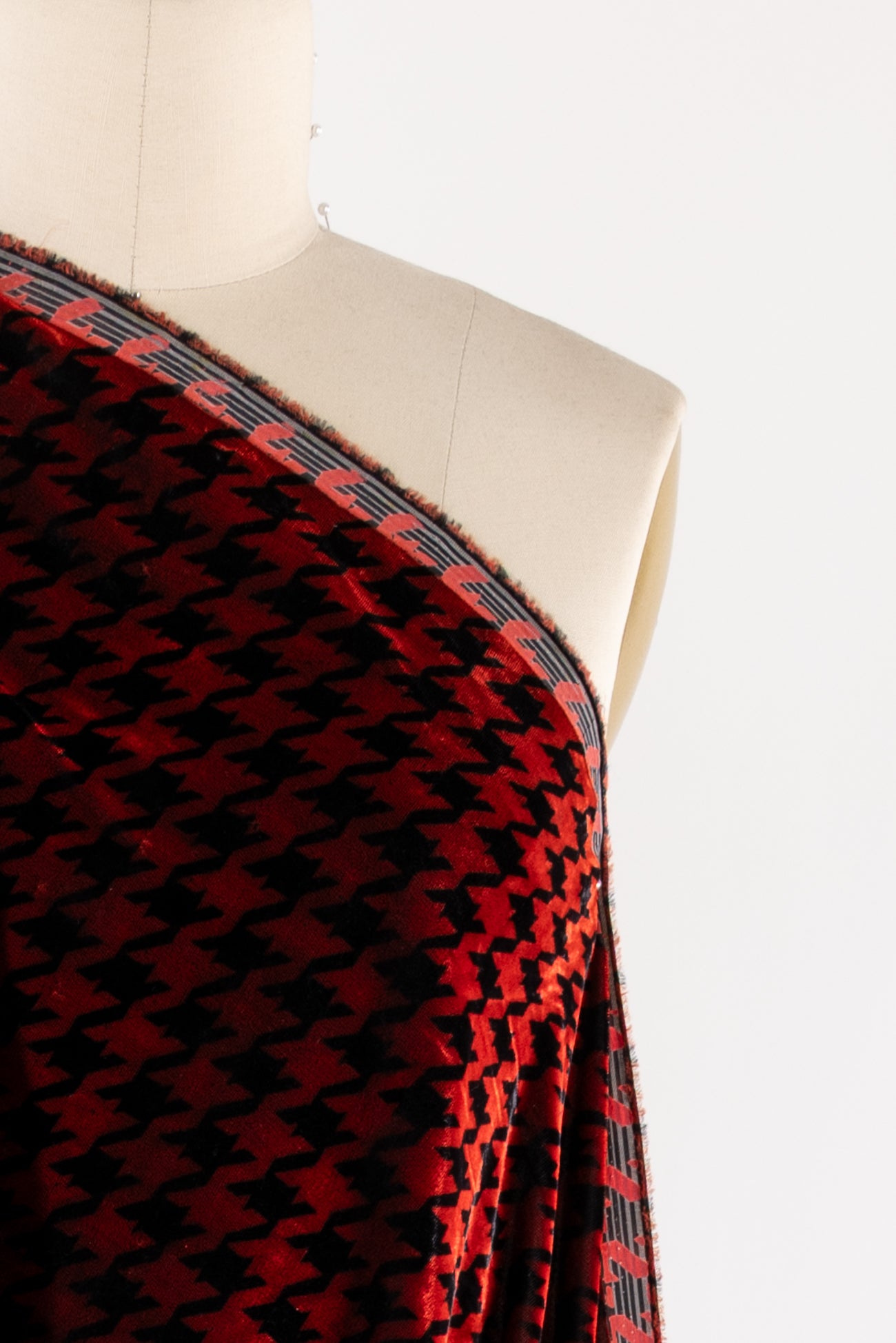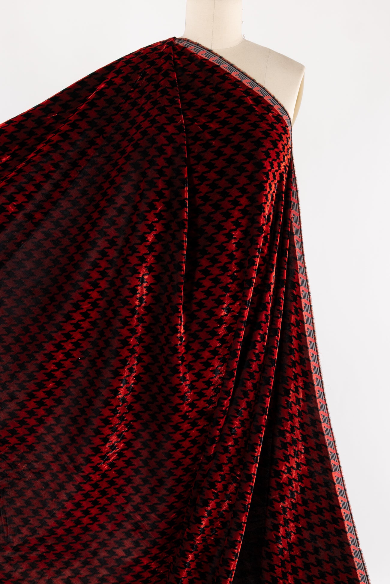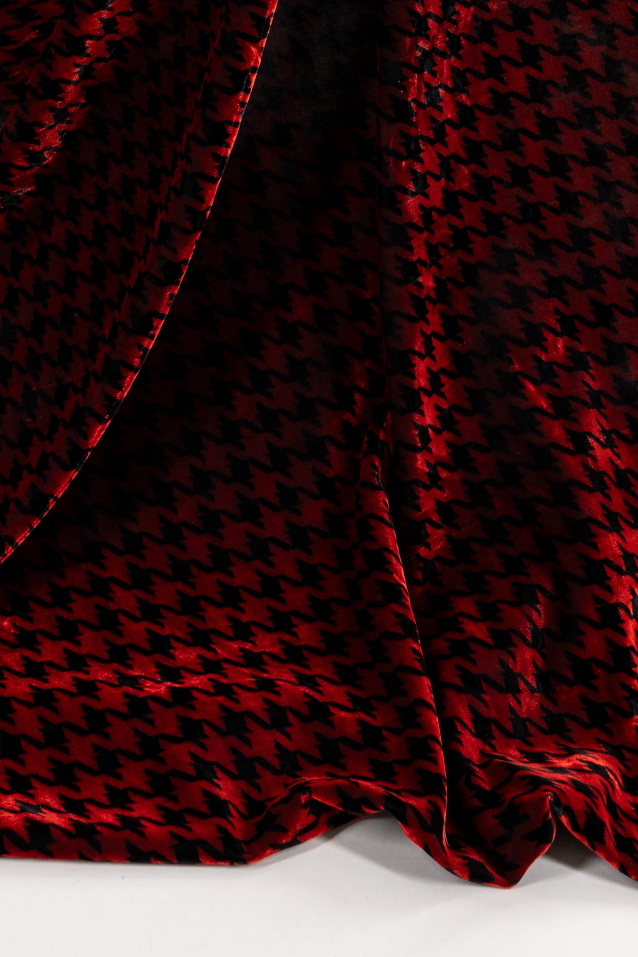 Elegant bittersweet and black houndstooth rayon velvet woven. Fine quality deadstock from a southern California designer. Light/mid-weight with a soft plush hand, 1" repeat and soft supple drape. Right for a dress, shirt, tunic, soft pant, cardi, jacket or loungewear.