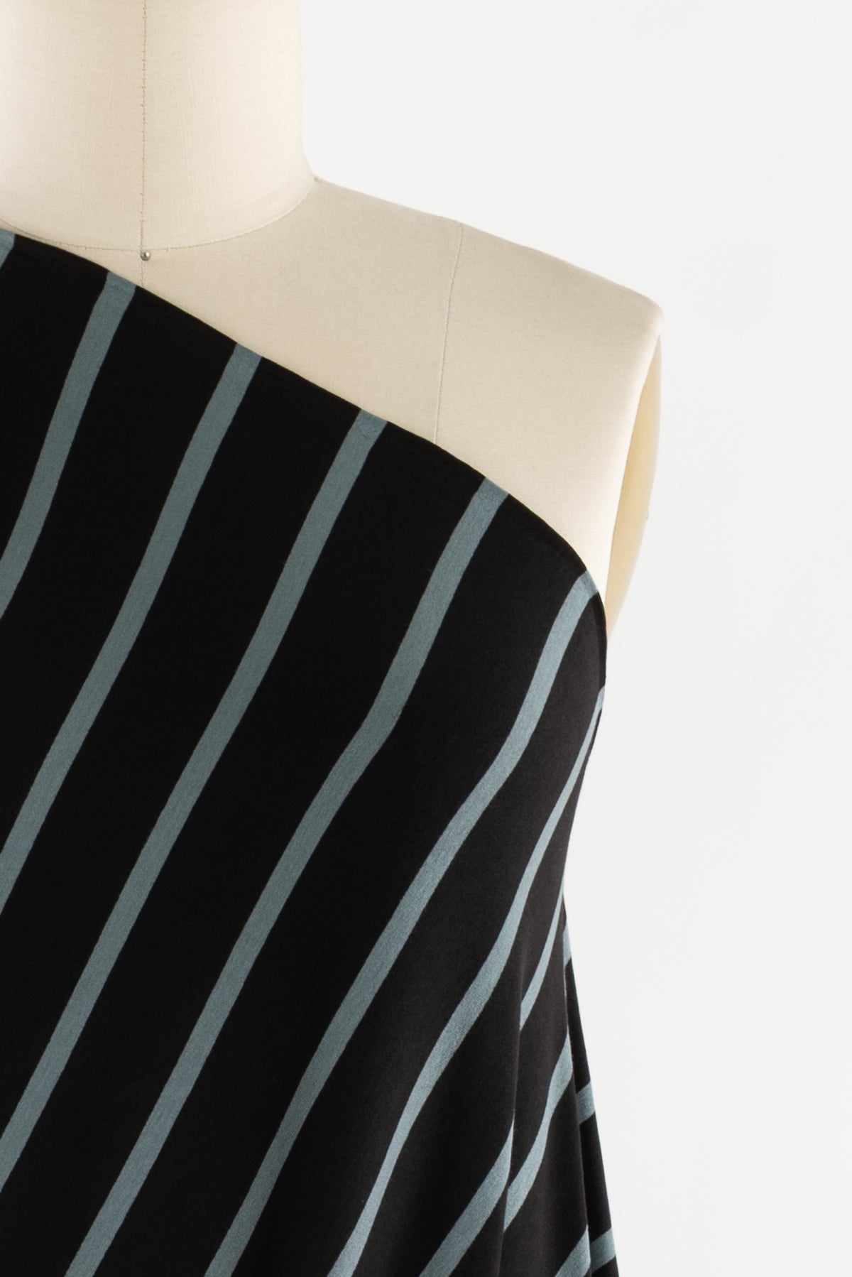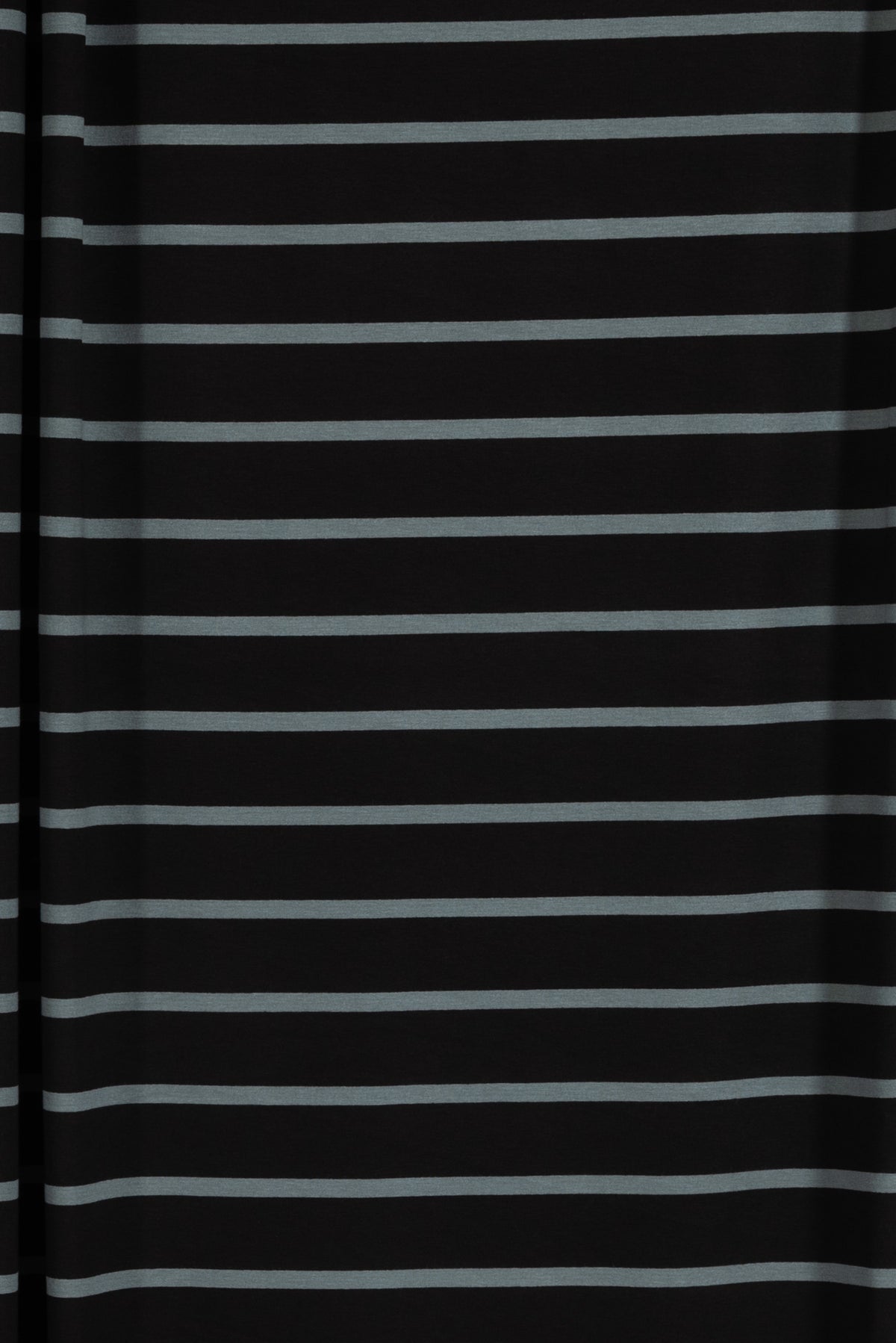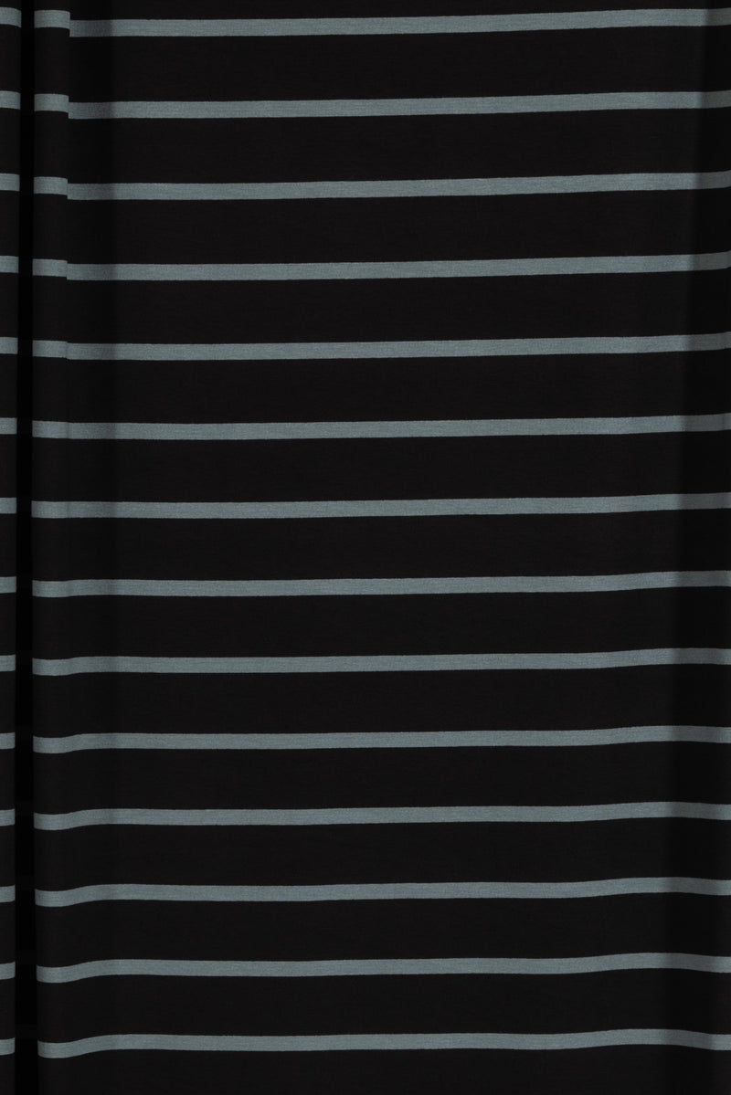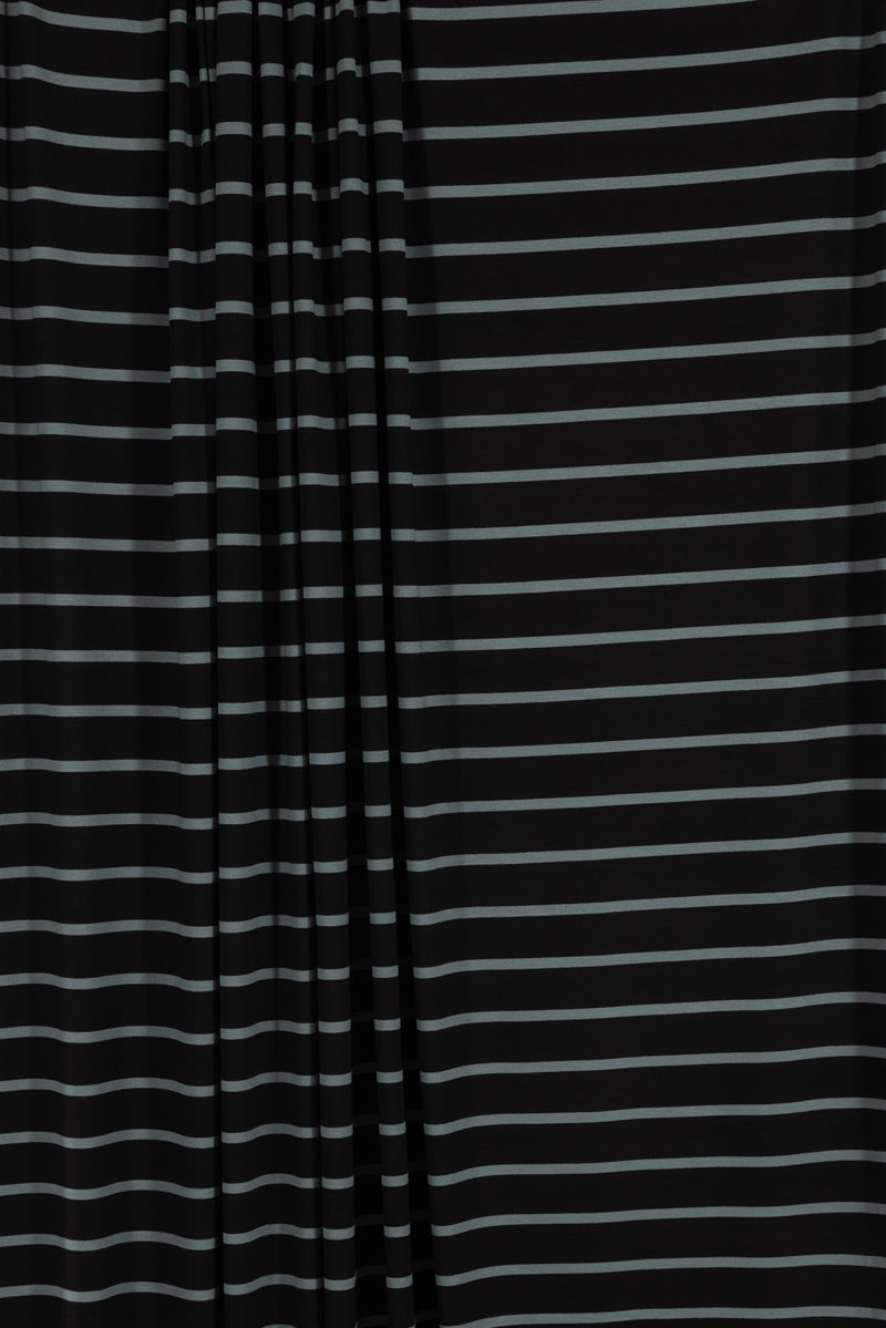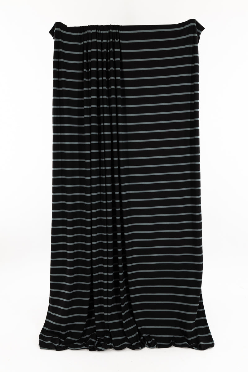 Splendid stripes in dusty blue and black in a gorgeous knit. Manufactured in the USA, this is a perfect light/mid-weight jersey with enough substance and stability to skim the body in the most flattering way. Opaque, with 4-way stretch, 5/16" dusty blue stripes, 1-5/16" black stripes, and some rolling at the cut edge. A beautiful knit with a soft hand and drape and a smooth matte finish. Just right for t-shirts, tunics, dresses, soft pants, leggings, a cardi, skirt, men's, or children's. Also great for trims, bindings, and contrast pieces.