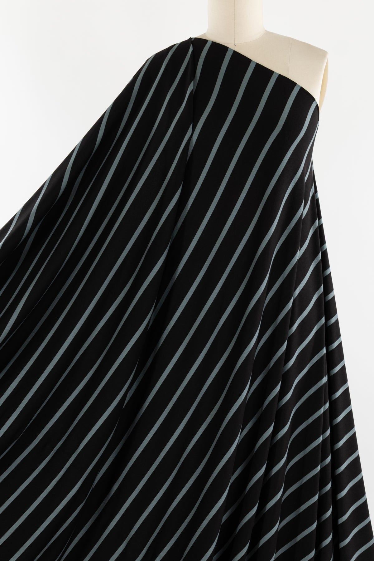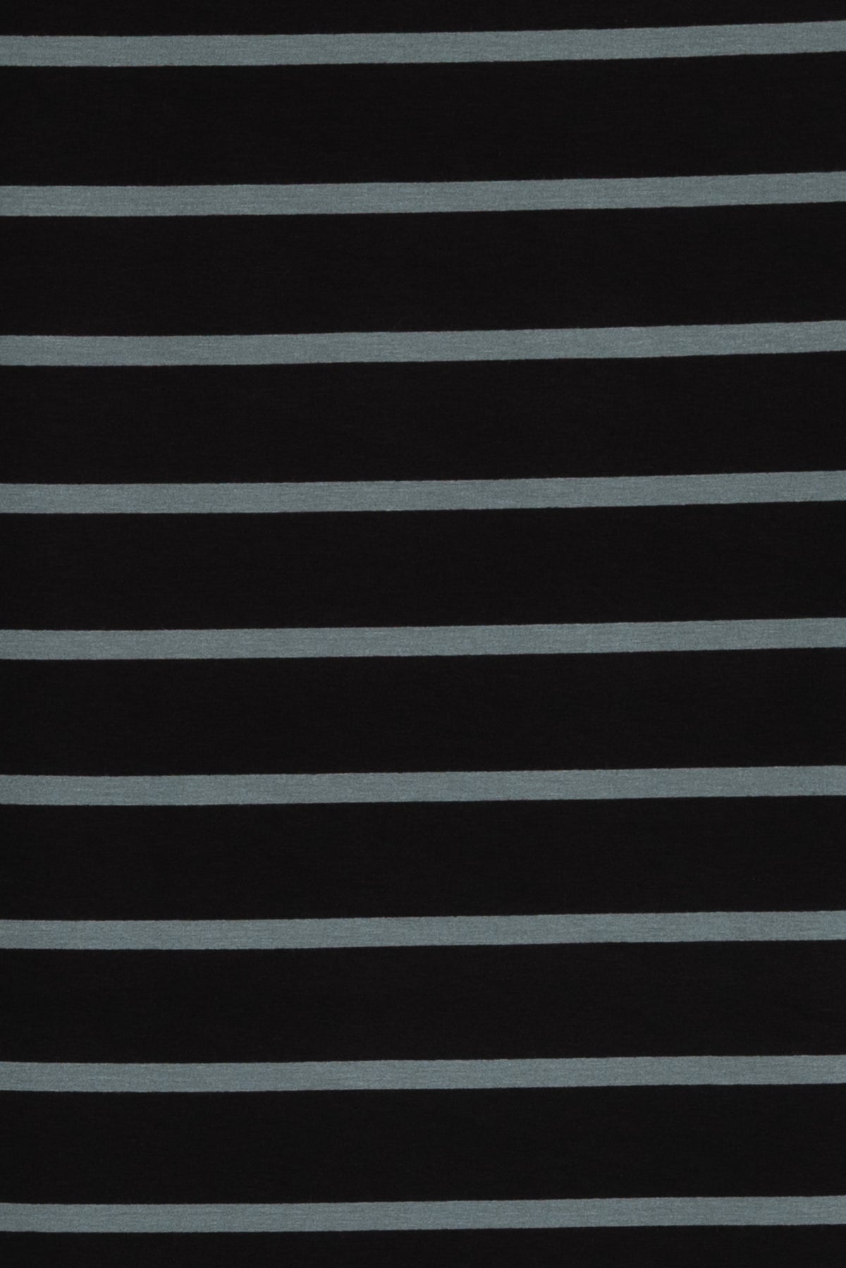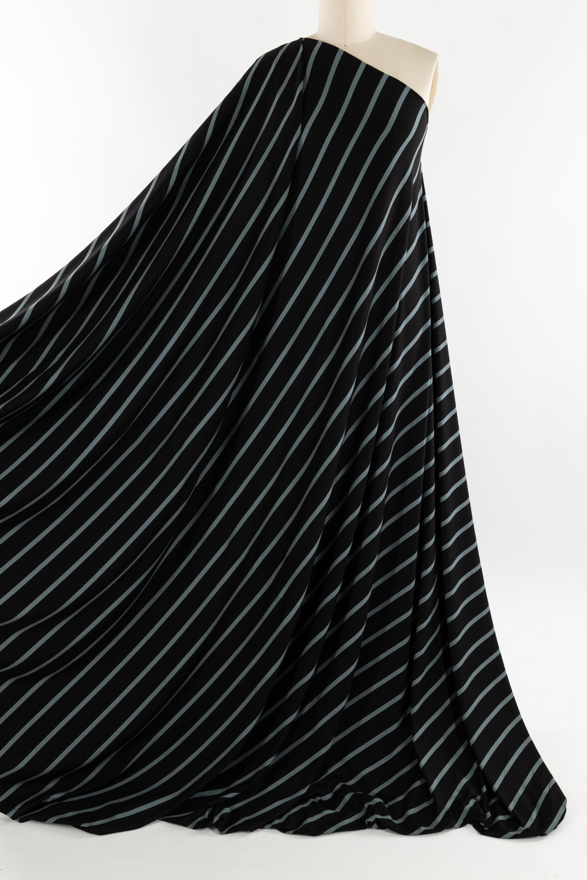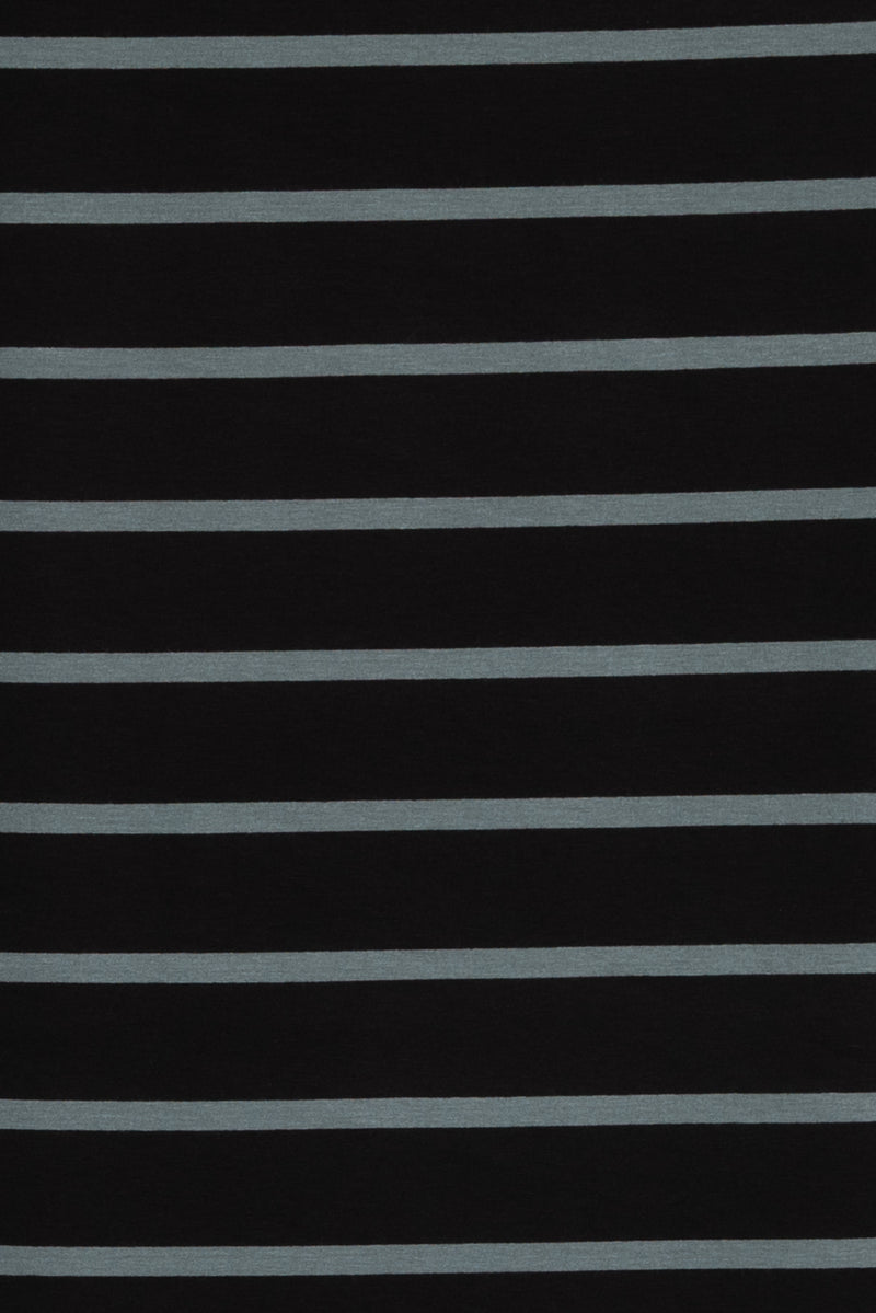 Splendid stripes in dusty blue and black in a gorgeous knit. Manufactured in the USA, this is a perfect light/mid-weight jersey with enough substance and stability to skim the body in the most flattering way. Opaque, with 4-way stretch, 5/16" dusty blue stripes, 1-5/16" black stripes, and some rolling at the cut edge. A beautiful knit with a soft hand and drape and a smooth matte finish. Just right for t-shirts, tunics, dresses, soft pants, leggings, a cardi, skirt, men's, or children's. Also great for trims, bindings, and contrast pieces.