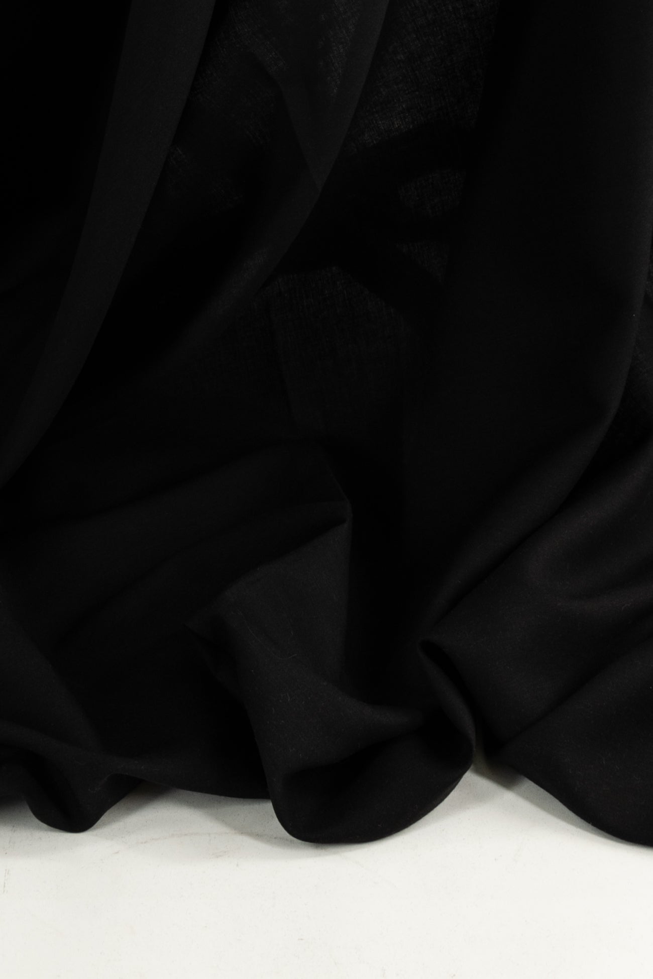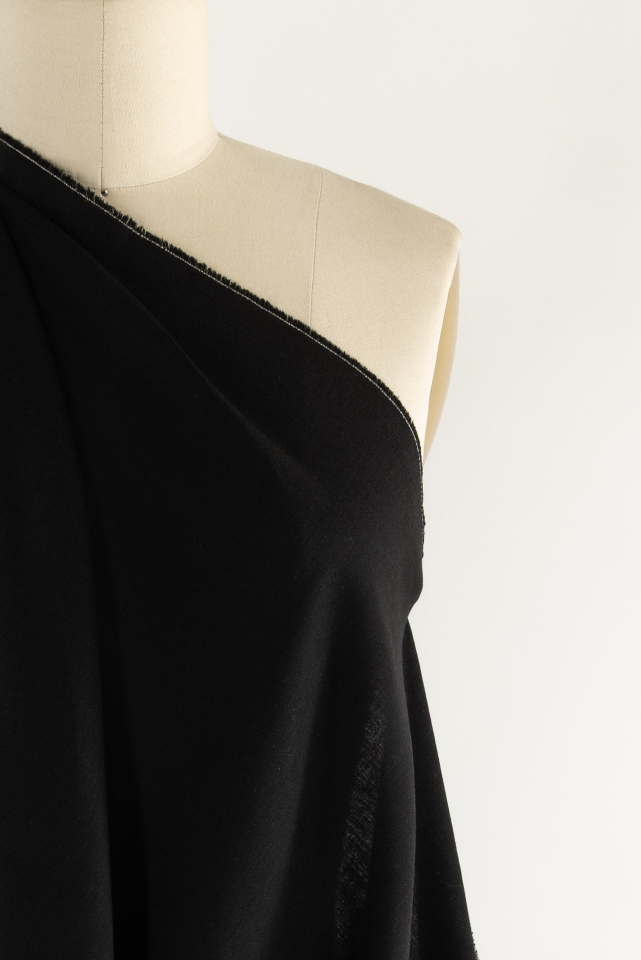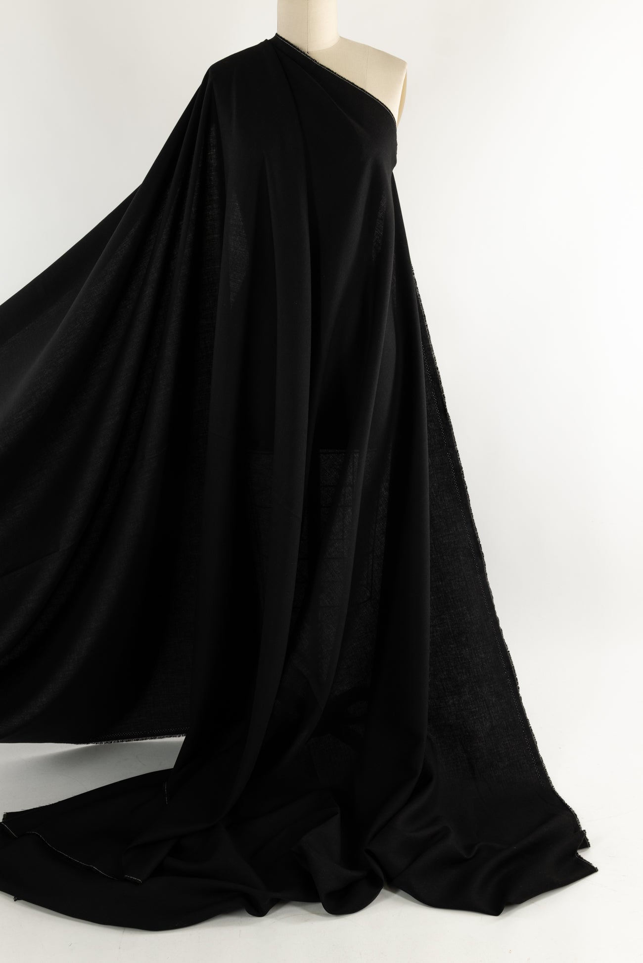 Classic black in a beautiful stretch linen blend. The fabric combines linen with rayon for a smooth elegance and the addition of lycra provides crosswise stretch with good recovery. Opaque with a soft matte hand and soft drape. This mid-weight will work for both tops and bottoms - just right for pants, light jacket or vest, shirt, dress, skirt, men's wear.