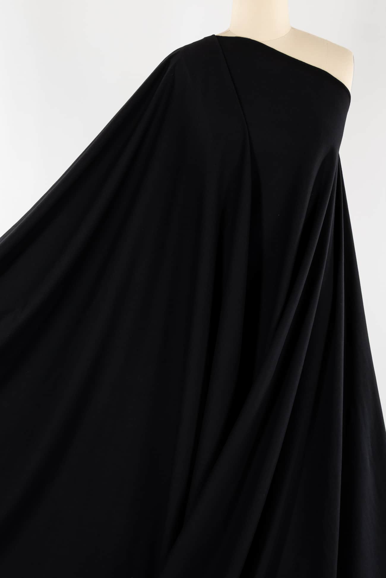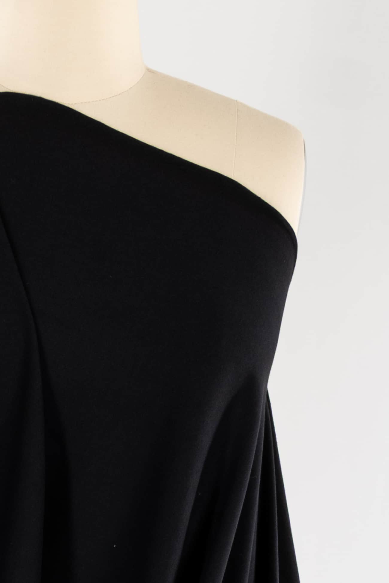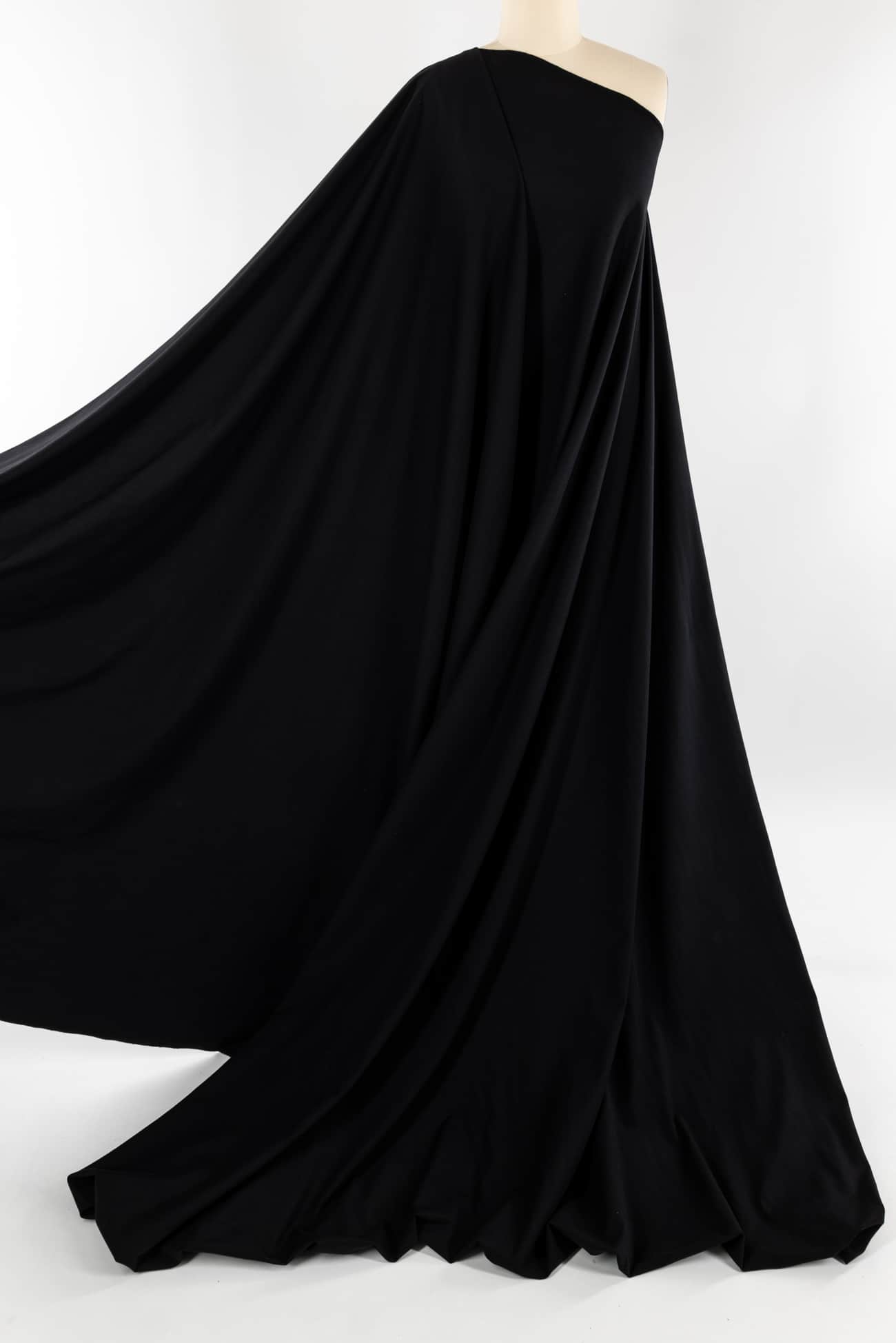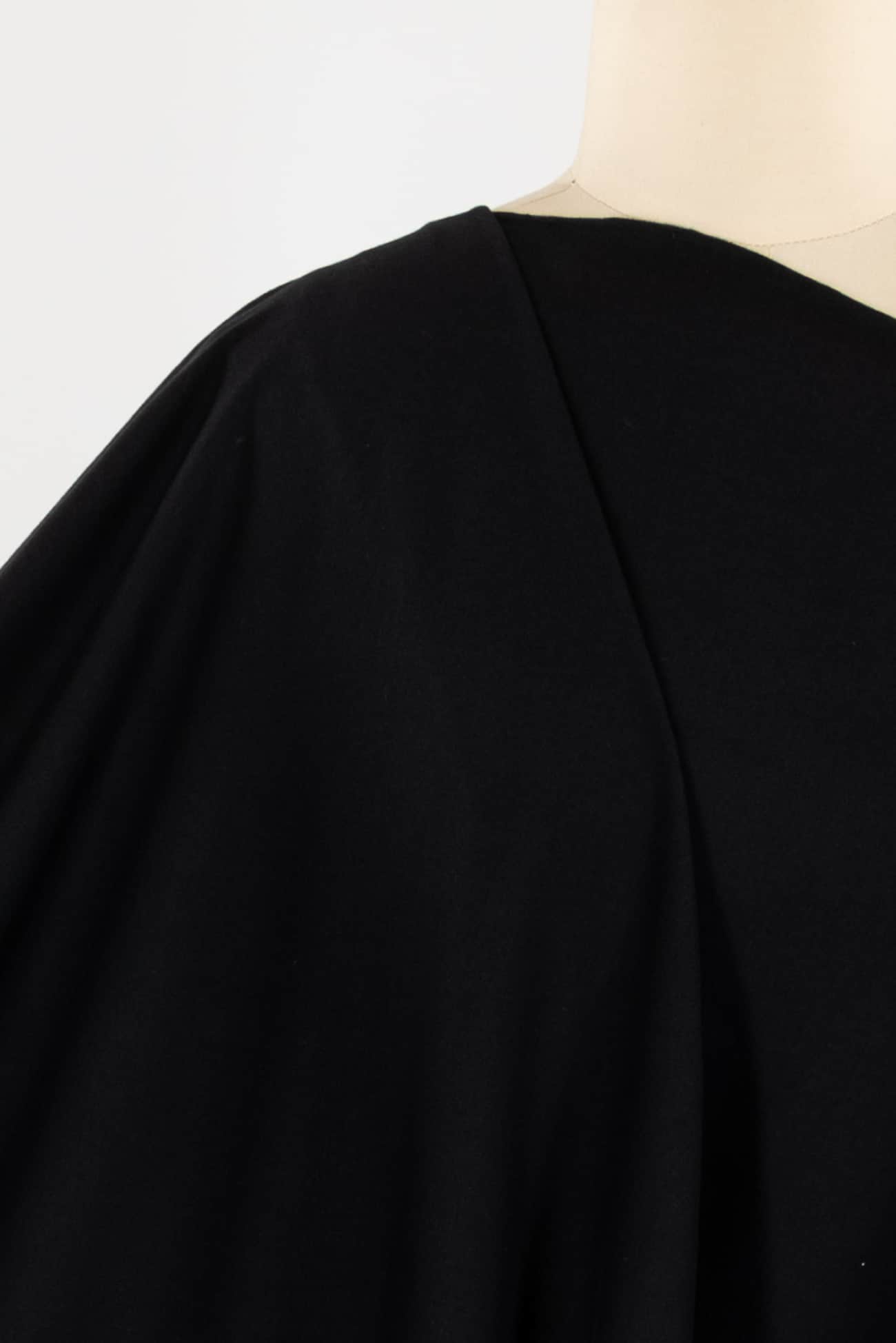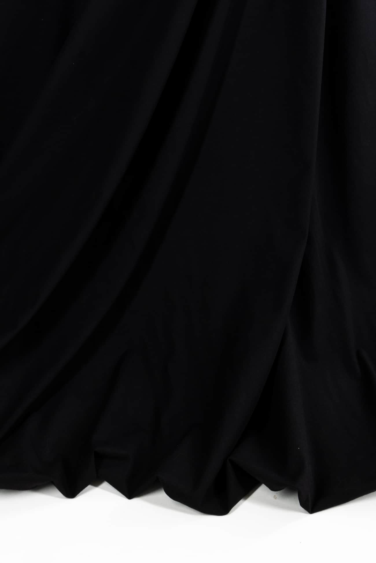 Superb quality beefy black cotton jersey, deadstock from a USA mill. Perfect for cool weather. Mid/lightweight, smooth hand, soft drape, crosswise stretch with good recovery (12% spandex!), just a touch of rolling at the cut edge so it will be easy to sew. Right for t-shirt, tunic, dress, cardi, hoodie, leggings, soft pants, loungewear. Limited quantity