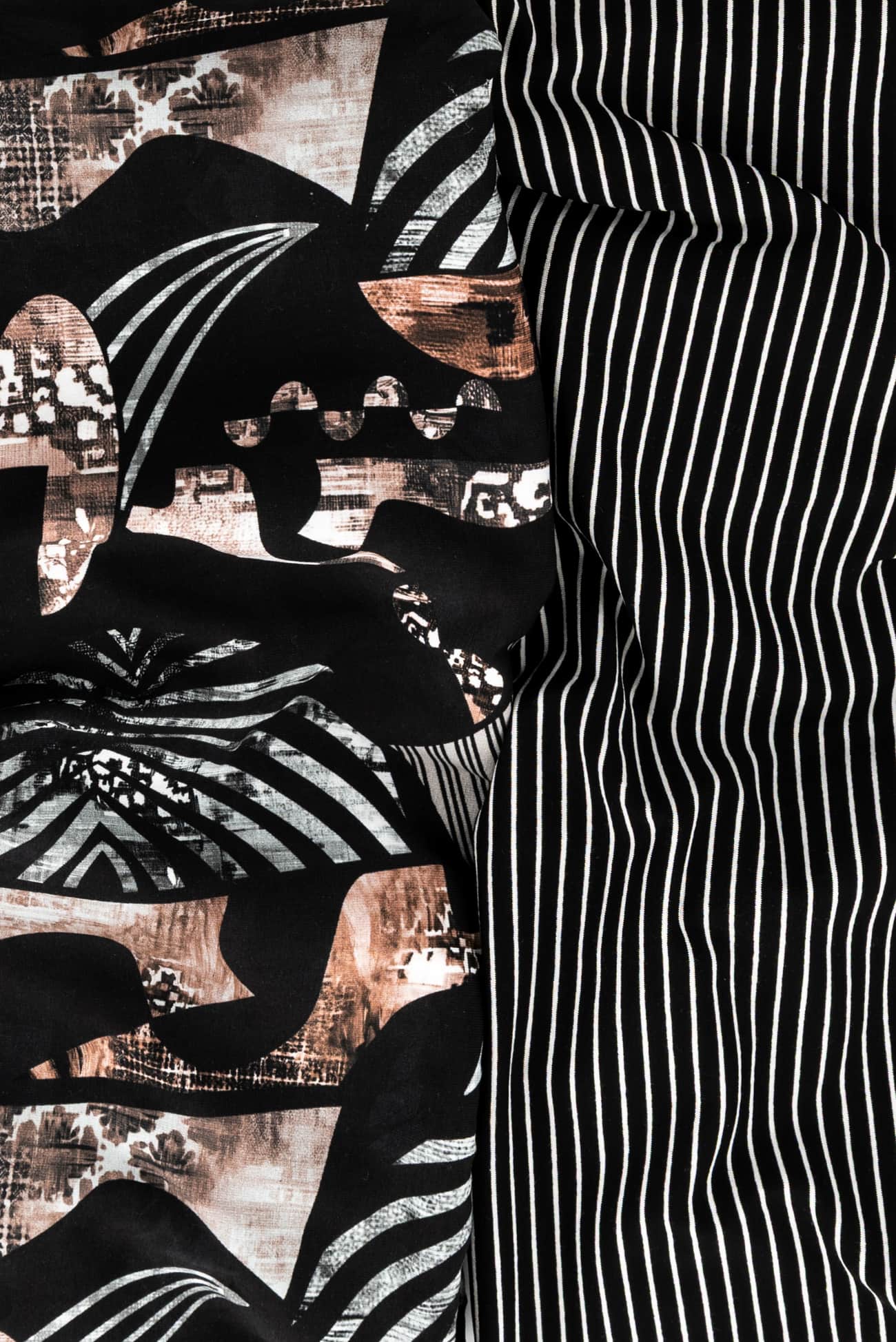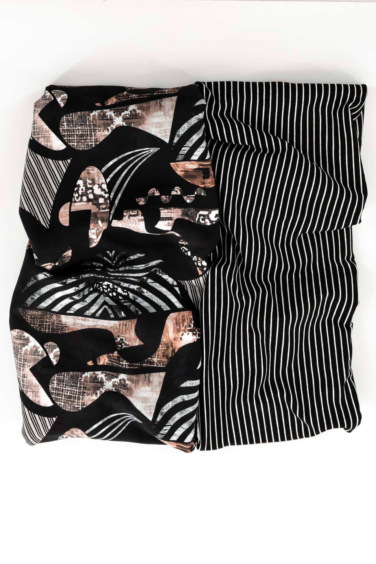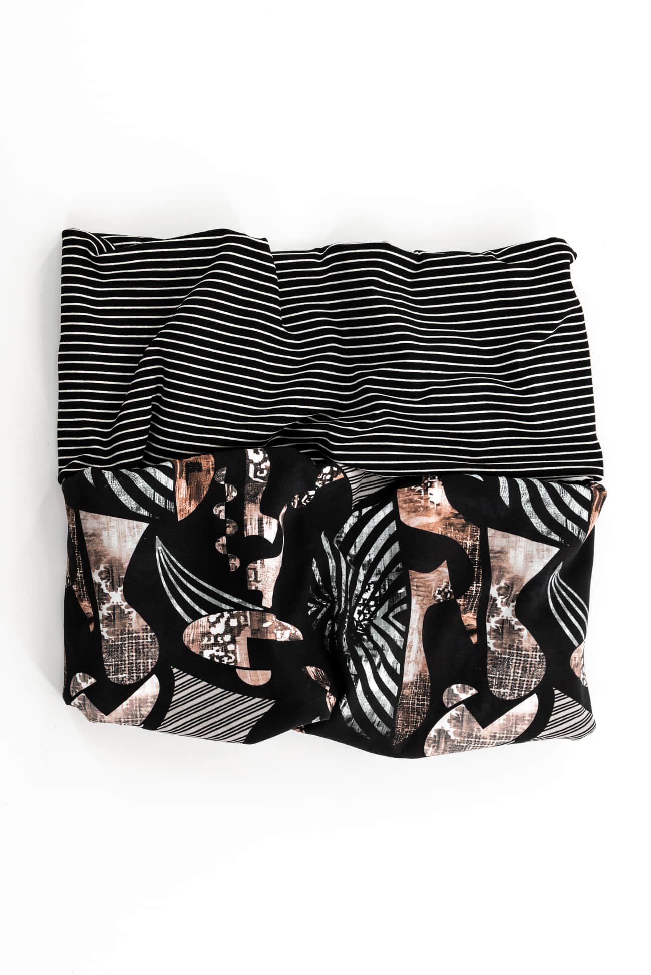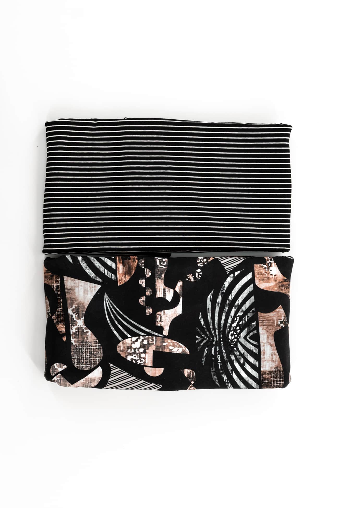 The BLEEKER STREET combo combines two harmonious knits; an abstract geometric European digital cotton/spandex knit that combines well with a black and white rayon/spandex stripe made in the USA. The two fabrics harmonize and blend beautifully together. Buttery soft with a liquid drape, four-way stretch and just a touch of rolling at the cut edge. The light/mid-weight is right for a top, t-shirt, tunic, cardi, hoodie, dress or skirt.