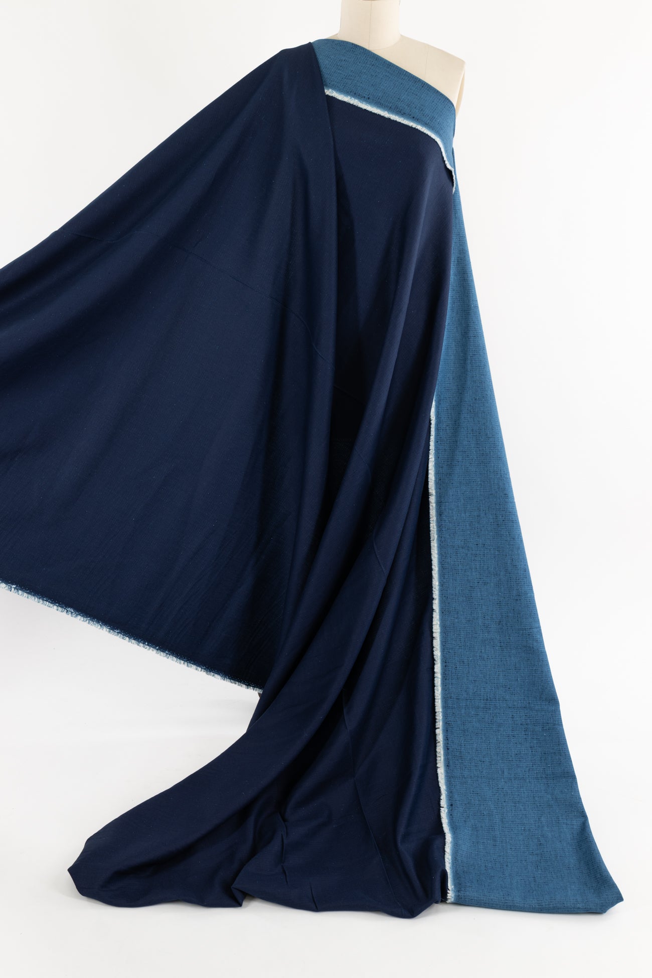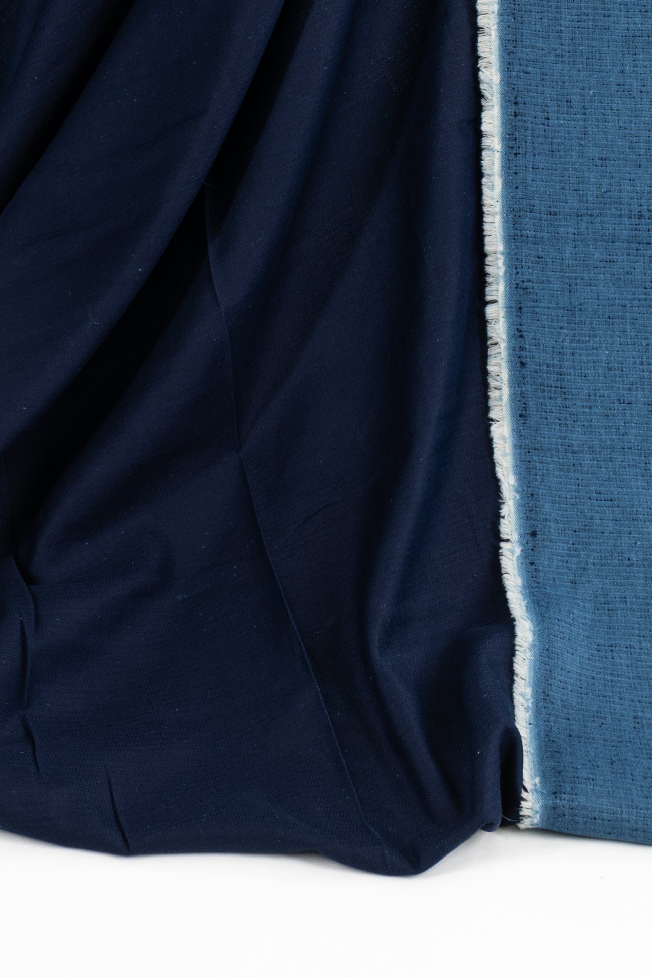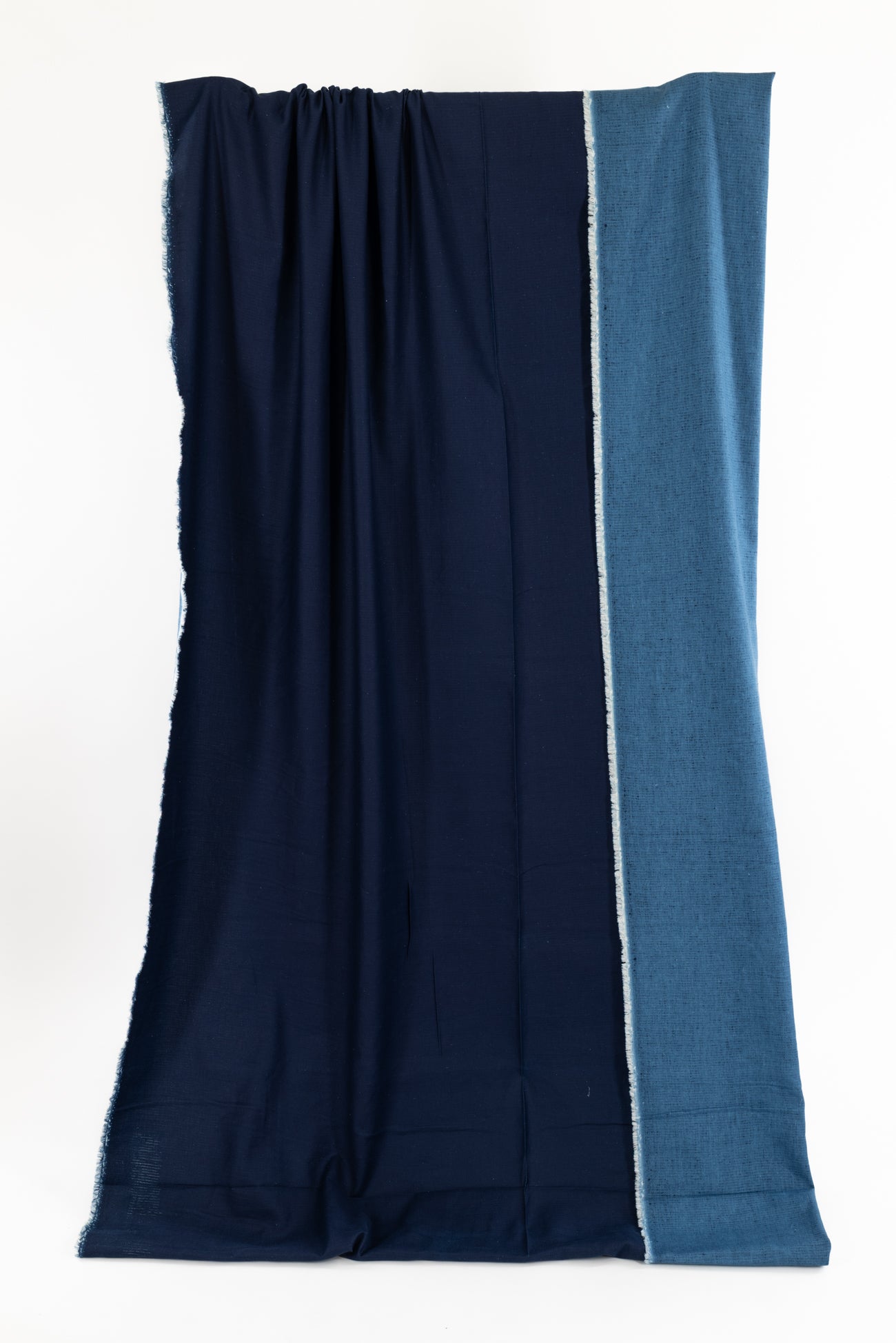 Deep navy blue on one side and sky blue on the reverse is printed on a basket woven cotton, fine deadstock from a New York designer. Mid-shirting weight, opaque with a soft lightly textured hand and light drape. Use either or both sides. Perfect for a shirt, tunic, skirt, dress, soft pants, caftan, men's or children's. Limited quantity available.