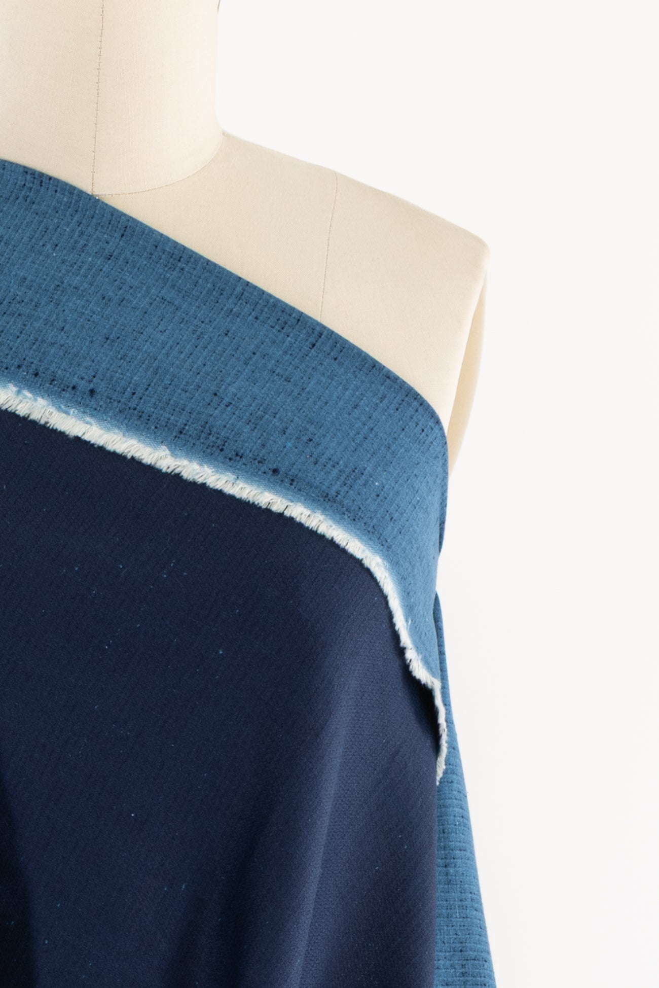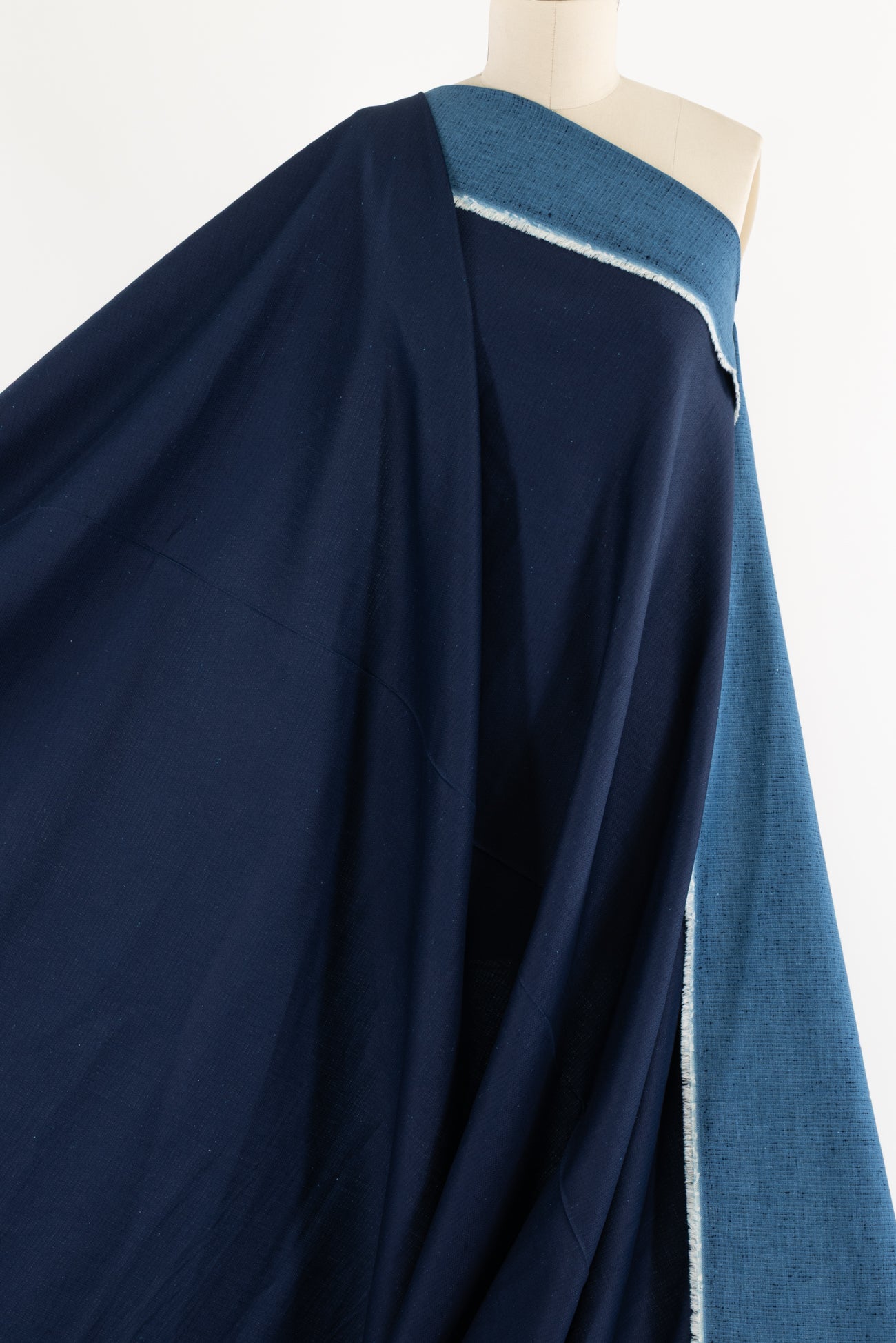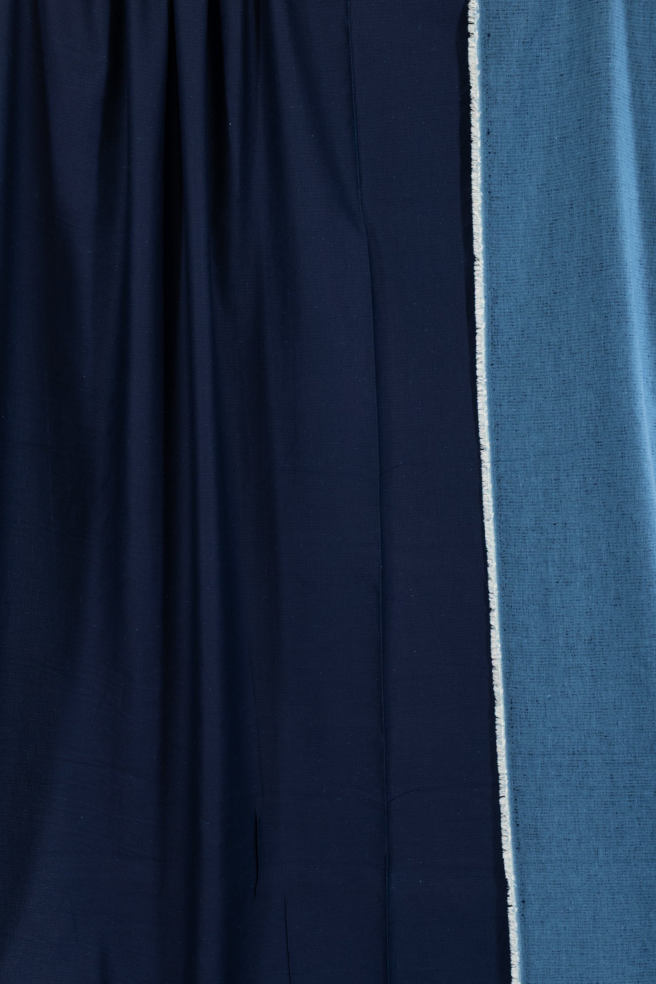 Deep navy blue on one side and sky blue on the reverse is printed on a basket woven cotton, fine deadstock from a New York designer. Mid-shirting weight, opaque with a soft lightly textured hand and light drape. Use either or both sides. Perfect for a shirt, tunic, skirt, dress, soft pants, caftan, men's or children's. Limited quantity available.