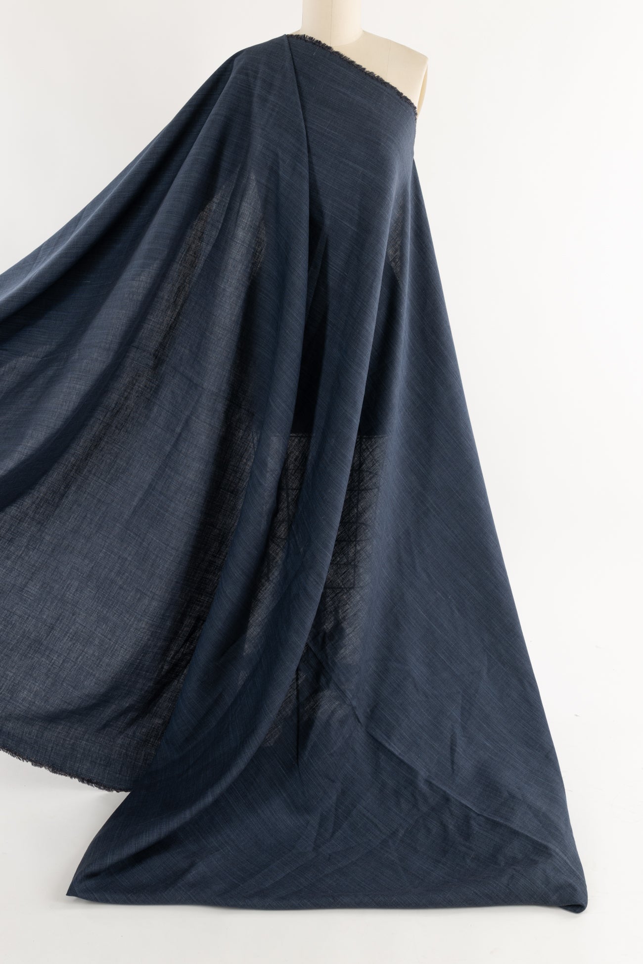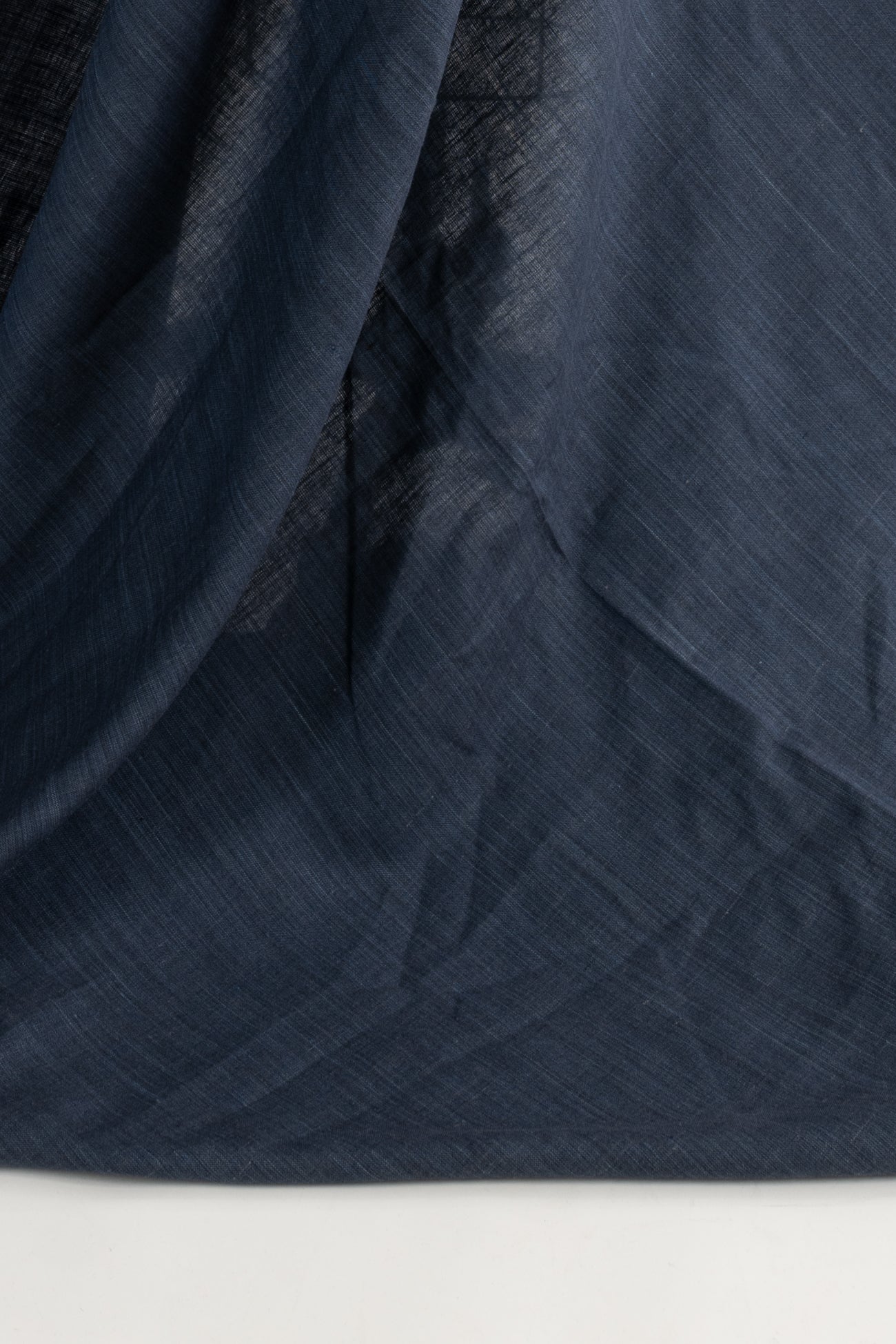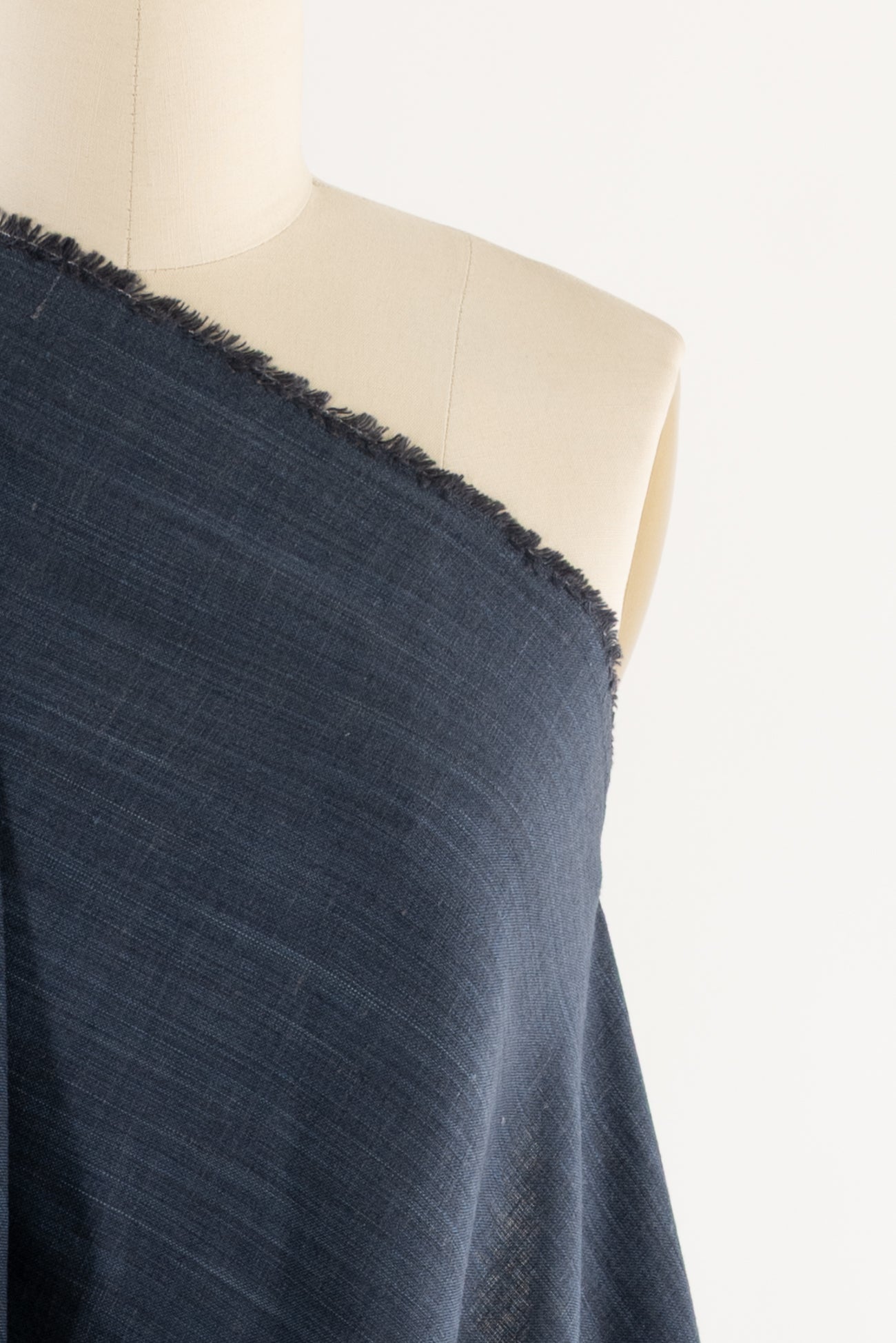 Muted dusty blue, deadstock from an LA designer, a subtle quiet deep shade. Lightweight, with a linen-texture, cool, smooth hand and fluid drape. Right for a shirt, light jacket, floaty vest, dress, skirt, jumpsuit, caftan, kimono, menswear. The linen/rayon blend combines the best of both fibers, resulting in a linen look paired with the fluid drape of rayon. Limited quantity