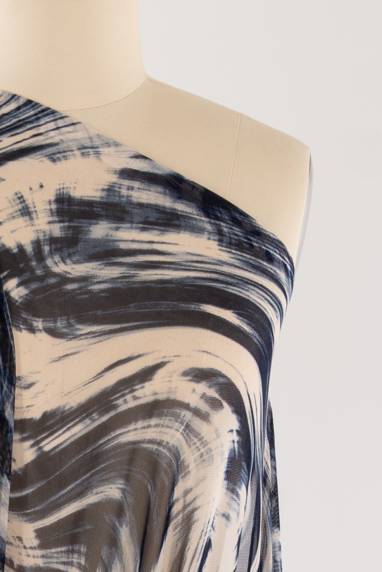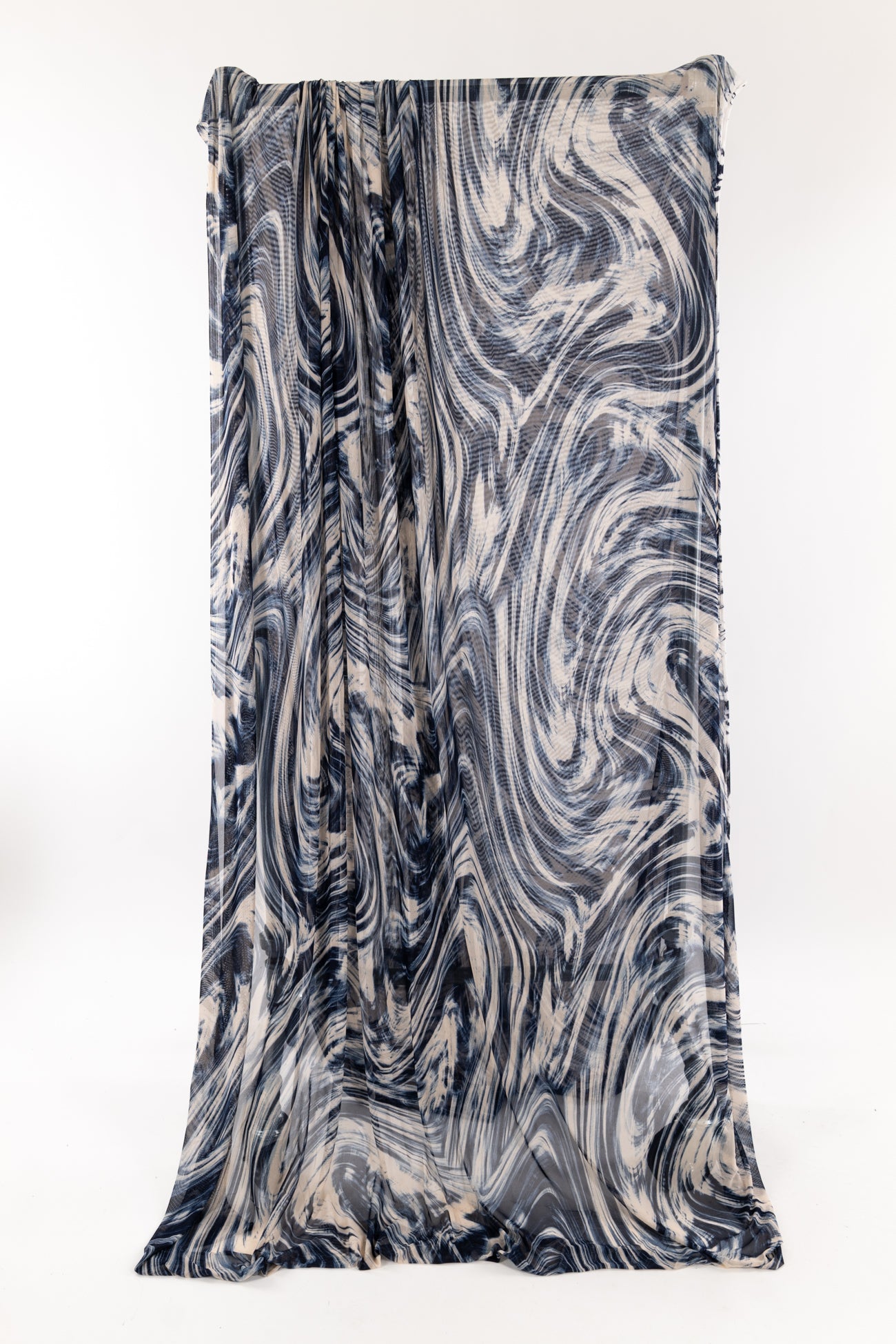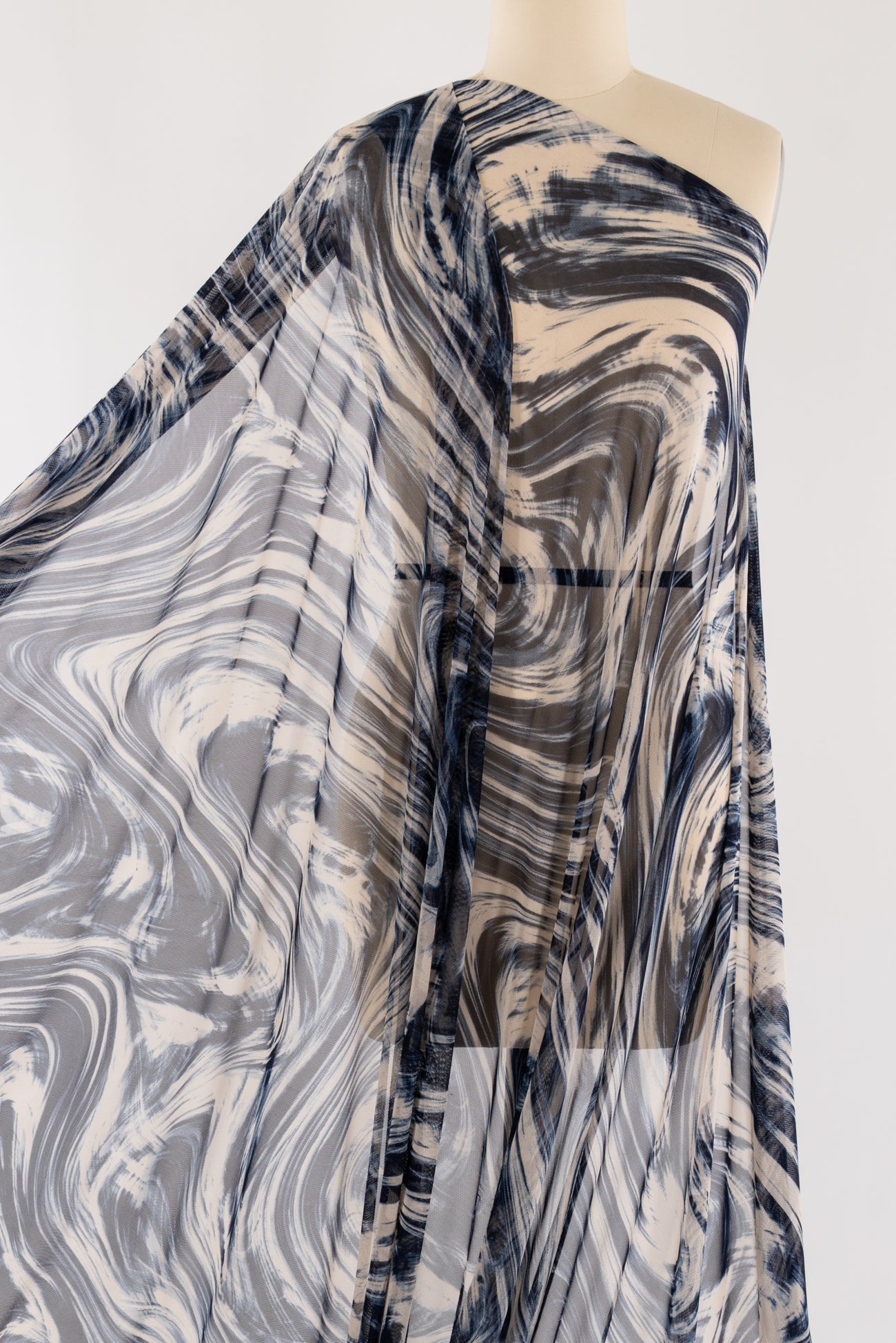 Fabulous fluid abstract in navy and cream with a painterly watercolor vibe, printed on a fine grained mesh. Lightweight deadstock is sheer, with a smooth hand, four-way stretch with good recovery and soft drape. Right for a top, tunic, t-shirt, cardigan, leggings, layering, trims and edges. Marcy says, 'Unusual, beautiful, love the fine quality - I can see a little layering top or jacket to wear as a coverup. Denim friendly too!'