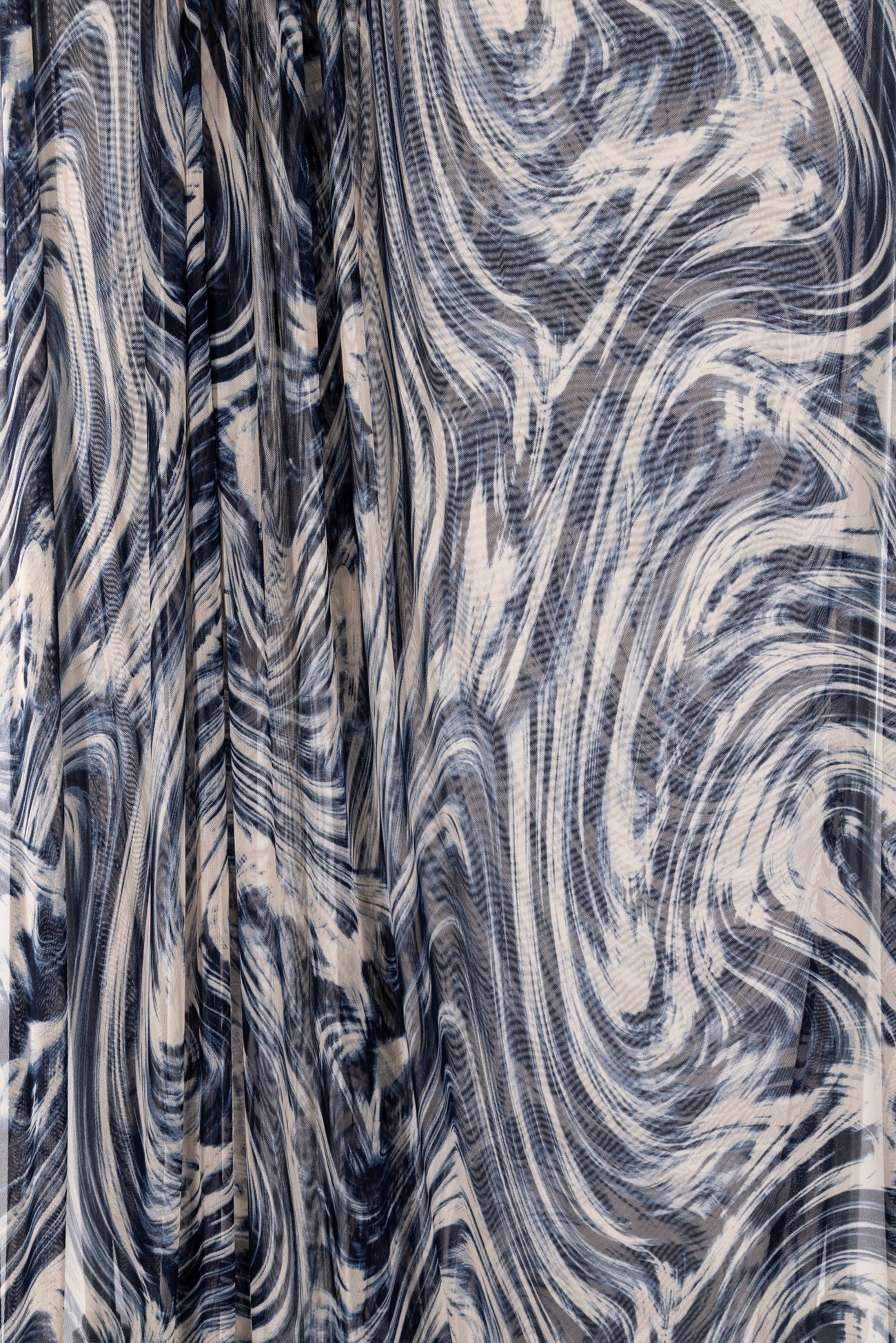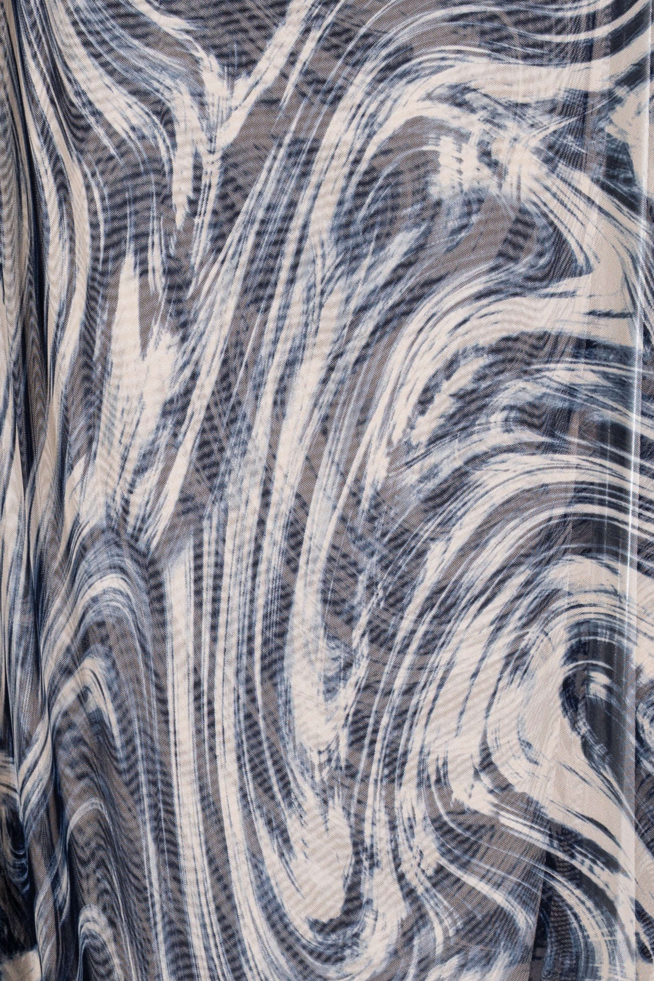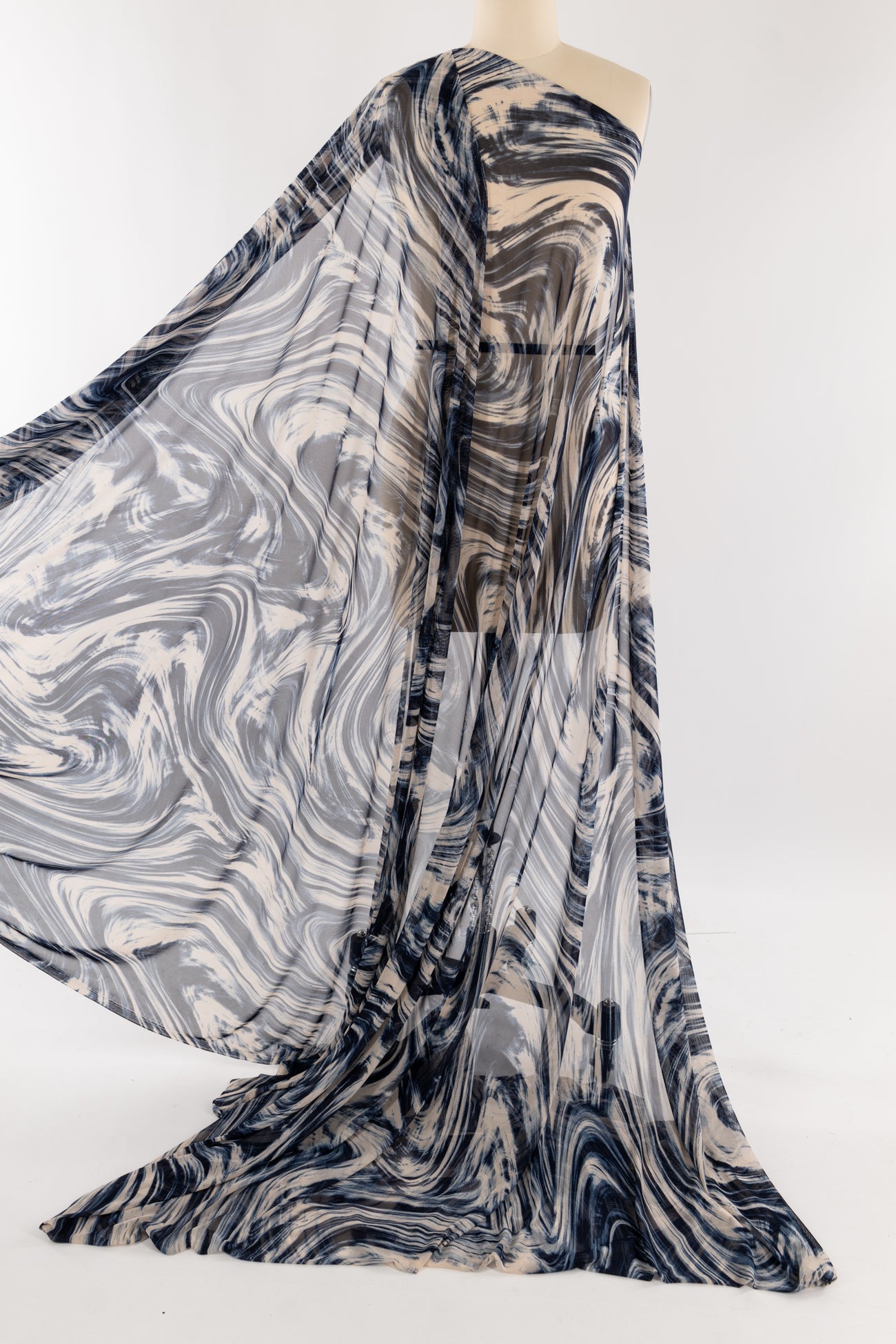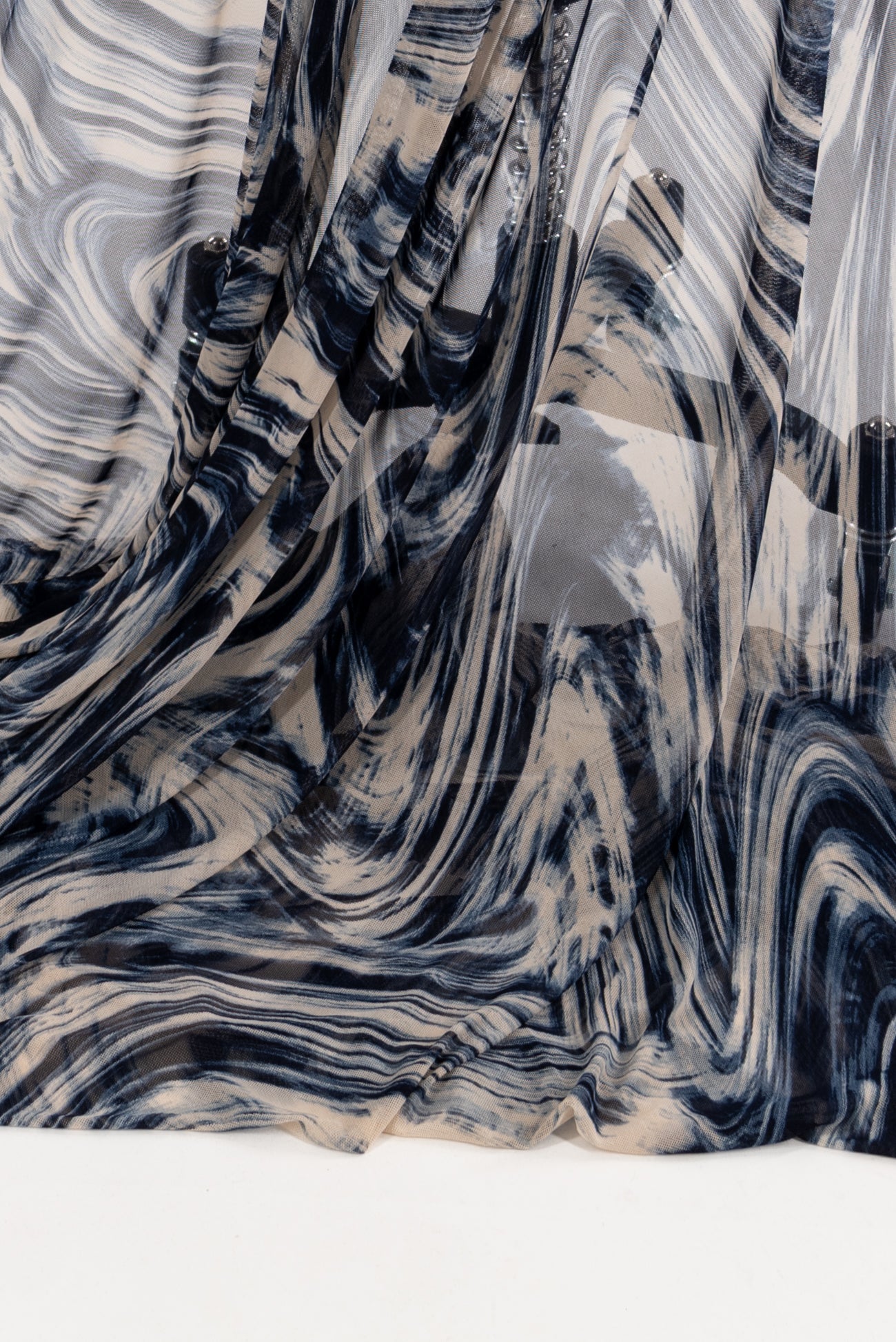Fabulous fluid abstract in navy and cream with a painterly watercolor vibe, printed on a fine grained mesh. Lightweight deadstock is sheer, with a smooth hand, four-way stretch with good recovery and soft drape. Right for a top, tunic, t-shirt, cardigan, leggings, layering, trims and edges. Marcy says, 'Unusual, beautiful, love the fine quality - I can see a little layering top or jacket to wear as a coverup. Denim friendly too!'