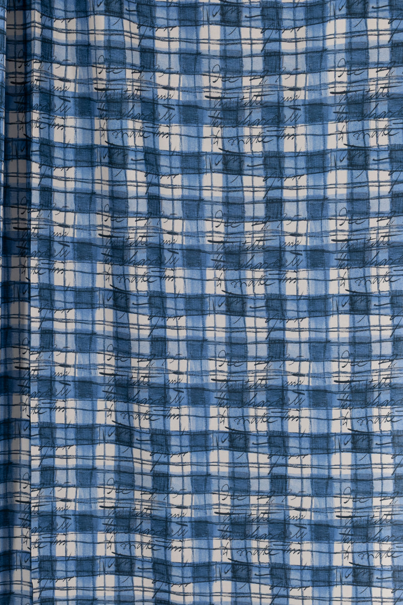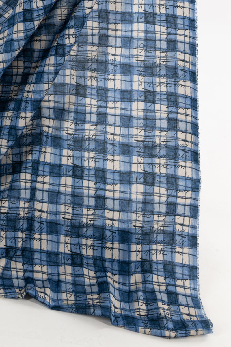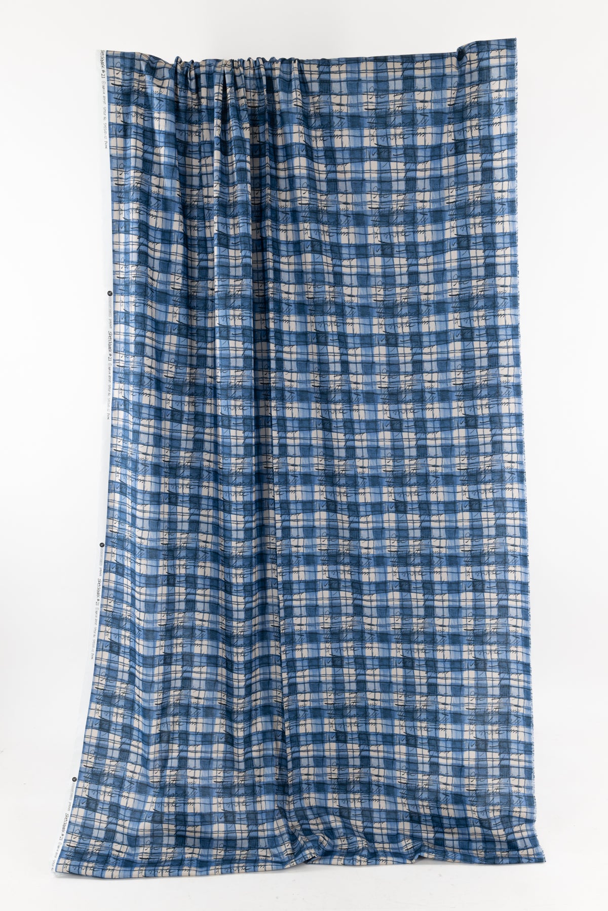 An artful watercolor geometric with cheery checks in shades of blue on parchment with black text accents. Lightweight, opaque, with a smooth cool hand, a 6¾" repeat, and soft drape. Right for a dress, skirt, shirt, tunic, caftan, kimono, soft pant, men's, or children's wear.