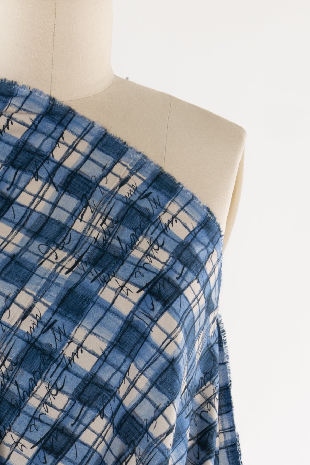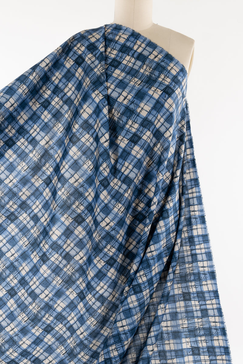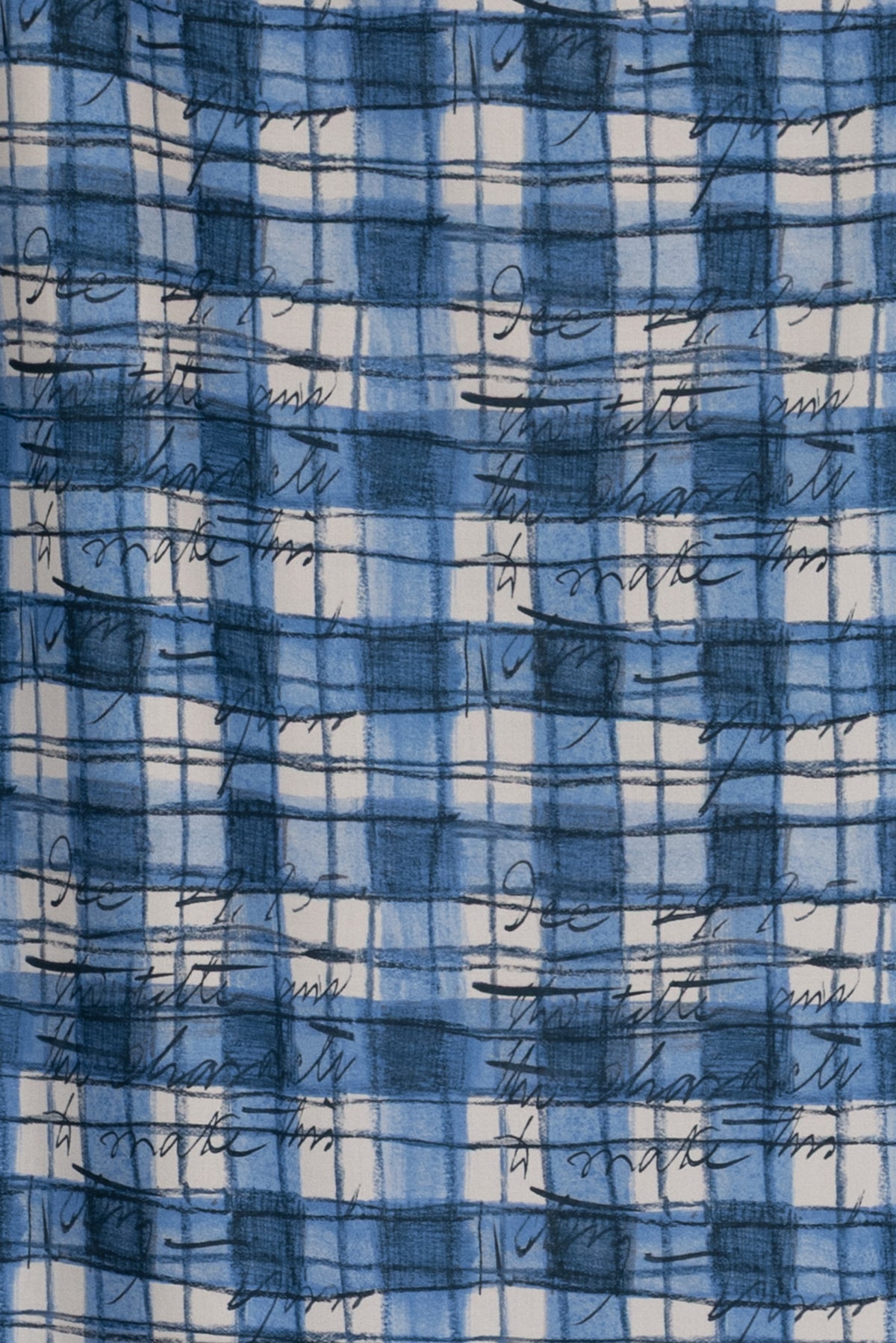 An artful watercolor geometric with cheery checks in shades of blue on parchment with black text accents. Lightweight, opaque, with a smooth cool hand, a 6¾" repeat, and soft drape. Right for a dress, skirt, shirt, tunic, caftan, kimono, soft pant, men's, or children's wear.