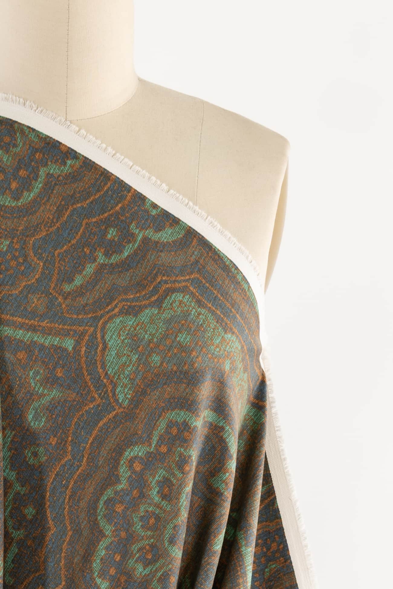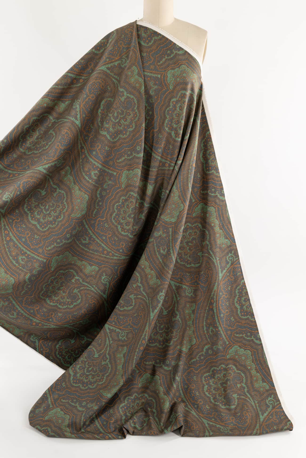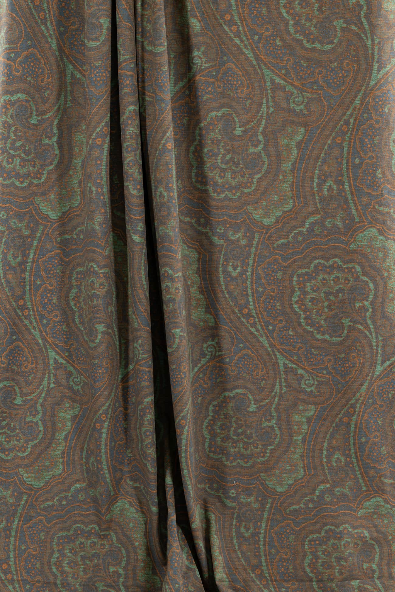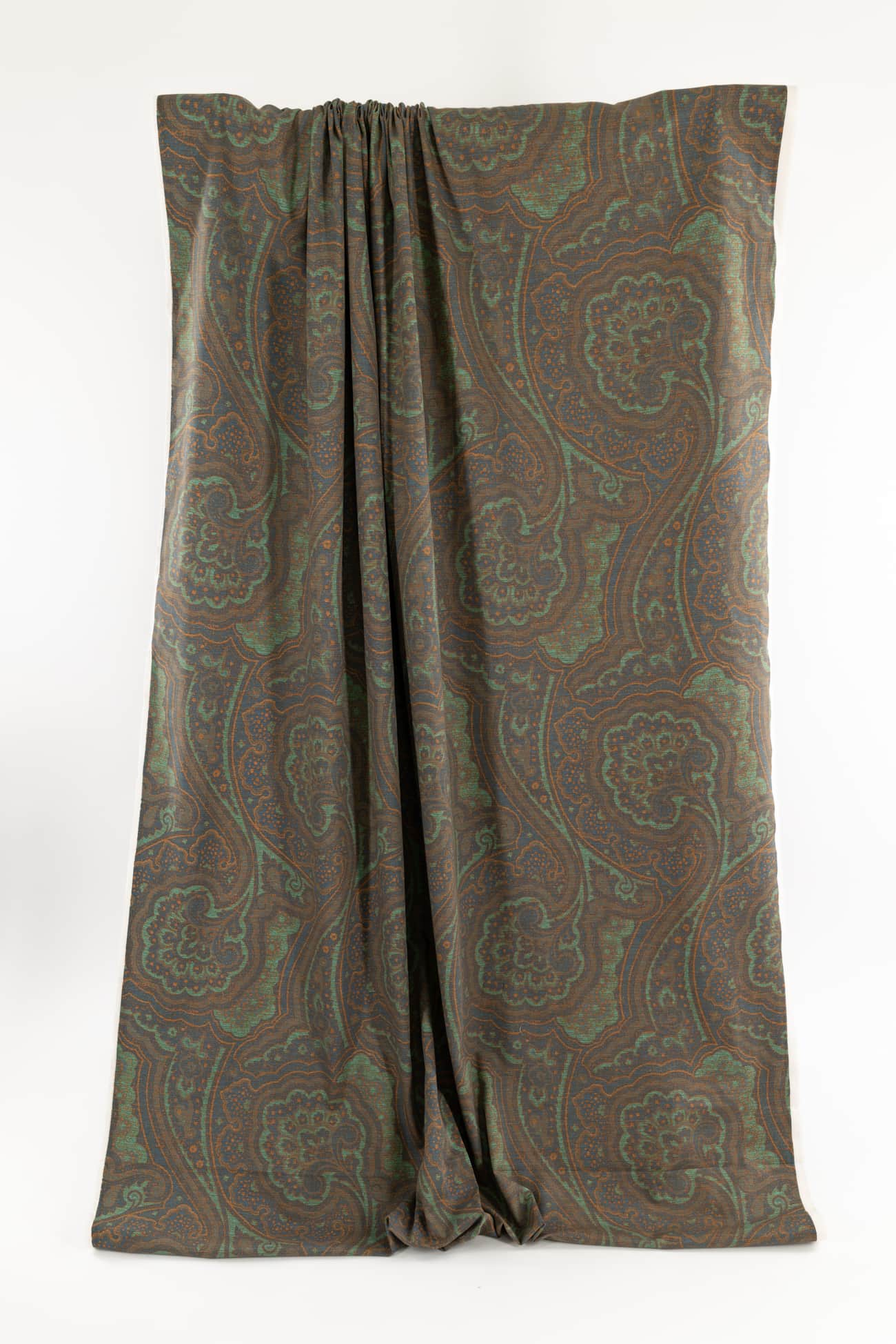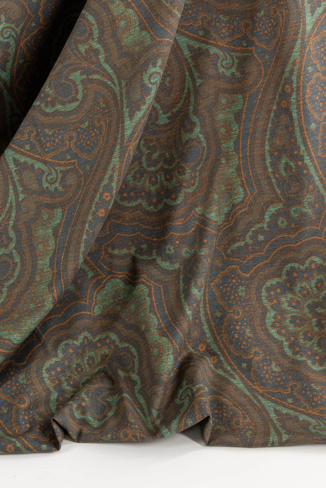 Striking paisley in shades of teal, seafoam and ginger, fine quality woven deadstock from a New York designer. Mid-lightweight with a lightly textured twill hand, soft drape and 23¾" repeat. Right for a light jacket or coat, jeans, dress, vest, soft pants, skirt or fun workwear. Limited quantity available.