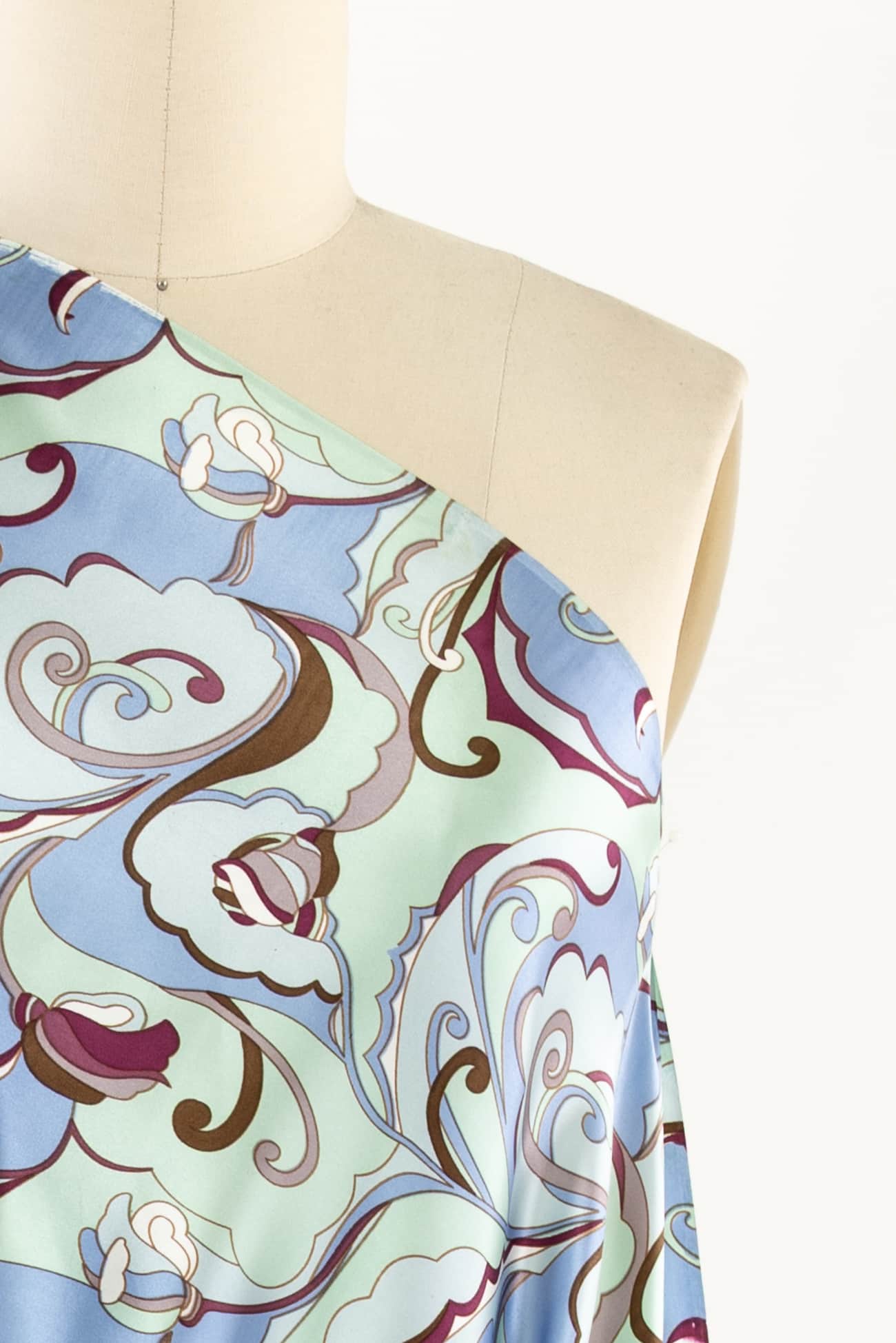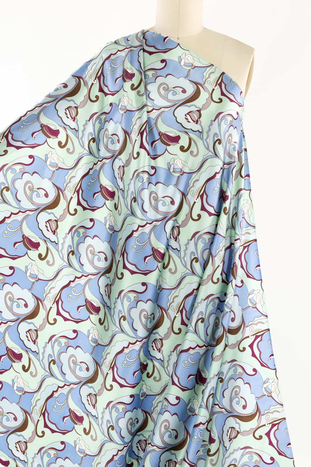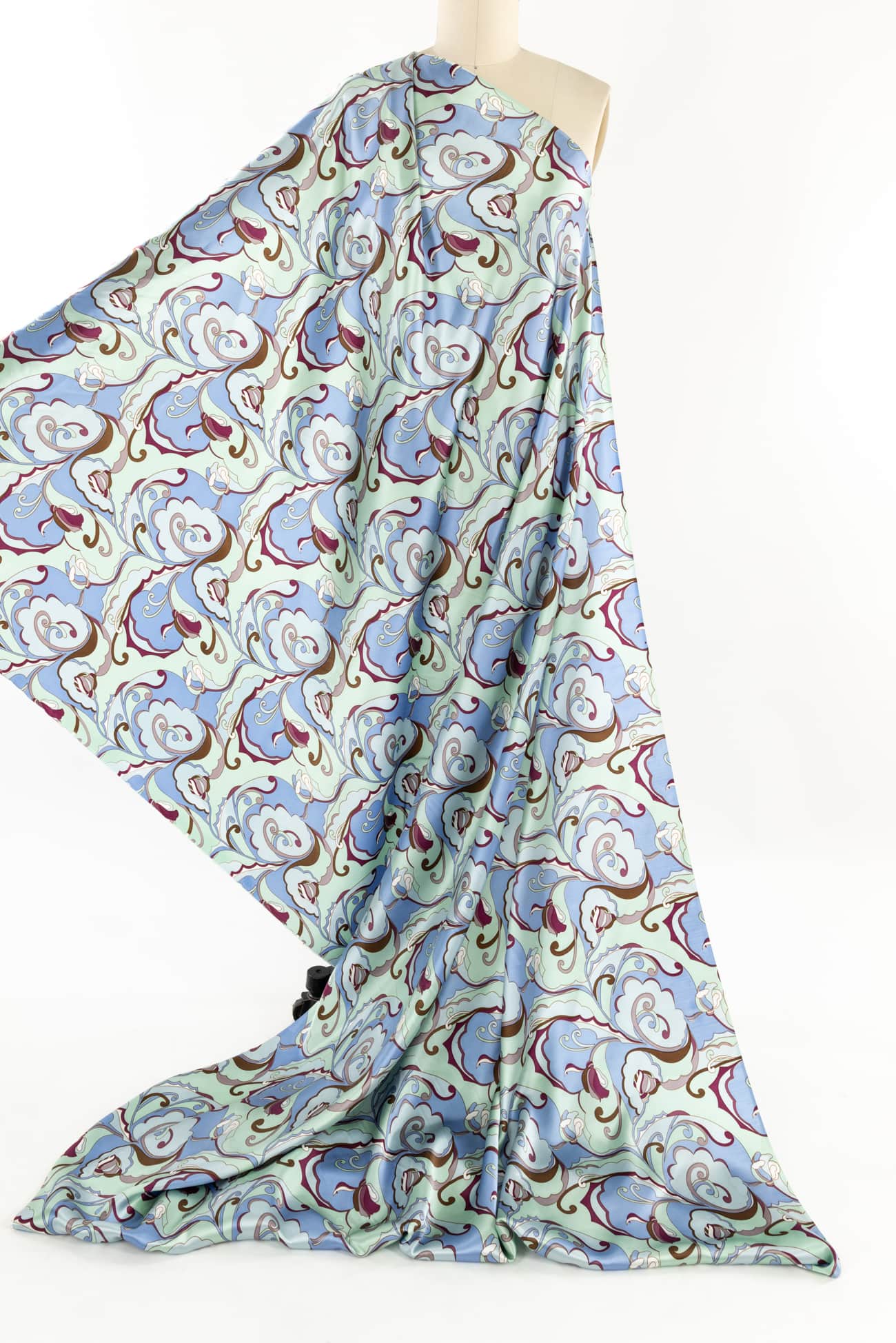 Subtle abstract deco inspired in blue tones with accents of pale green, brown and burgundy, digitally printed on silk crepe de chine, deadstock from an Italian mill produced for NYC designer Maria Conjeo/Zero. Lightweight, opaque, with a buttery, sateen texture, matte on the reverse, and fluid liquid drape. Right for a dress, shirt, blouse, tunic, skirt, kimono, caftan, jumpsuit. Would make a sumptuous lining! One way design, 9" repeat. Limited quantity.