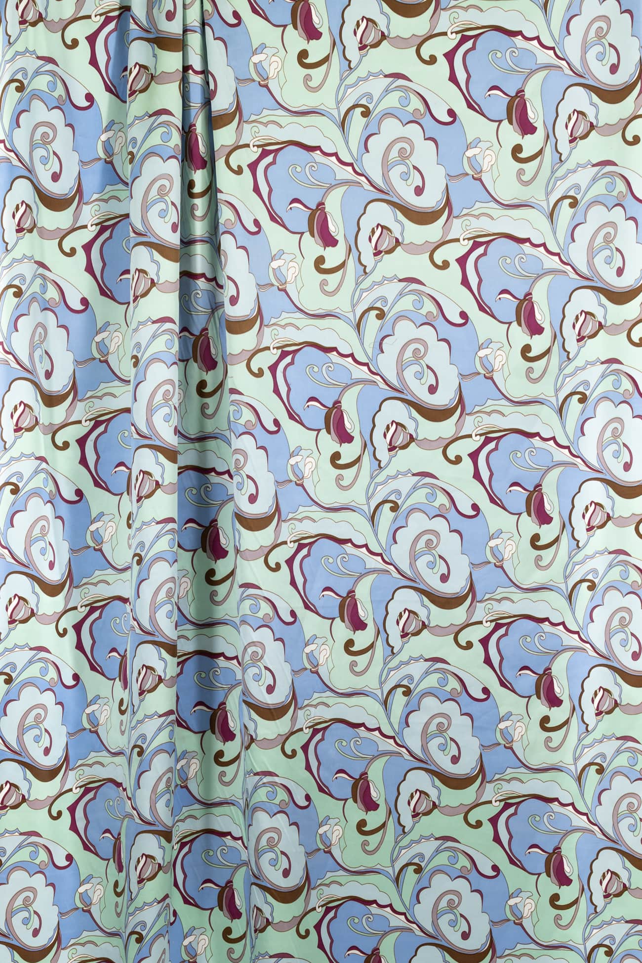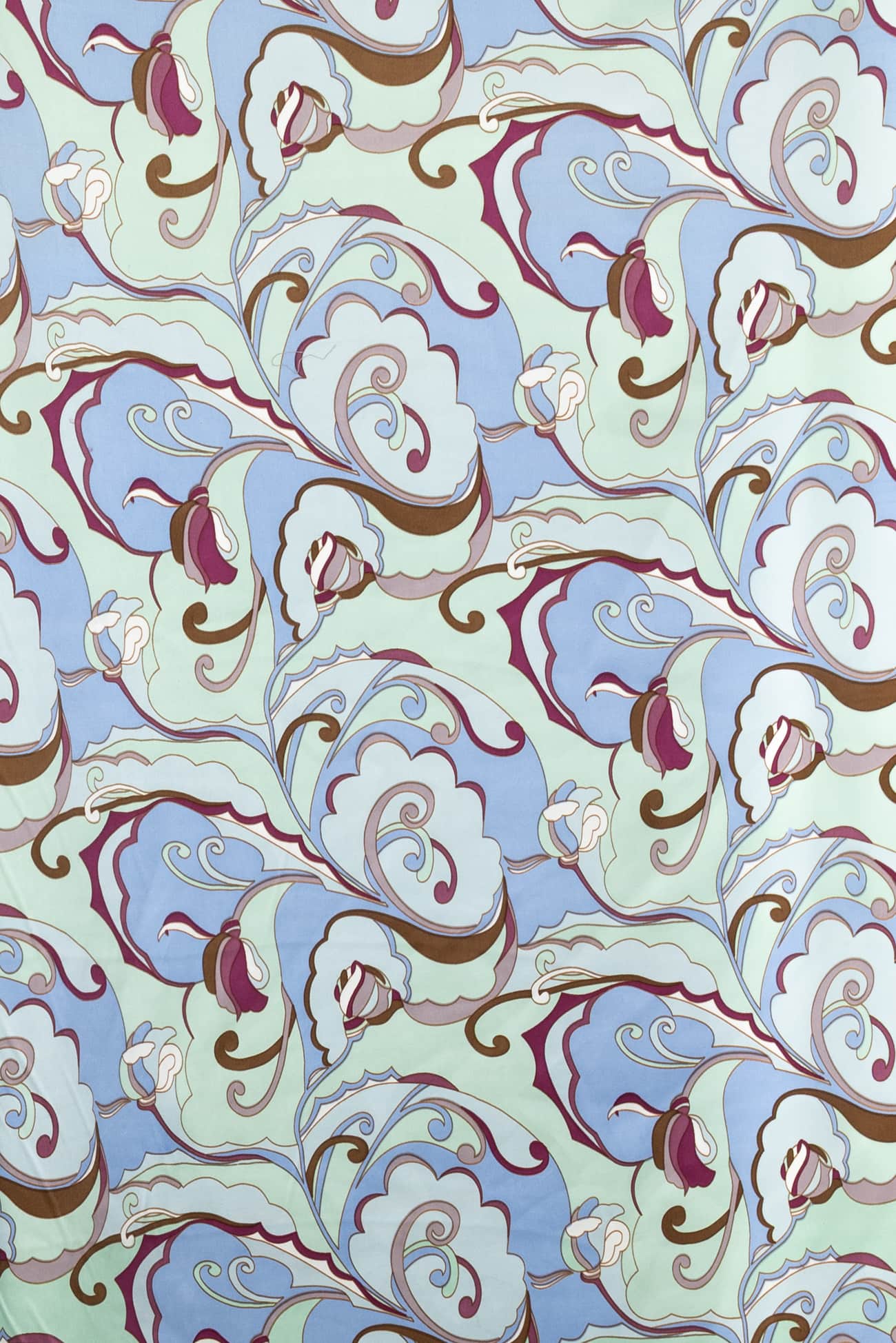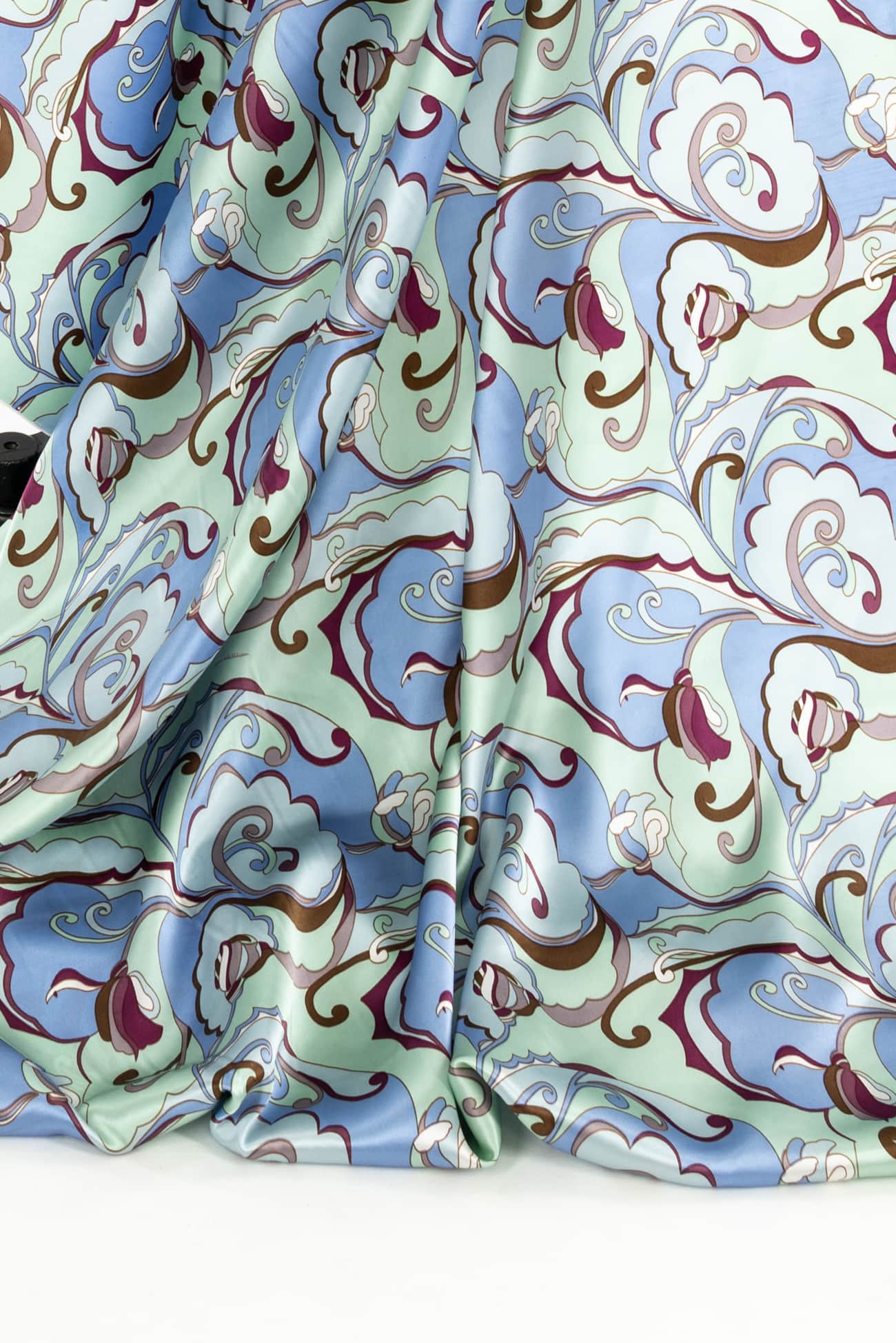 Subtle abstract deco inspired in blue tones with accents of pale green, brown and burgundy, digitally printed on silk crepe de chine, deadstock from an Italian mill produced for NYC designer Maria Conjeo/Zero. Lightweight, opaque, with a buttery, sateen texture, matte on the reverse, and fluid liquid drape. Right for a dress, shirt, blouse, tunic, skirt, kimono, caftan, jumpsuit. Would make a sumptuous lining! One way design, 9" repeat. Limited quantity.
