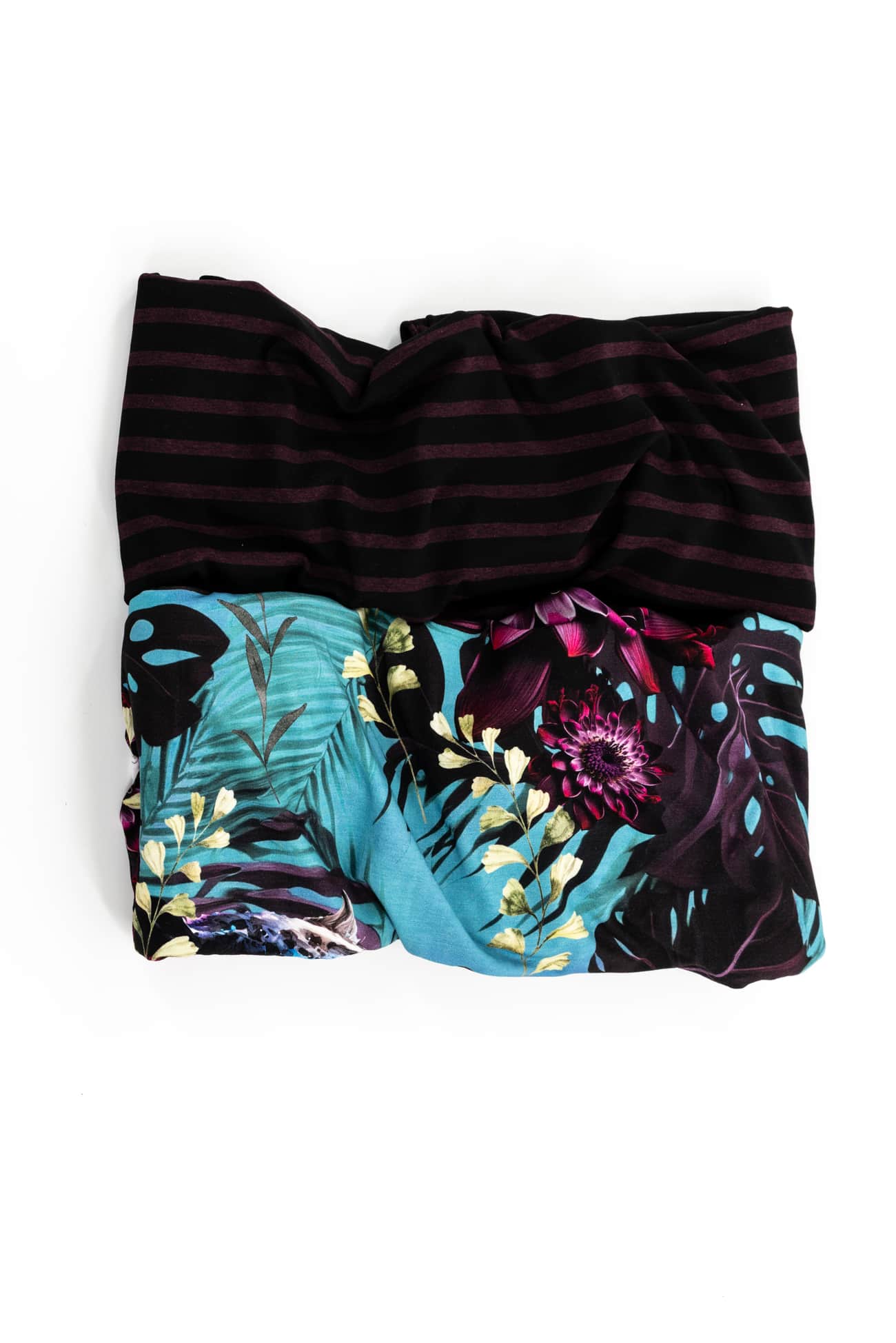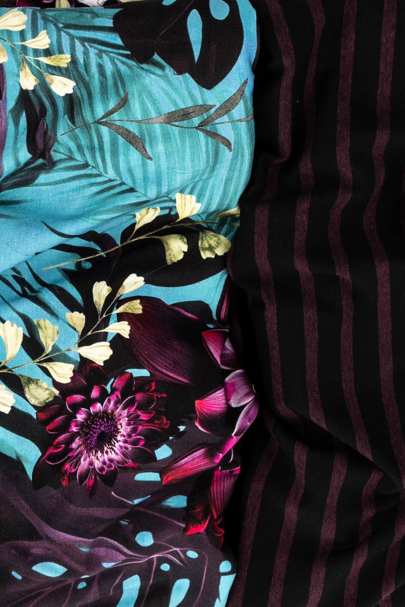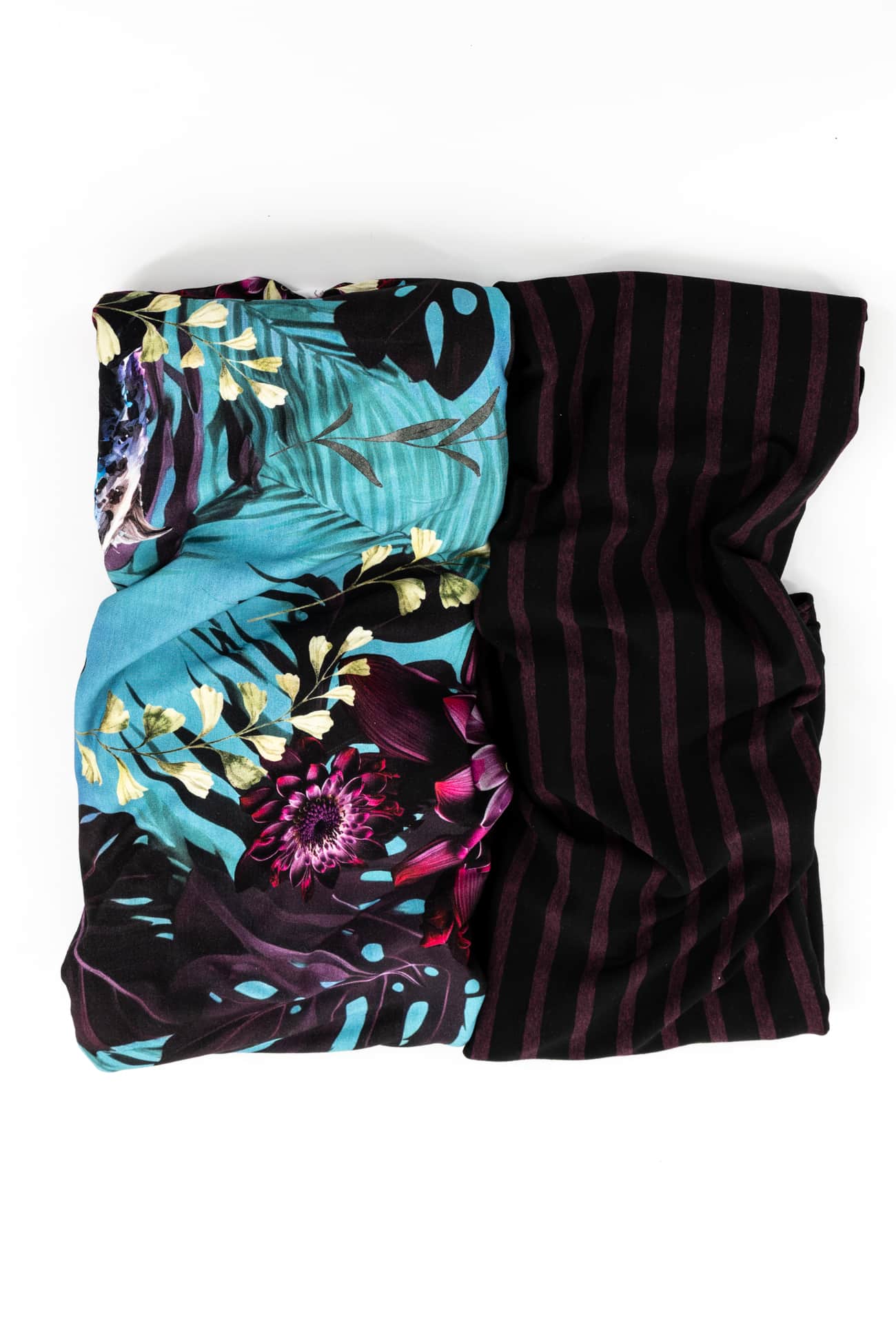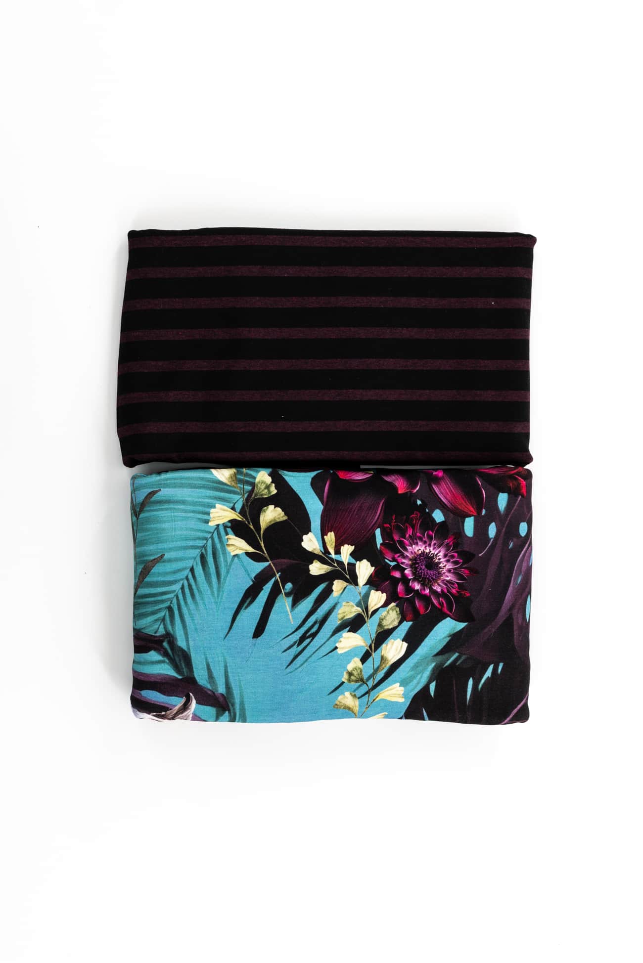The CHATEAU combo combines two harmonious knits; a a dark tone floral European digital viscose/spandex knit that combines well with the plummy purple and black rayon/spandex stripe made in the USA. The two fabrics harmonize and blend beautifully together. Buttery soft with a liquid drape, four-way stretch and just a touch of rolling at the cut edge. The light/mid-weight is right for a top, t-shirt, tunic, cardi, hoodie, dress or skirt.