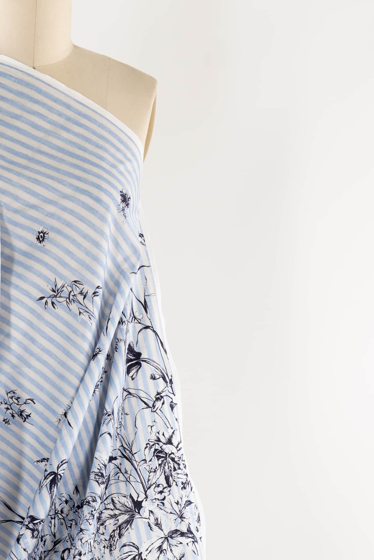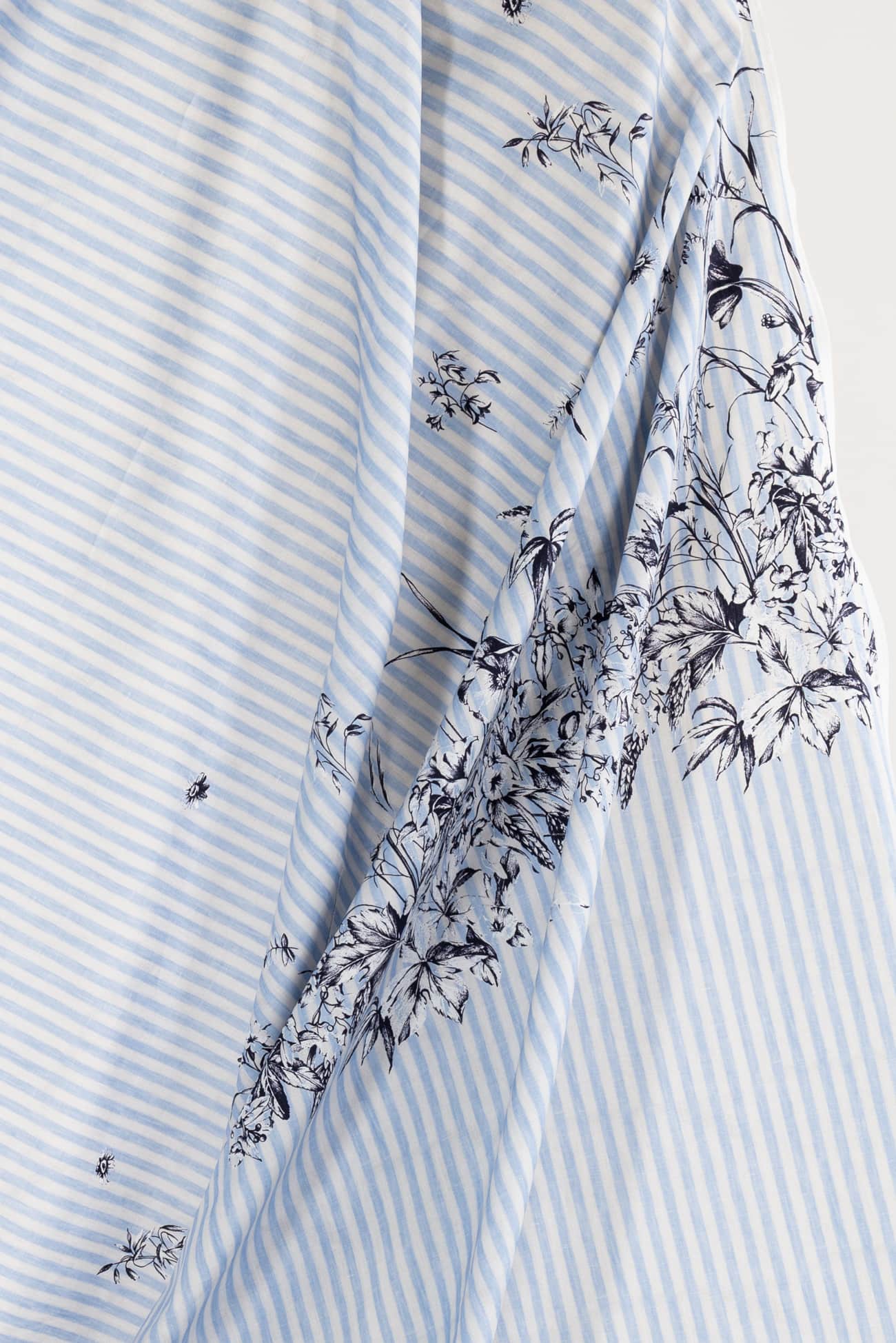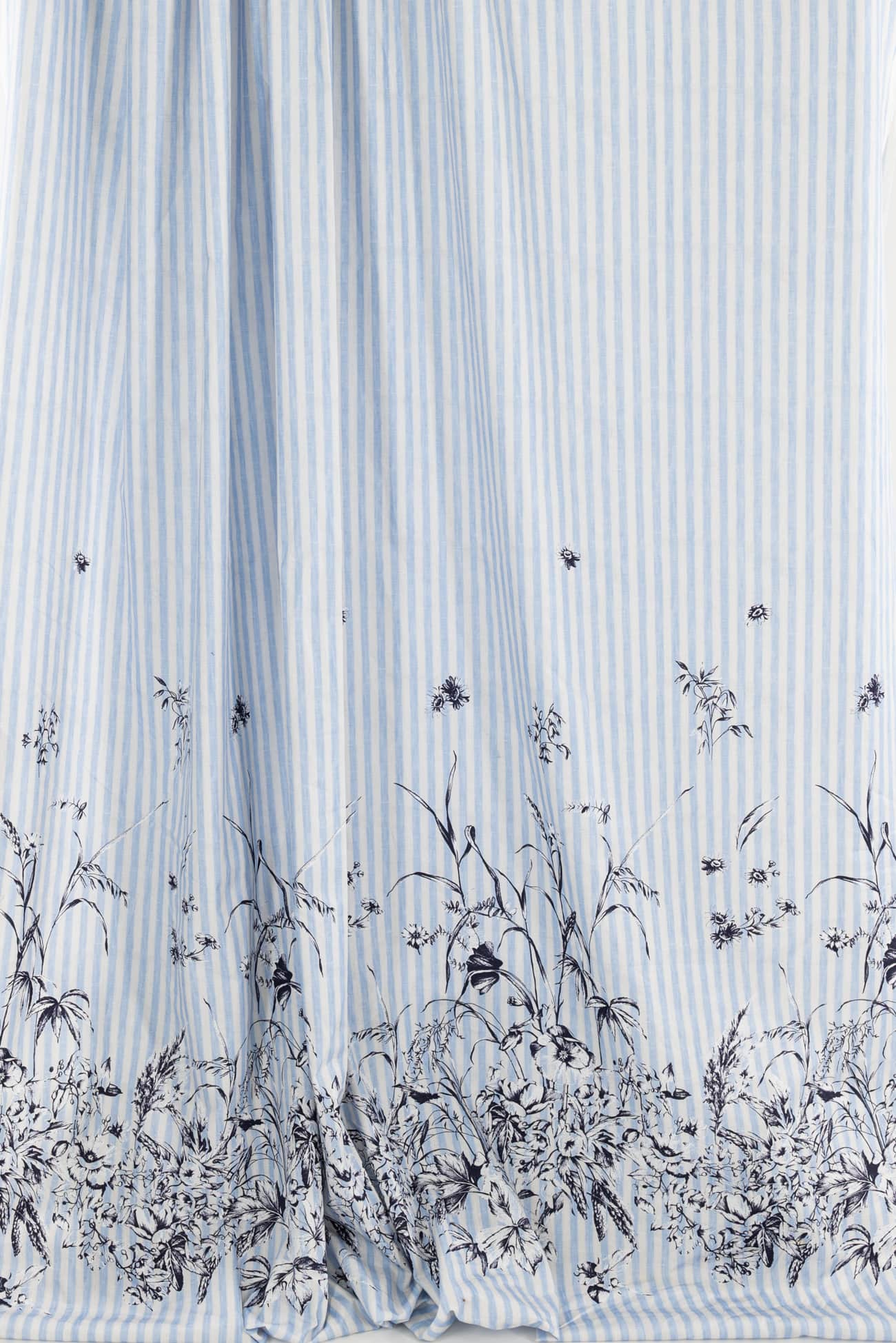 Charming panel stripe+floral print with a modern vibe, soft, faded blue and white printed stripes overprinted in a black etched floral, on impeccable cotton, deadstock from an Italian mill produced for NYC designer Maria Corneo/Zero. Shirting weight with a smooth, cool hand,and soft drape. The weight is right for a shirt, tunic, dress, skirt, soft pant, jumpsuit, caftan, kimono, men's and children's clothes. Panel measures 57" wide x 63" long and is cut with a few inches of stripe left at the bottom of the print. If you order more than one panel we will cut in one piece. One way design. The printed border measures 31".