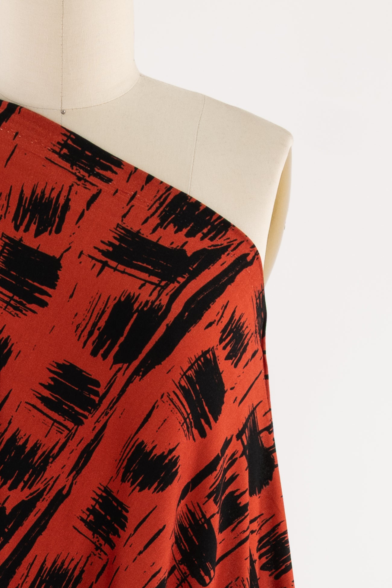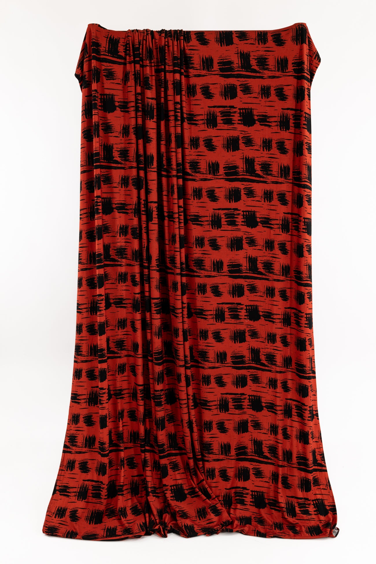 Dramatic hand-painted gestural black brushstrokes on a rich chili pepper/red rayon/lycra knit, in a fine quality deadstock from an LA designer. Lightweight, opaque with 4-way stretch, a smooth hand, 12¾" repeat and some rolling at the cut edge. Right for a top, t-shirt, tunic, dress, loungewear, caftan, men's or children's. Limited quantity available.