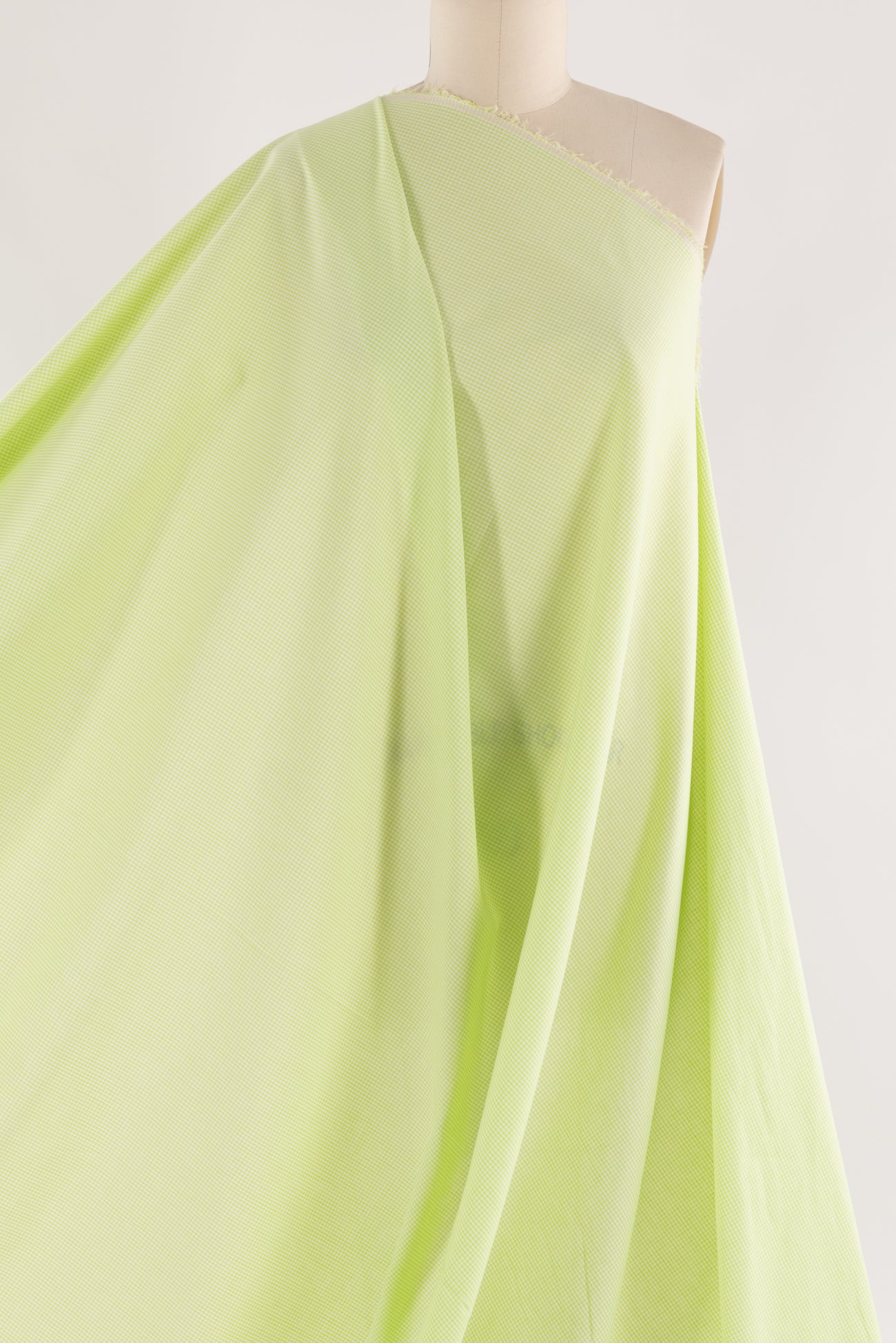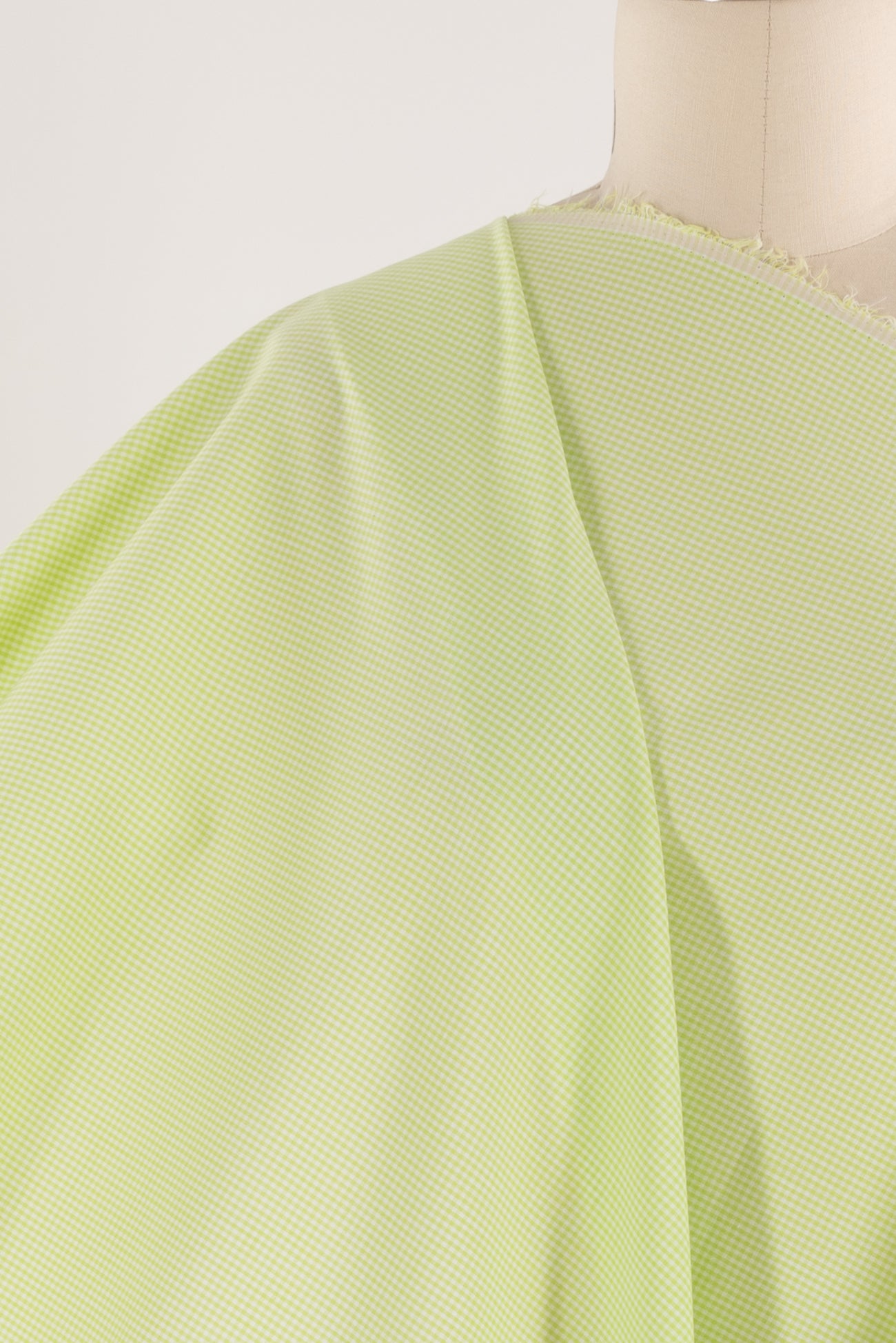 Tiny citrine green and white yarn-dyed gingham checks on an impeccable quality cotton woven, deadstock from a NYC designer. Fine grained shirting weight, with an appealing smooth hand and a soft drape. Right for a dress, shirt, tunic, skirt, soft pants, caftan, kimono, children's, or menswear.