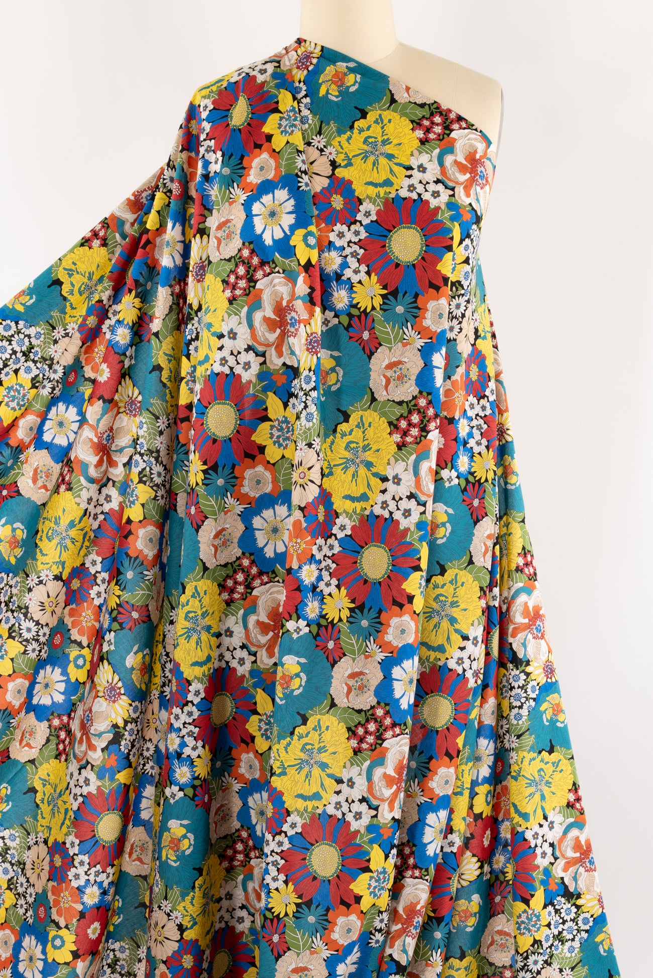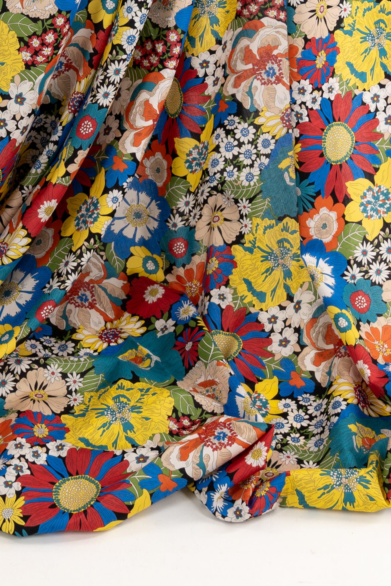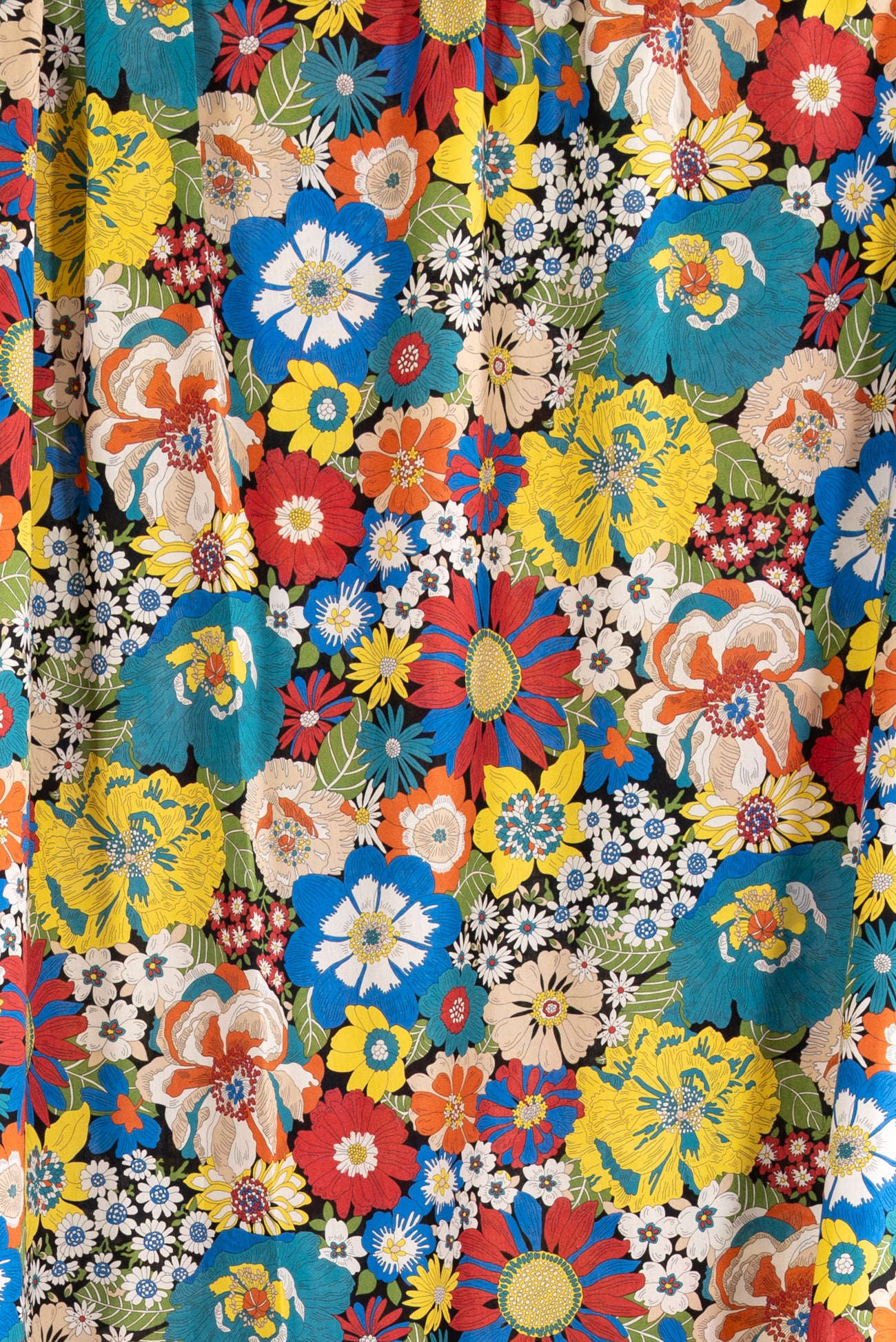 Vibrant classic floral motifs in rich colors on black, inspired by Liberty's archival studio designs. Produced in Northern Italy for Liberty of London, printed on the renowned and exceptional Tana Lawn, the cotton that behaves and feels like silk. Fine-grained, with a cool, smooth, soft hand, fluid drape and depth of color. Perfect for a shirt, dress, skirt, tunic, caftan, loungewear, children's, accessories, or home decor. Right to wear everyday or for statement pieces. One-way design, 12¼" repeat. OEKO-TEX® certified.