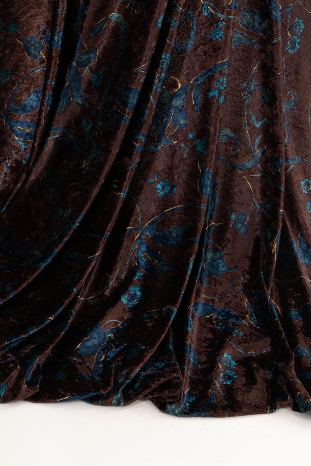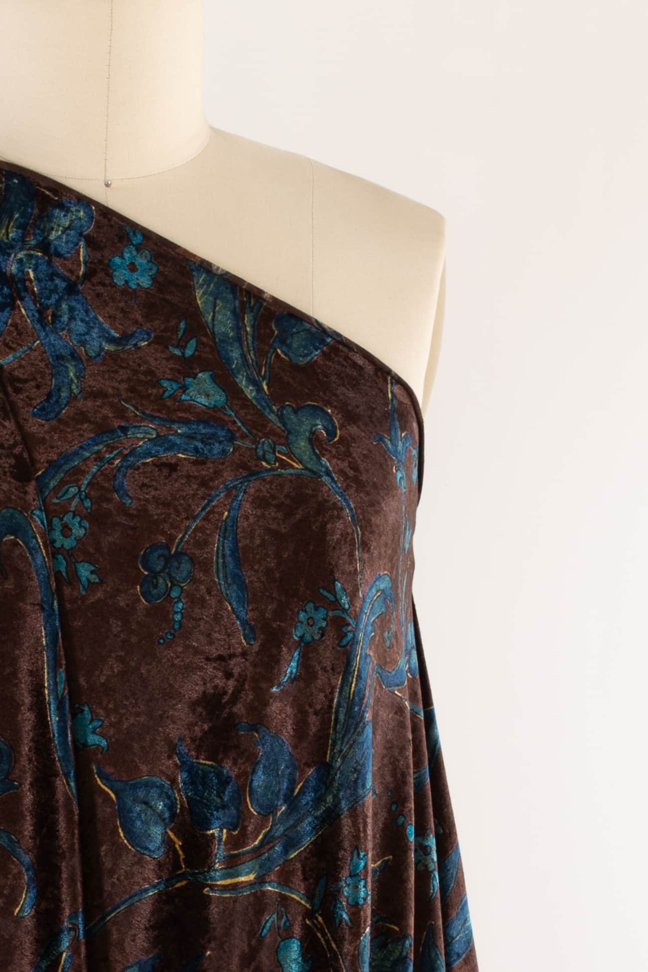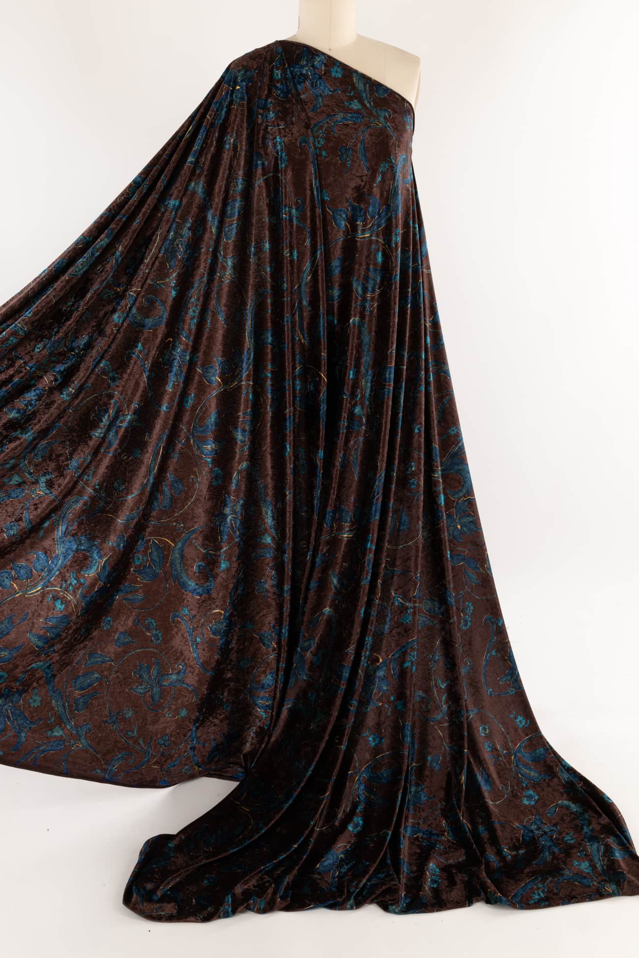 Rich teal and brown etched with gold airy botanical print panne velvet knit, deadstock from an LA designer. A type of crushed velvet, panne is produced by forcing the pile in a single direction by applying pressure resulting in a soft overall crushed texture. Lightweight with a soft velvety hand, silky smooth on the back side, a fluid drape with crosswise stretch, and excellent recovery. Cut for nap, 24" repeat. A fabric to dress up or down; right for a top, t-shirt, dress, skirt, cardigan, hoodie, jacket, kimono, or soft pants.