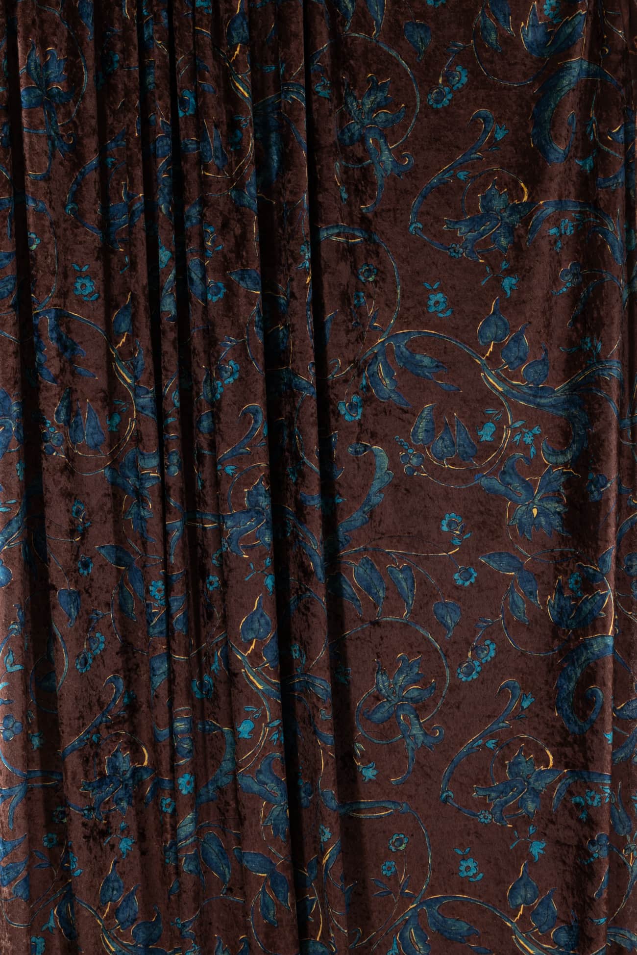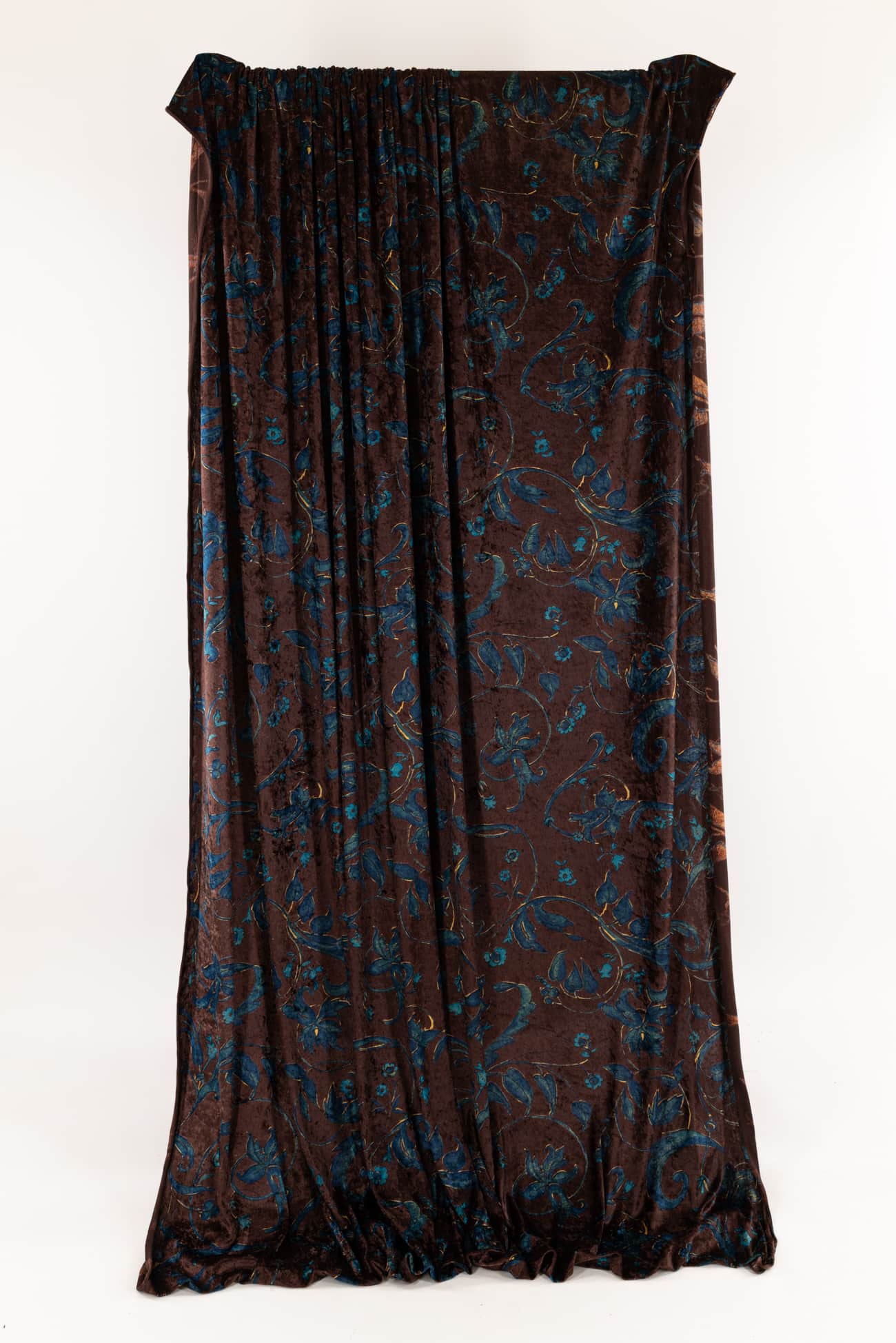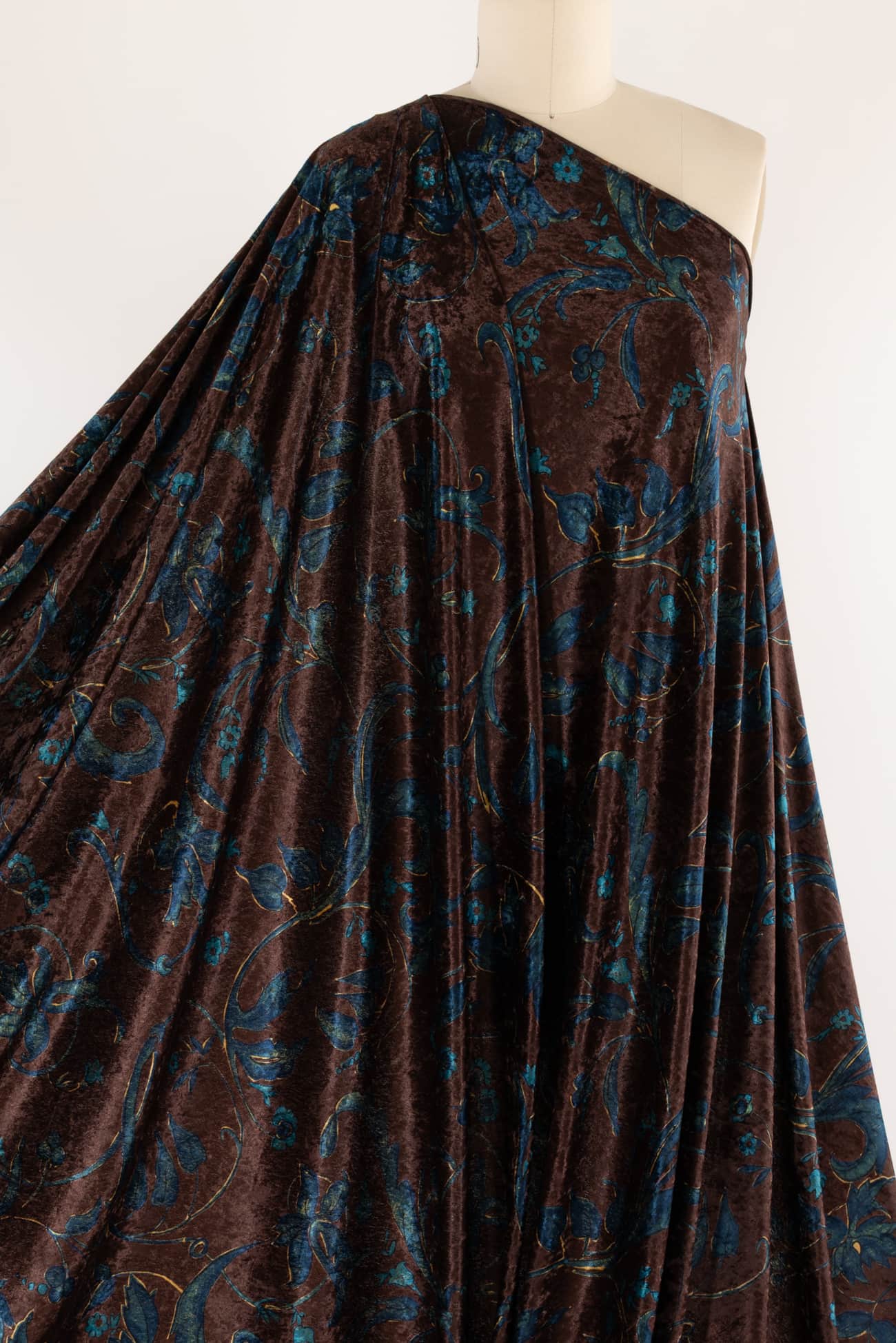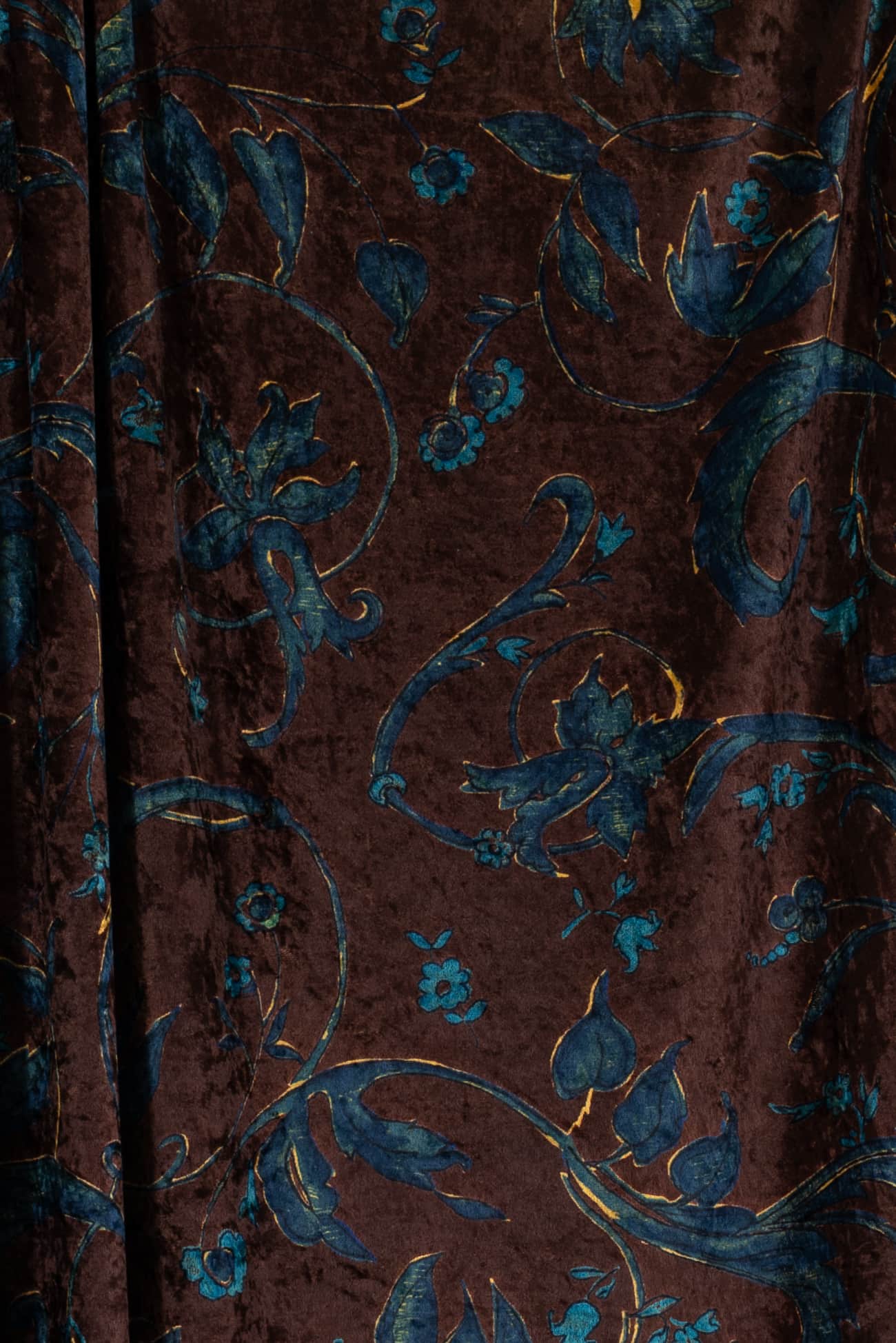Rich teal and brown etched with gold airy botanical print panne velvet knit, deadstock from an LA designer. A type of crushed velvet, panne is produced by forcing the pile in a single direction by applying pressure resulting in a soft overall crushed texture. Lightweight with a soft velvety hand, silky smooth on the back side, a fluid drape with crosswise stretch, and excellent recovery. Cut for nap, 24" repeat. A fabric to dress up or down; right for a top, t-shirt, dress, skirt, cardigan, hoodie, jacket, kimono, or soft pants.