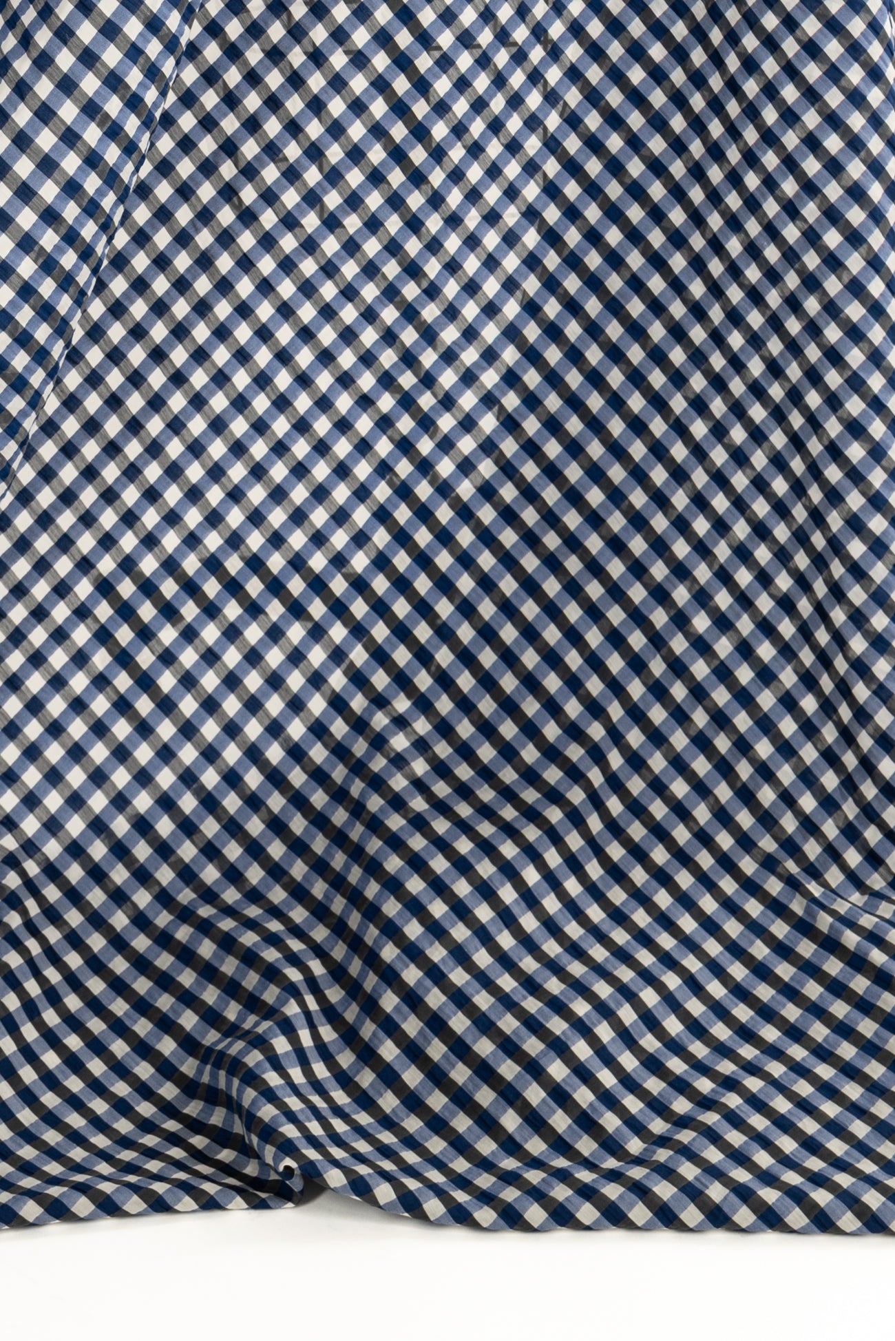 Cheerful black, white and blue gingham seersucker, fine quality deadstock from an LA designer. Lightweight, opaque, with an appealing lightly textured hand and lightly crisp airy drape. Right for a shirt, dress, skirt, kimono, caftan, loungewear, men's or children's wear.