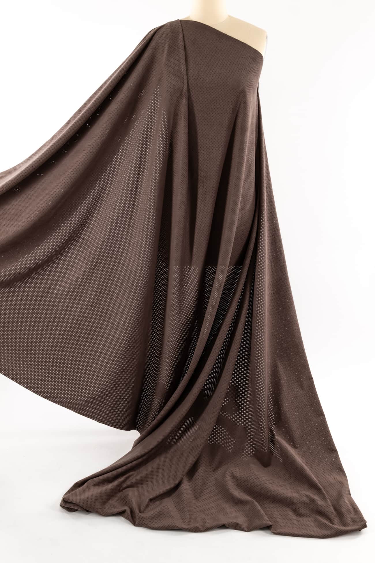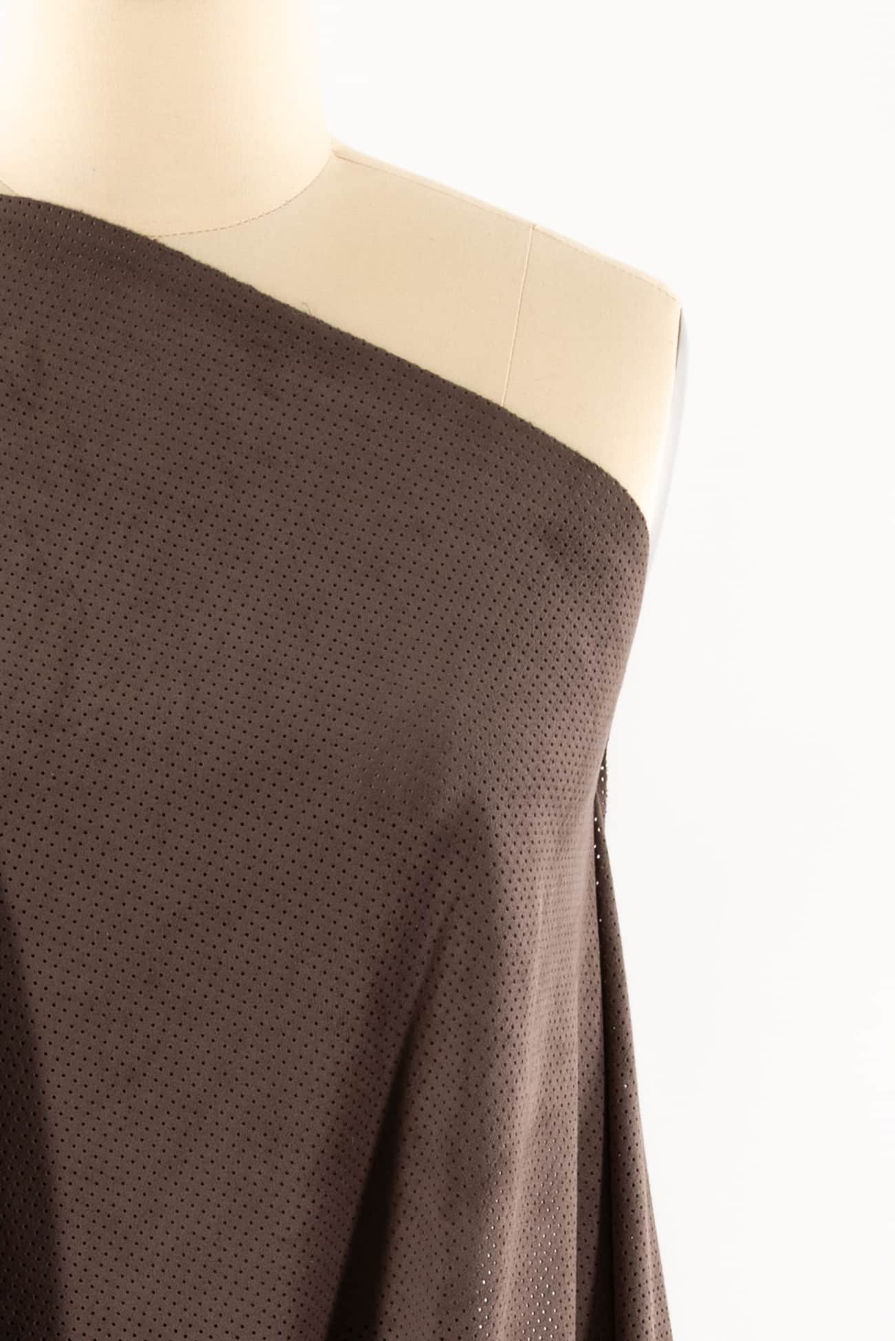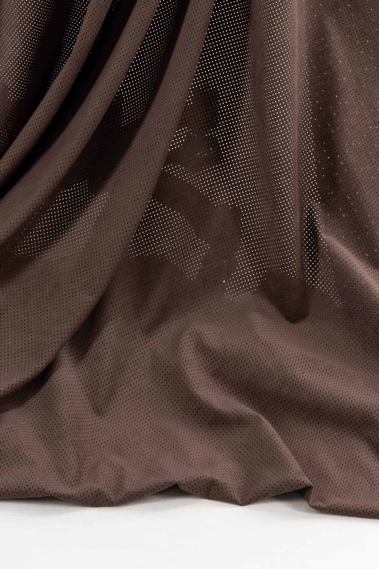 Pale subtle cool toned cocoa fashion/garment weight ultrasuede* has tiny allover mechanically stamped perforations. Produced in Japan, deadstock from an LA designer - new fabric from vintage stock. Soft and supple, with a velvety hand and light drape - the perforations give the fabric a fluid drape. Slight crosswise stretch. Right for a tunic, light jacket or duster coat, vest, skirt, shirt, pants. To line or not.