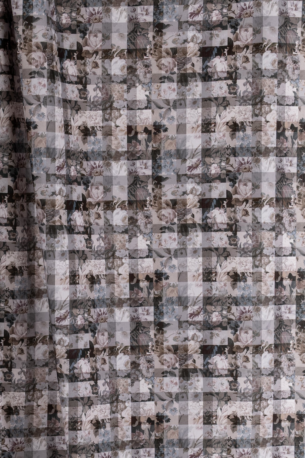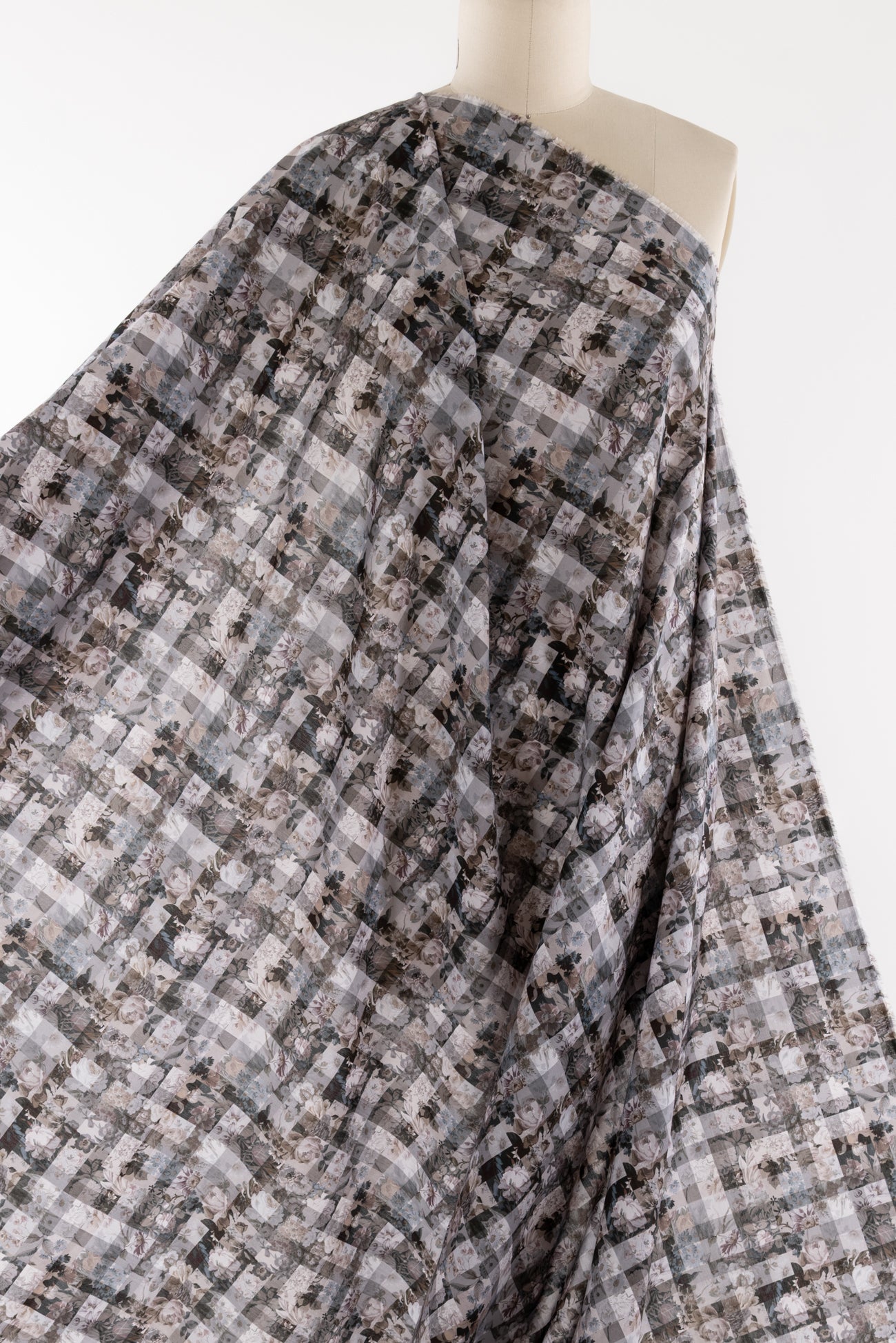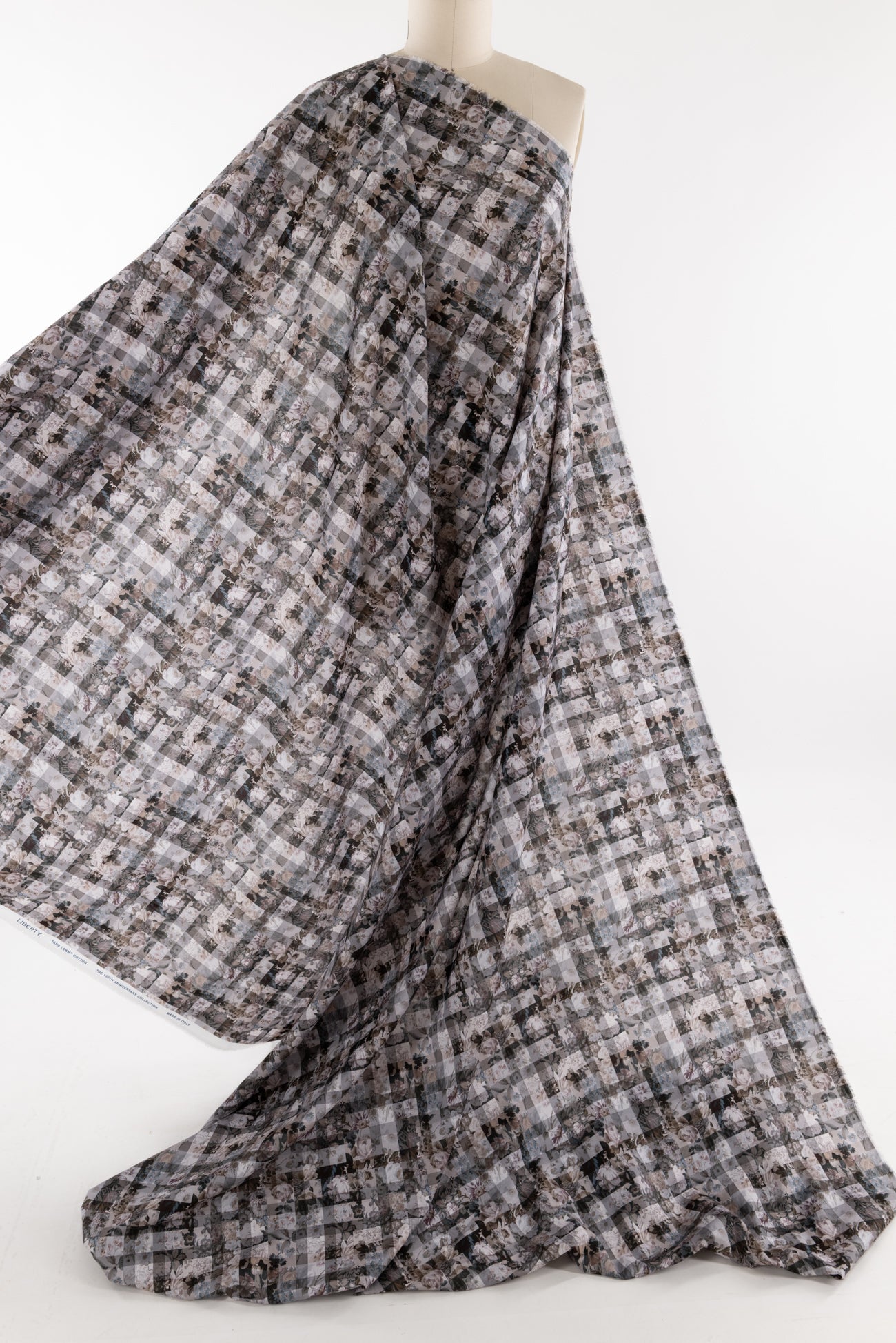 A contemporary transformation of vintage Liberty floral prints in shades of black and mocha, overlaid with a checked geometric grid, produced in Northern Italy for Liberty of London, printed on the renowned and exceptional Tana Lawn, the cotton that behaves and feels like silk. Fine-grained, with a cool, smooth, soft hand, fluid drape, and depth of color. Perfect for a shirt, dress, skirt, tunic, soft pant, caftan, loungewear, children's or men's clothes, accessories, or home decor. Right to wear everyday or for statement pieces. One-way design 8¼" repeat. OEKO-TEX® certified.