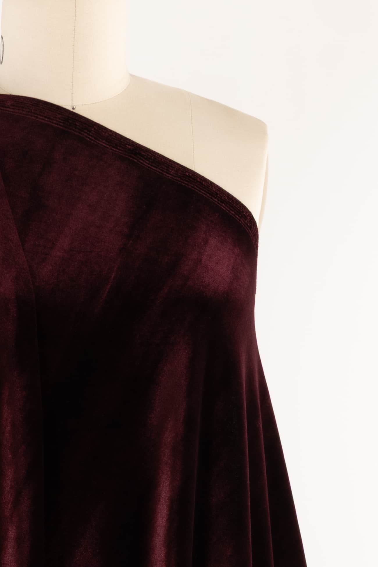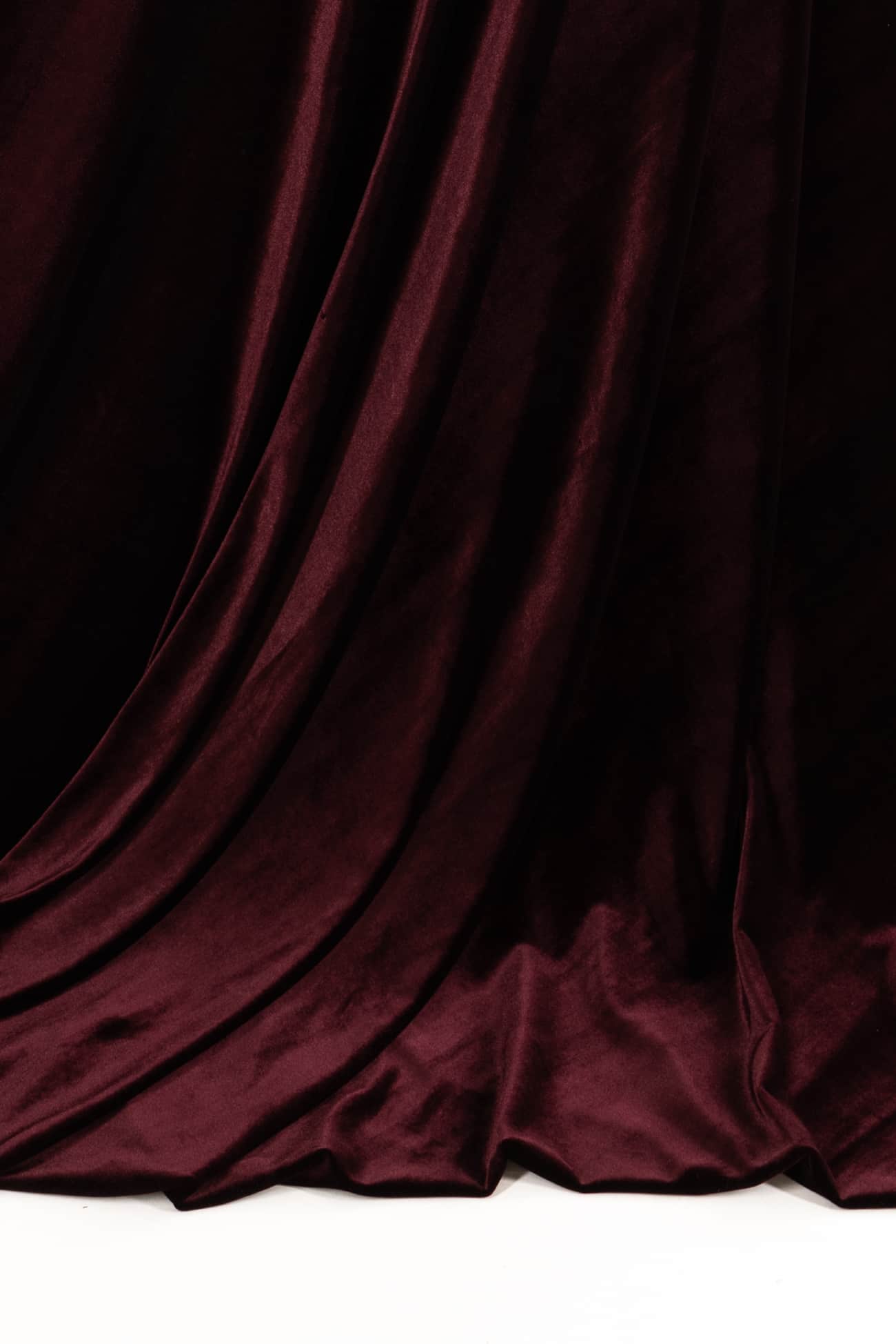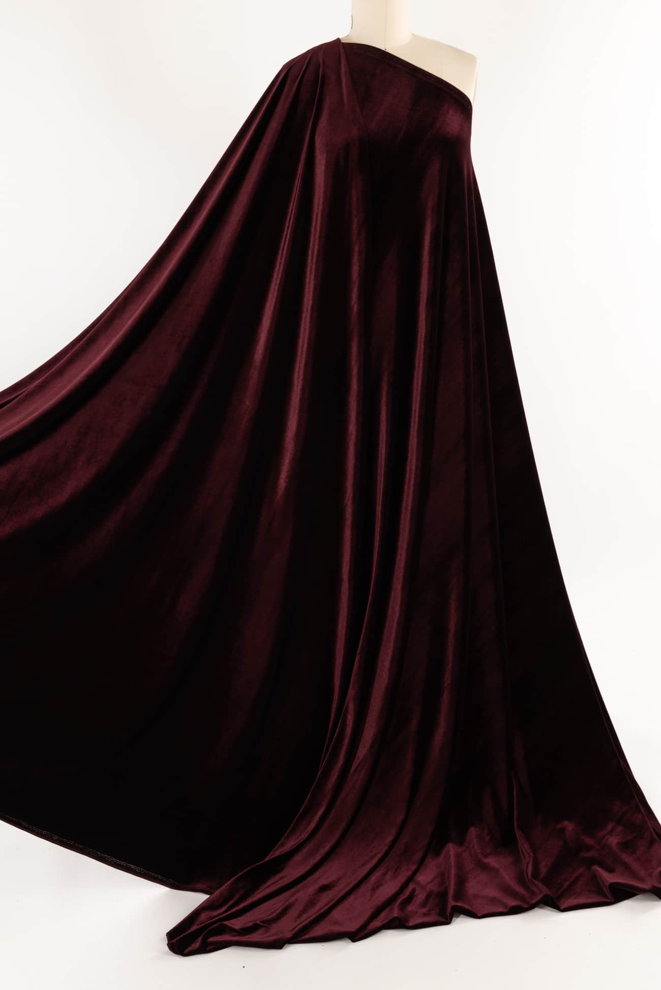 Color saturated deep cranberry red in a classic velvet knit, deadstock from an LA designer with a soft overall texture. Lightweight with a soft velvety hand, silky smooth on the back side, a fluid drape with crosswise stretch, and excellent recovery. Cut for nap. A fabric to dress up or down; right for a top, t-shirt, dress, skirt, cardigan, hoodie, jacket, kimono, or soft pants.