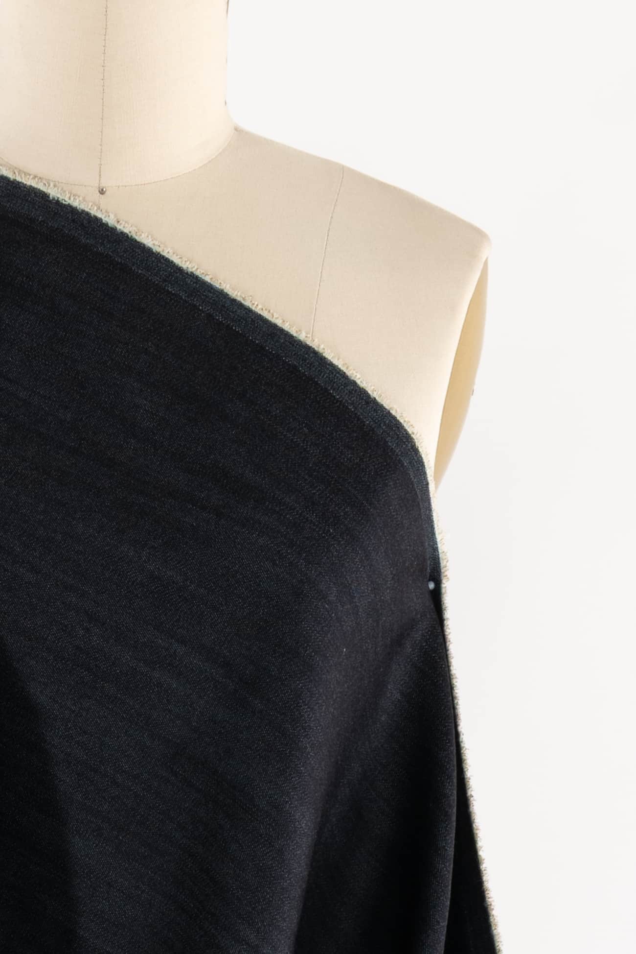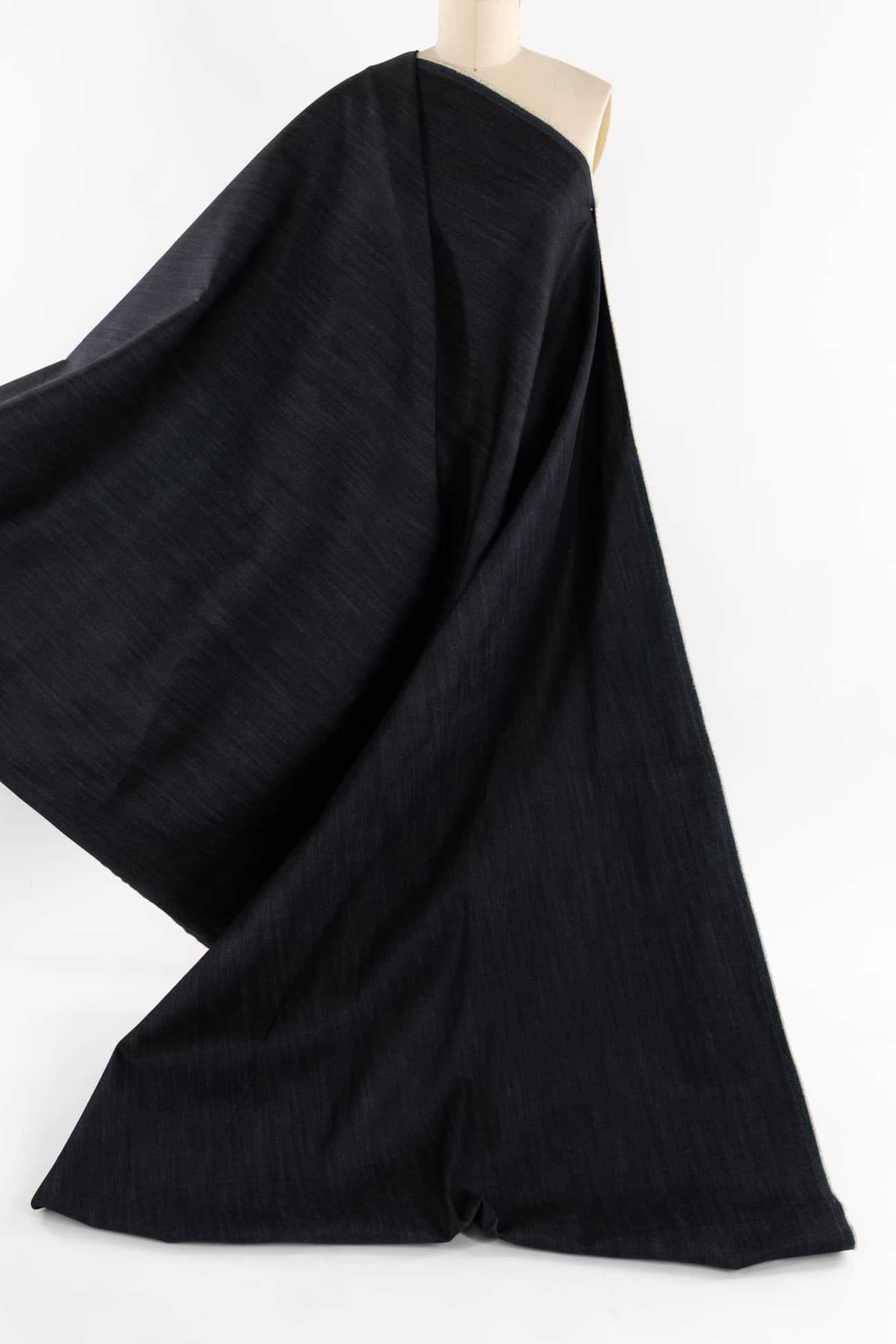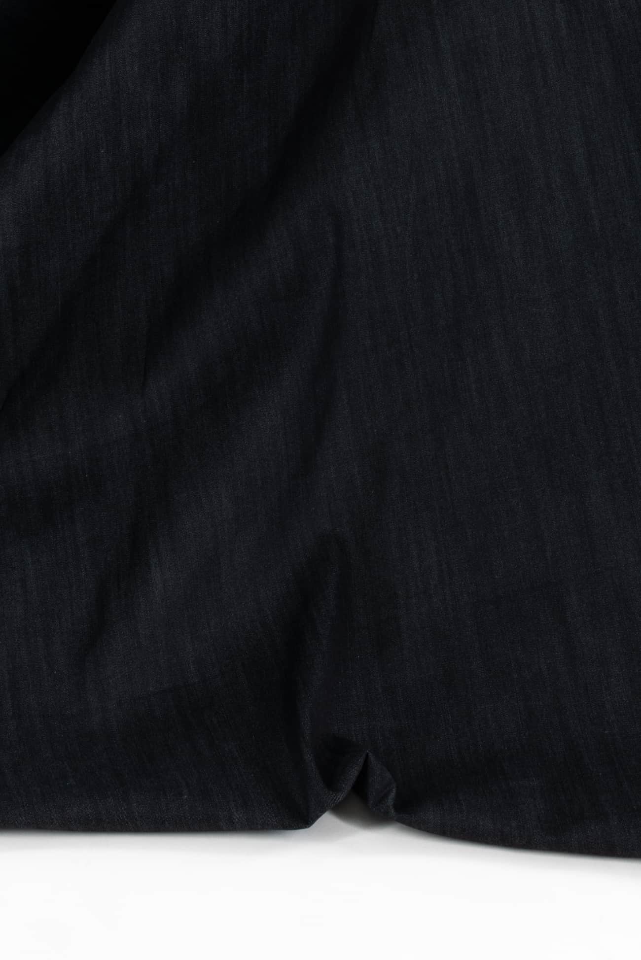 Deep navy stretch denim, fine quality deadstock from a New York designer. Heavyweight with a smooth hand, crisp sculptural drape and some crosswise stretch with good recovery. Right for a jacket, coat, jeans, dress, vest, pants, skirt or workwear.