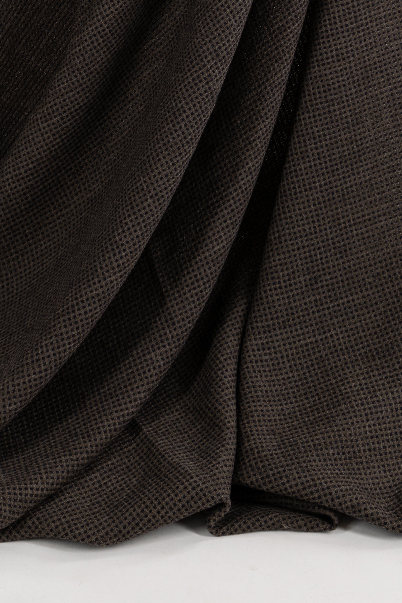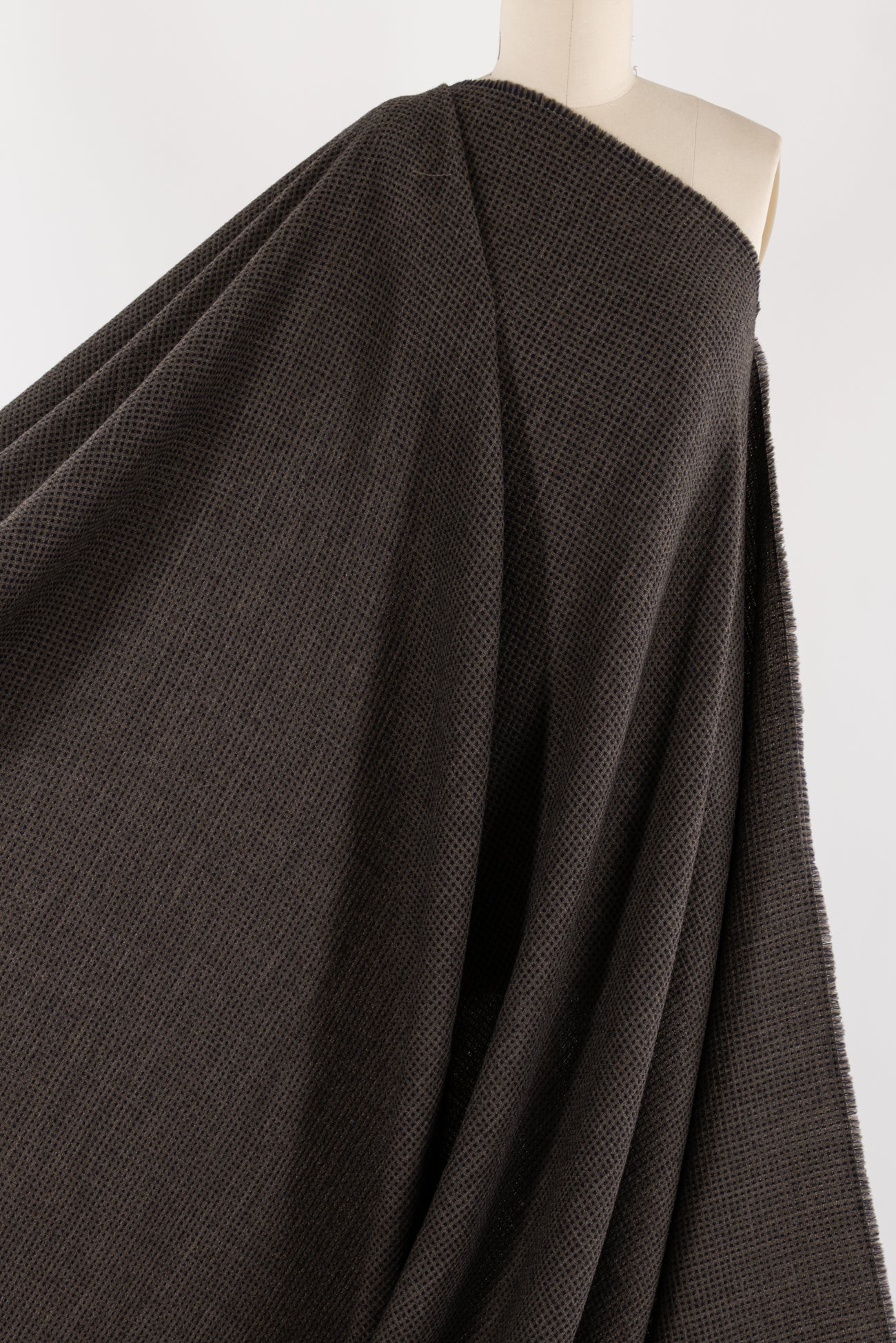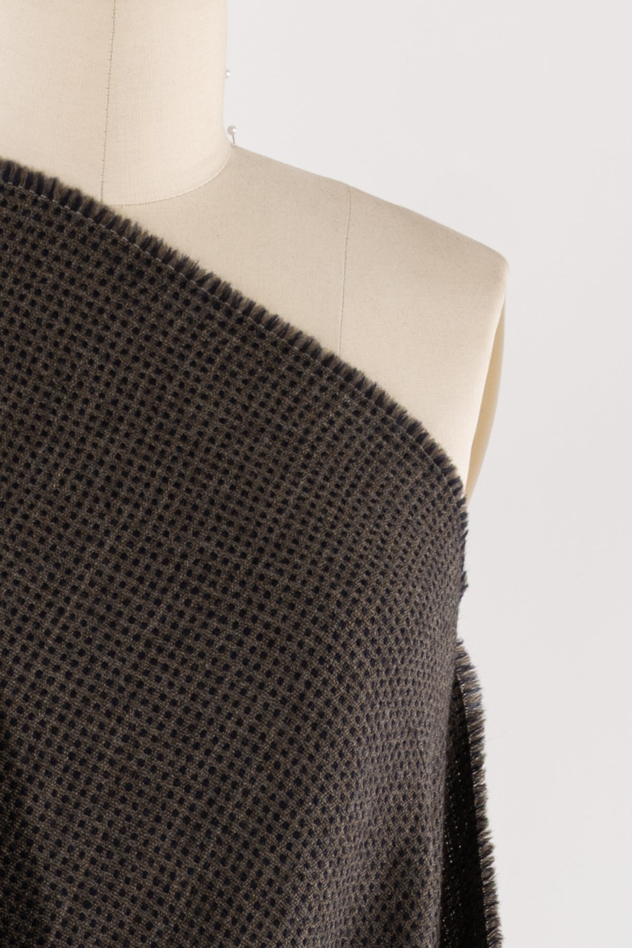 Elegant basket woven grid in black and cocoa, fine quality wool blend deadstock from an Italian mill. Mid-weight but not thick or heavy, with a softly textured hand and softly structured drape. Right for a jacket (think Ch@nel), vest, coat, skirt or menswear. Limited quantity.