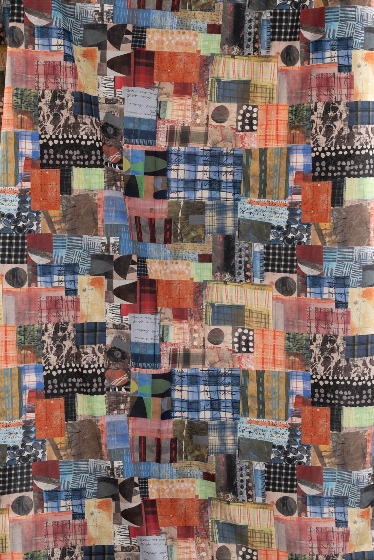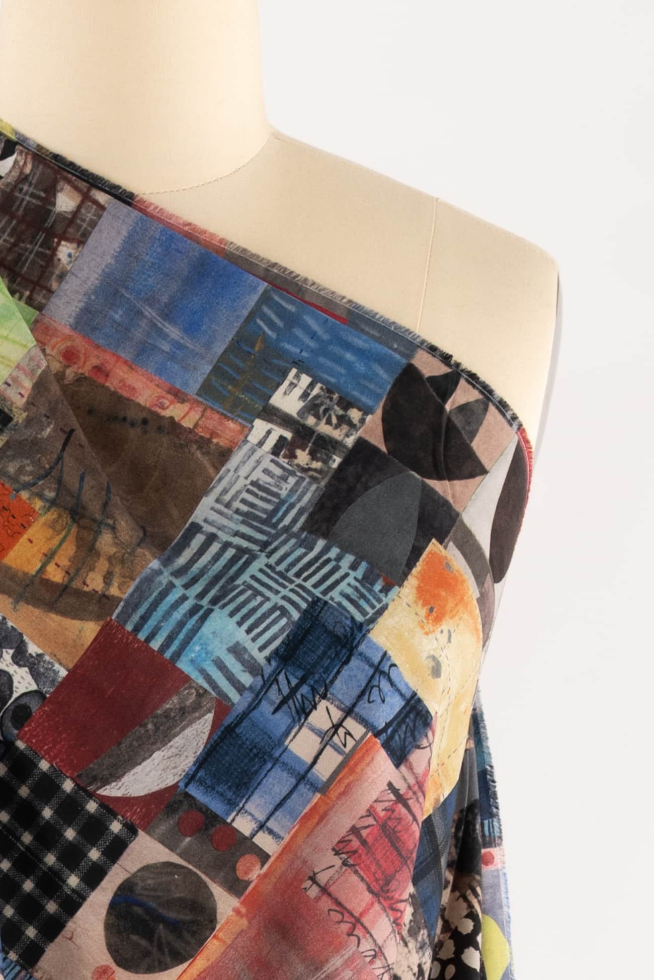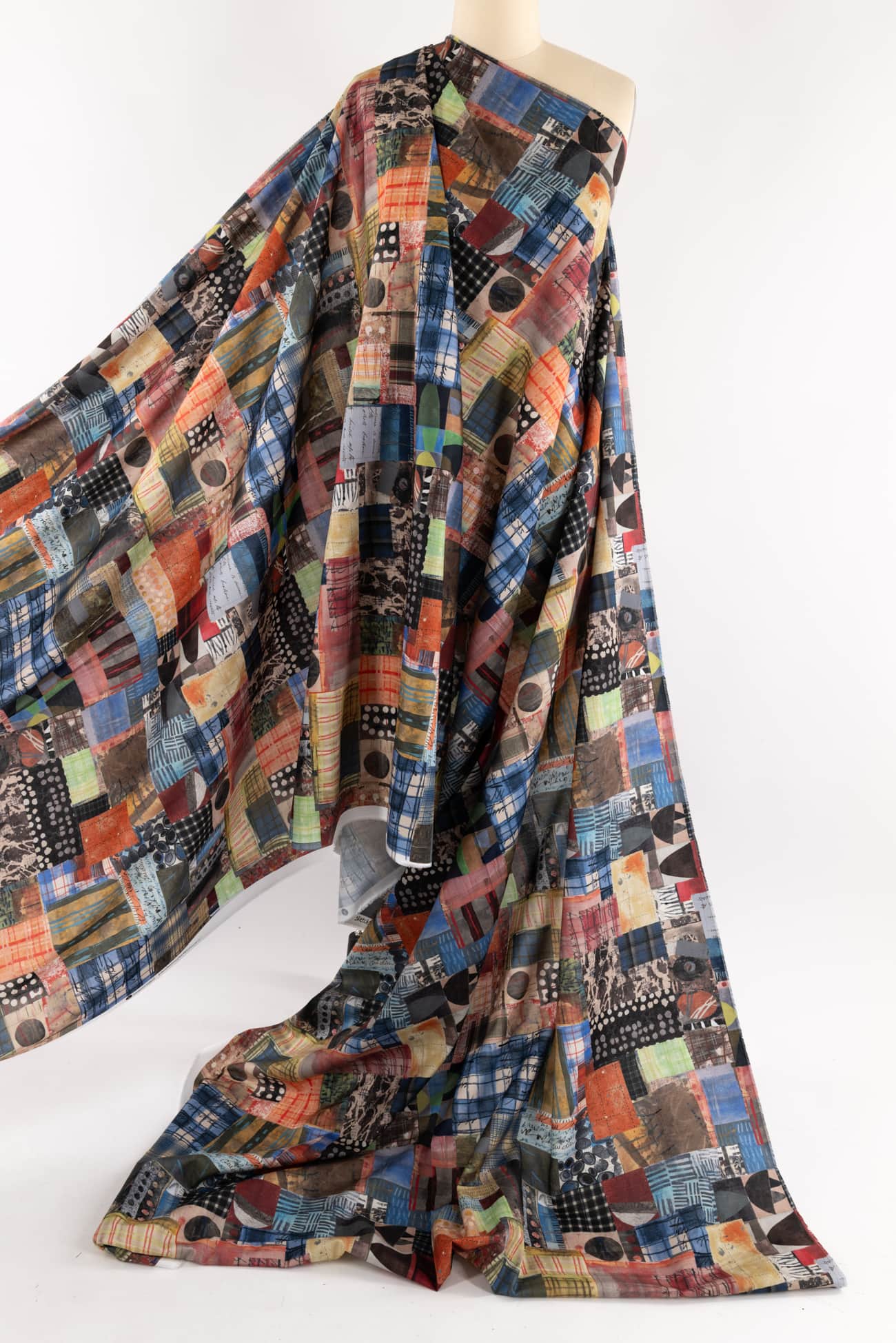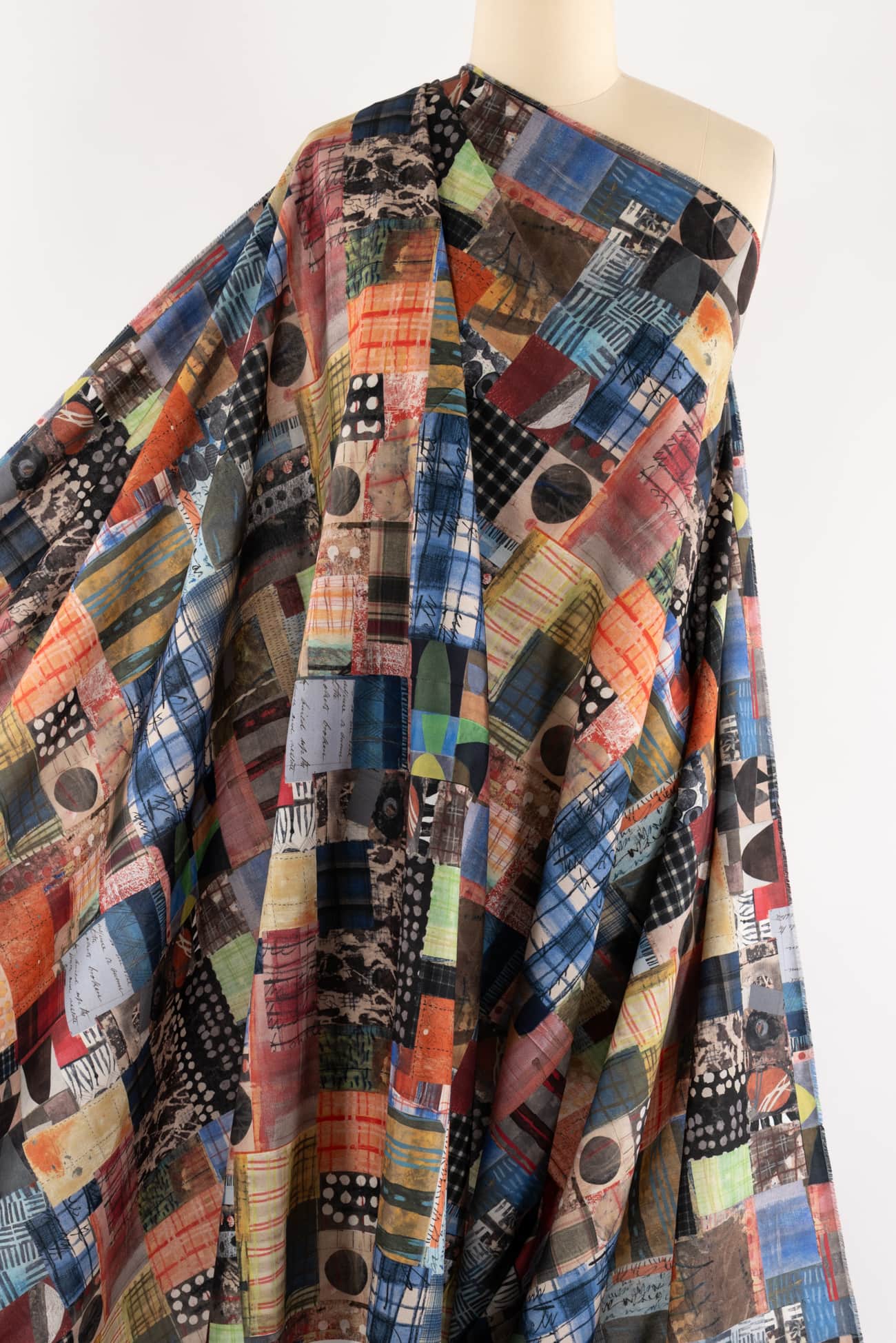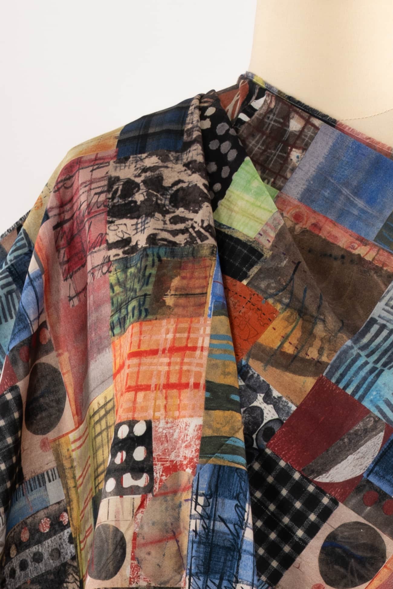 Contemporary arty patchwork collage in rich multicolored shades and colors. Beautiful quality produced in South Korea. The base fabric is an impeccable fine grained shirting/quilting weight cotton with a smooth hand & soft drape. Right for a shirt, dress, skirt, light jacket, vest, pant, caftan, kimono, men's shirt, quilting, accessories or home dec. One way design, 19" repeat.