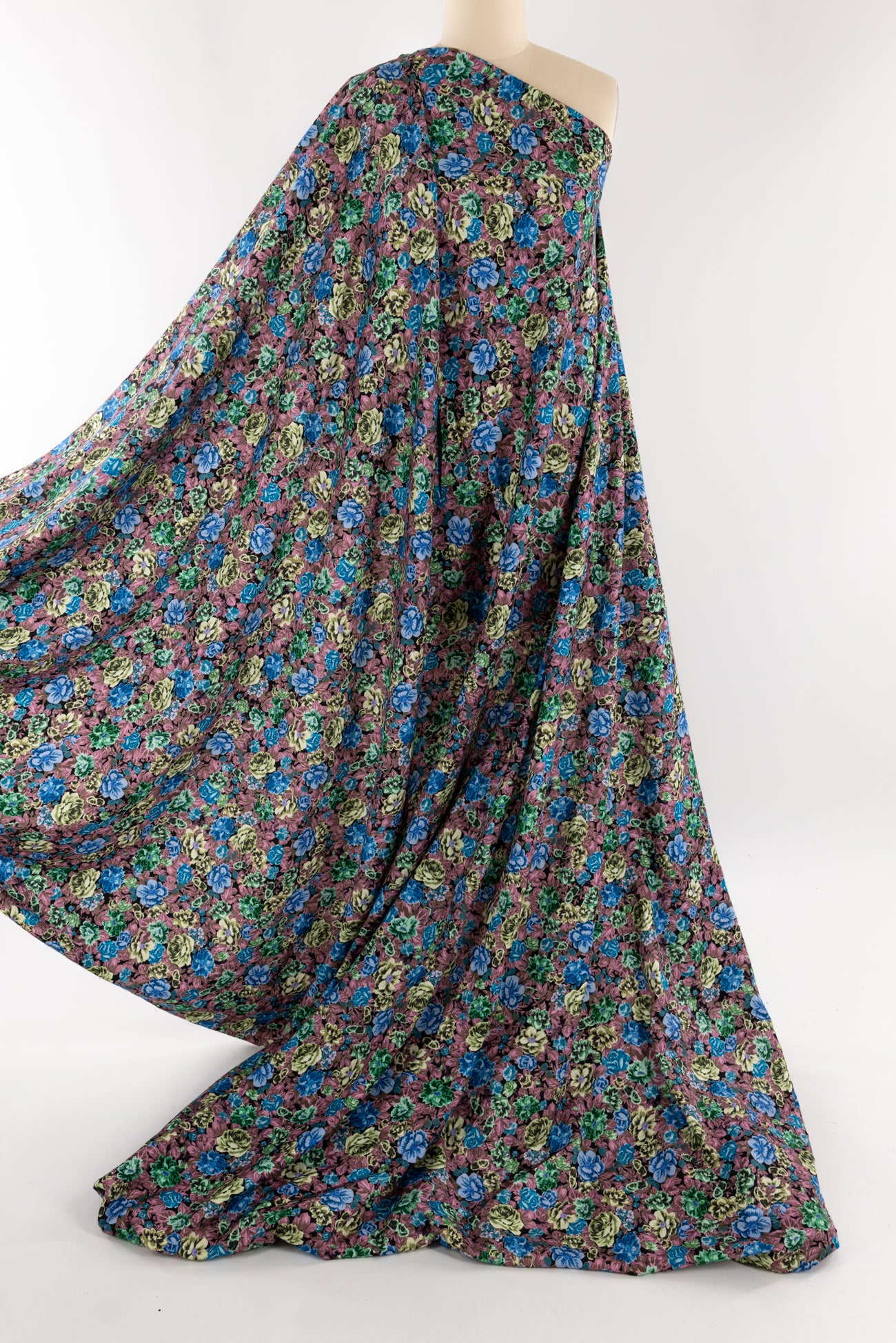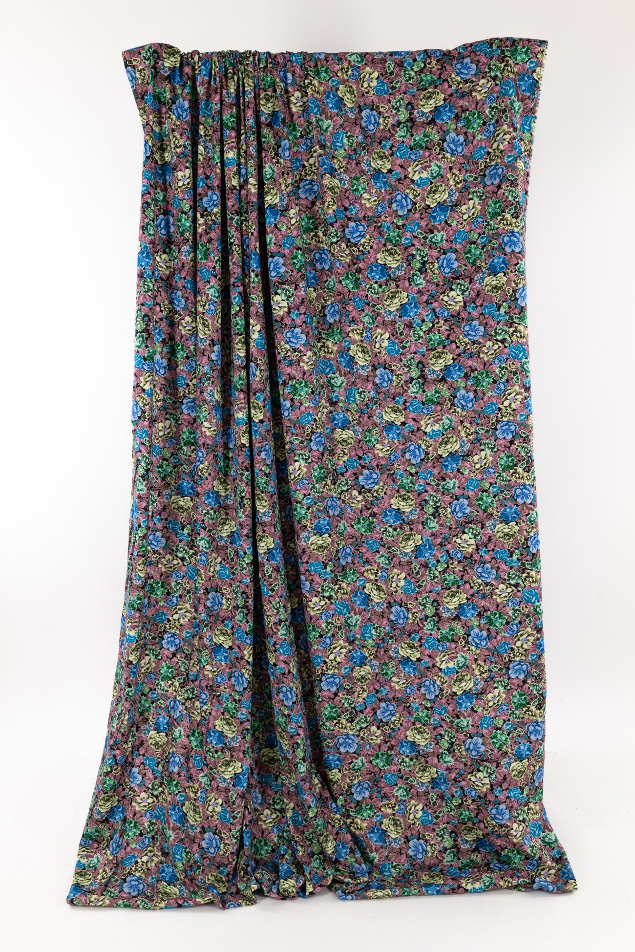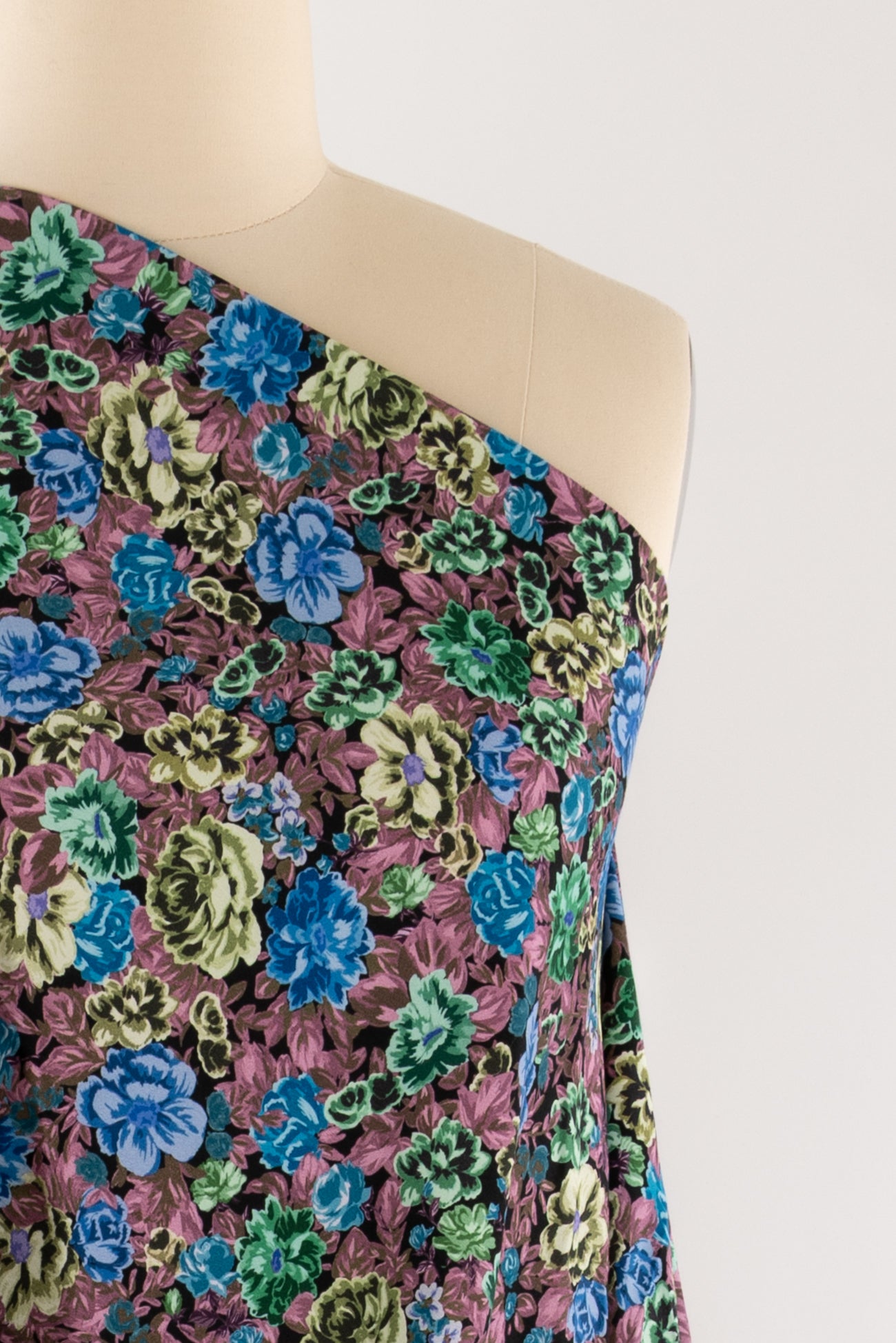 Sweet floral in shades of blue, green and pink on black on a fine quality cotton/spandex, deadstock from an Italian mill. Light/shirting weight, with a soft smooth hand, 19¼" repeat, crosswise stretch and soft drape. Right for a dress, shirt, tunic, skirt, soft pants, kimono, caftan or children's wear.