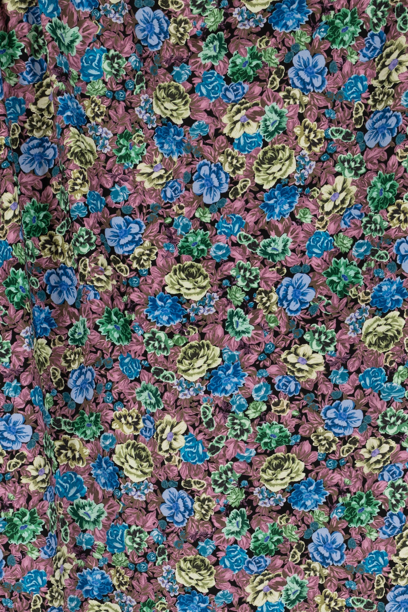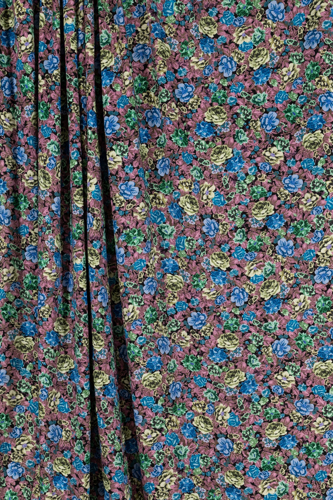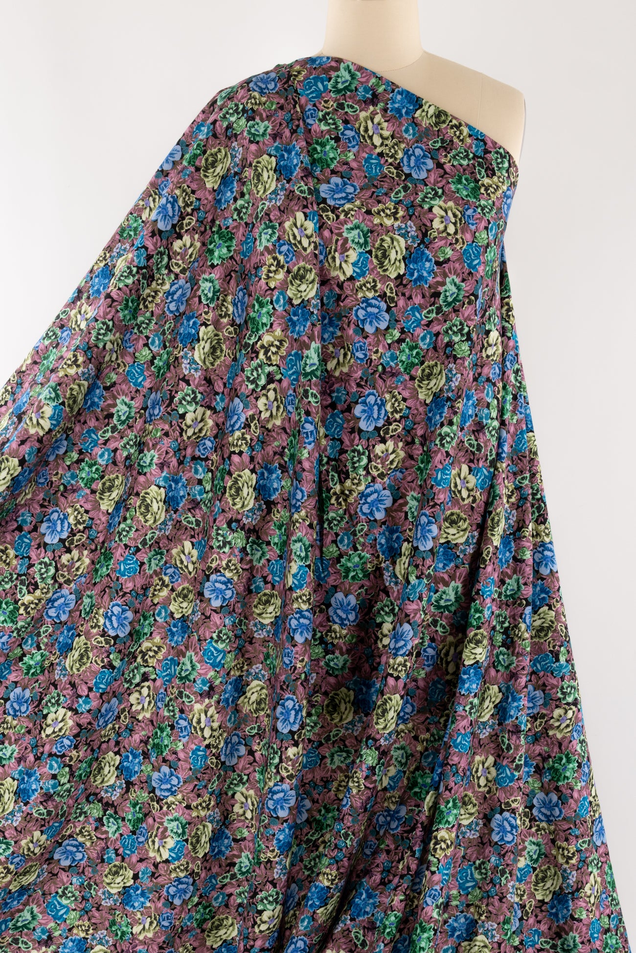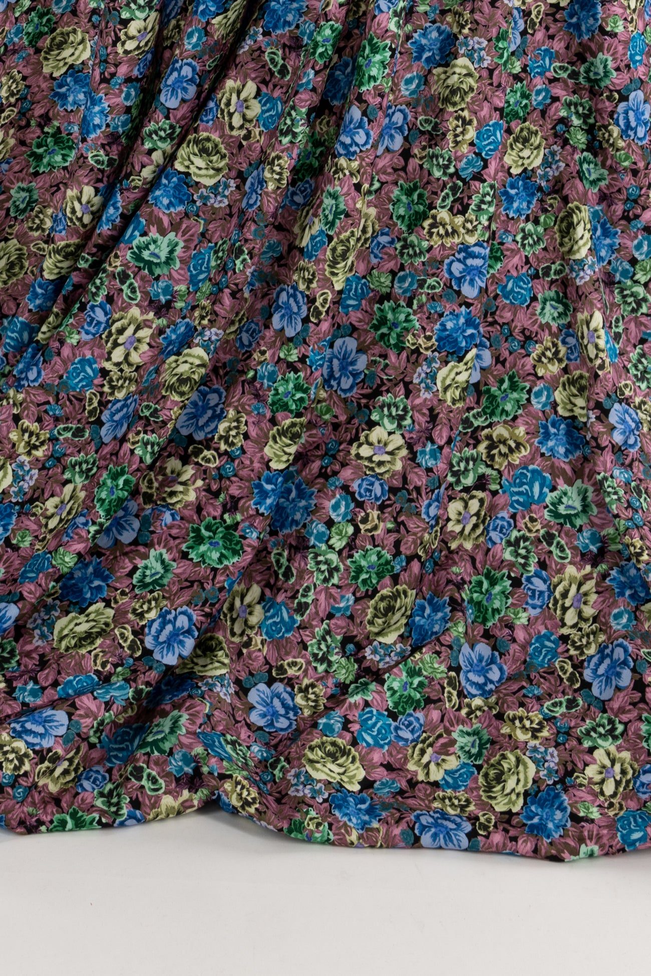 Sweet floral in shades of blue, green and pink on black on a fine quality cotton/spandex, deadstock from an Italian mill. Light/shirting weight, with a soft smooth hand, 19¼" repeat, crosswise stretch and soft drape. Right for a dress, shirt, tunic, skirt, soft pants, kimono, caftan or children's wear.