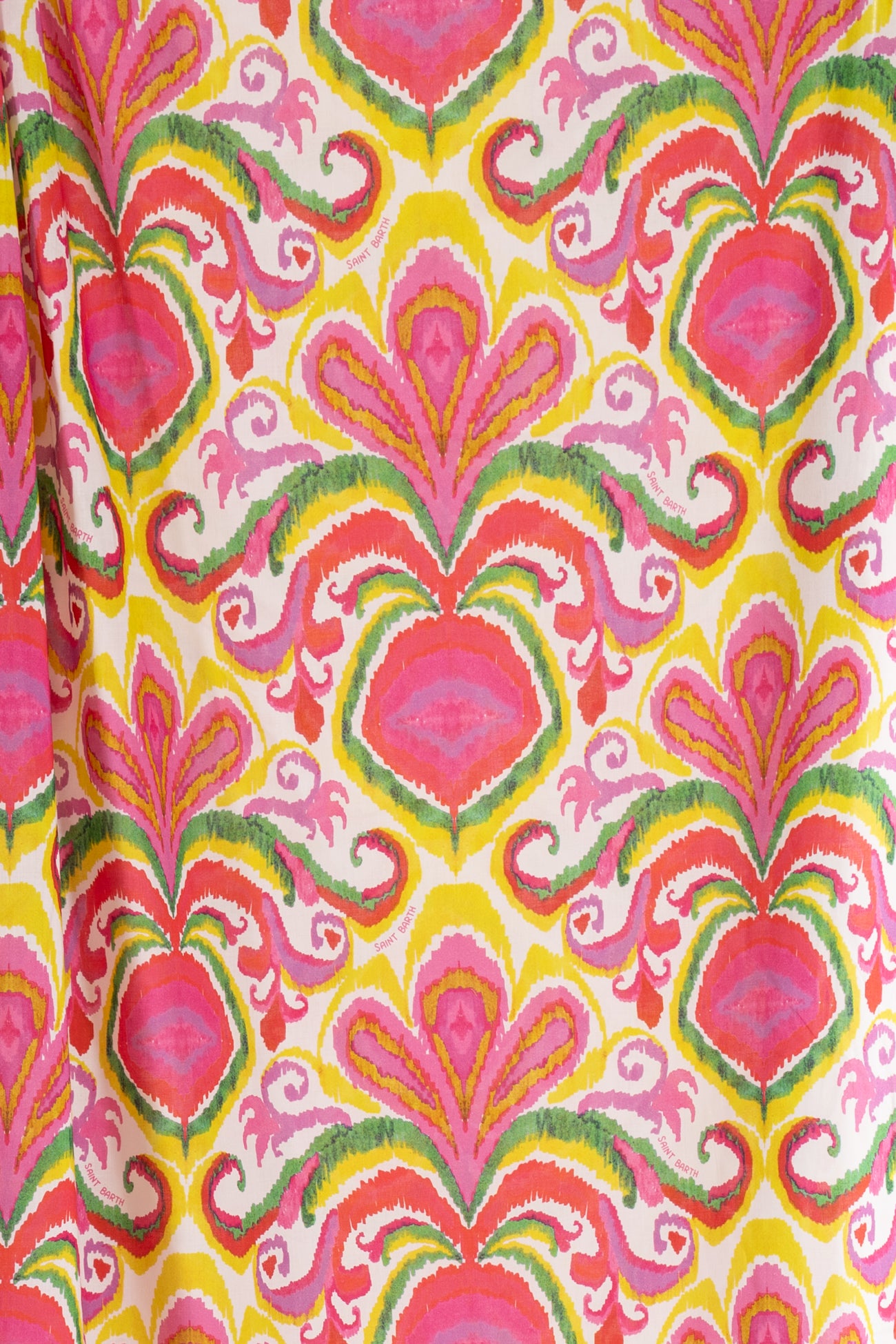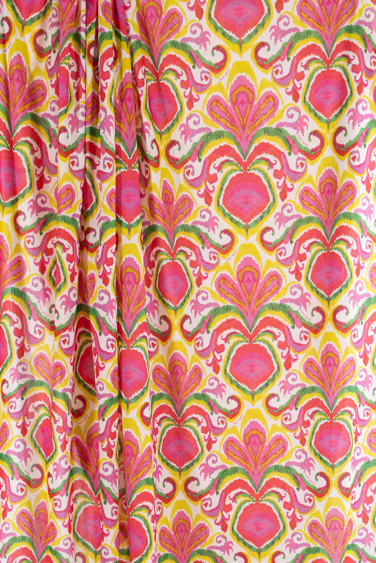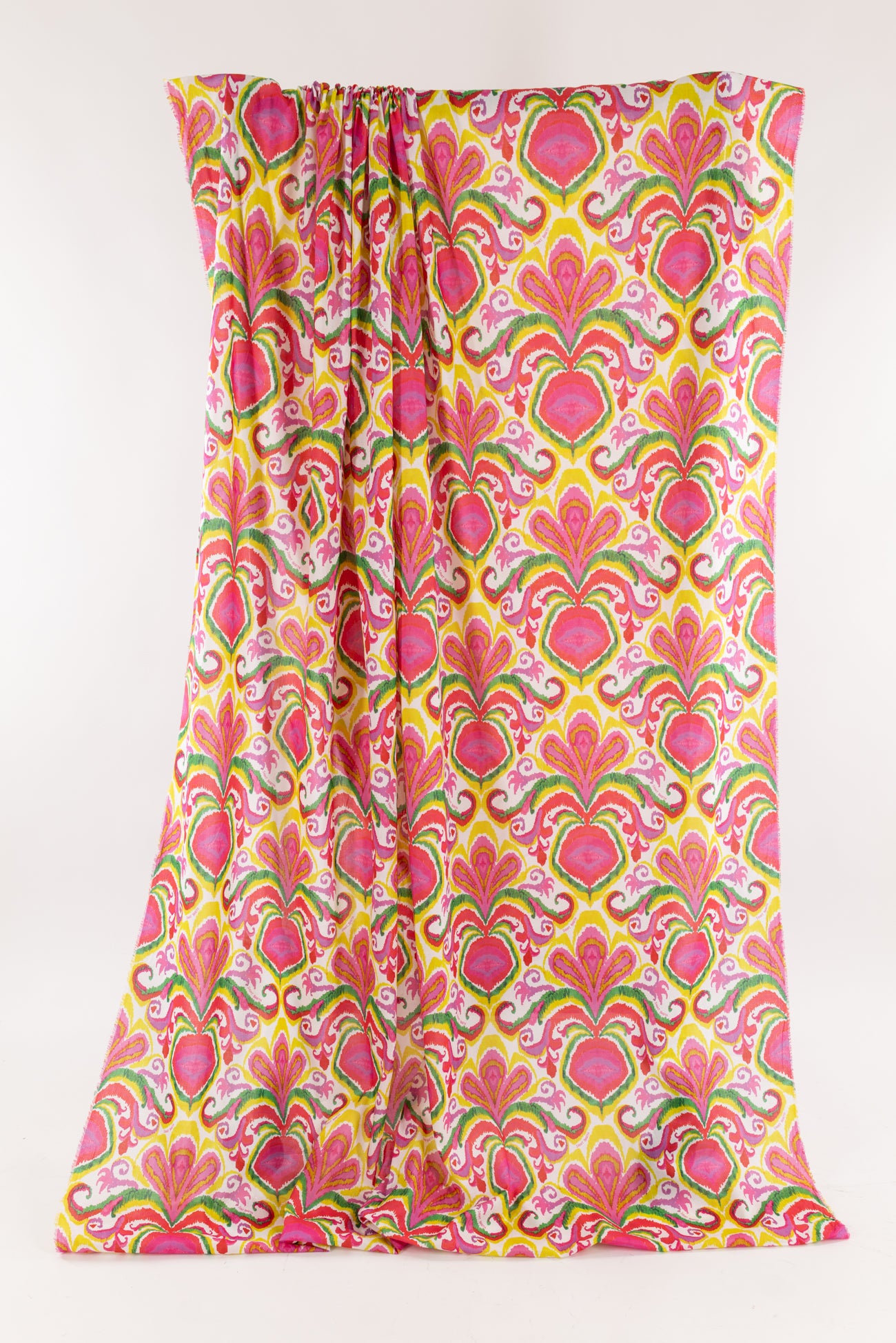 Bright stylized ikat print in fuchsia, with green, kiwi, and gold on cotton lawn, fine deadstock from boho chic brand MC2 Saint Barth, milled in Italy. Light shirting weight, with an appealing smooth hand, a 13" repeat, and a soft drape. Right for a dress, shirt, tunic, skirt, soft pants, caftan, kimono or children's.