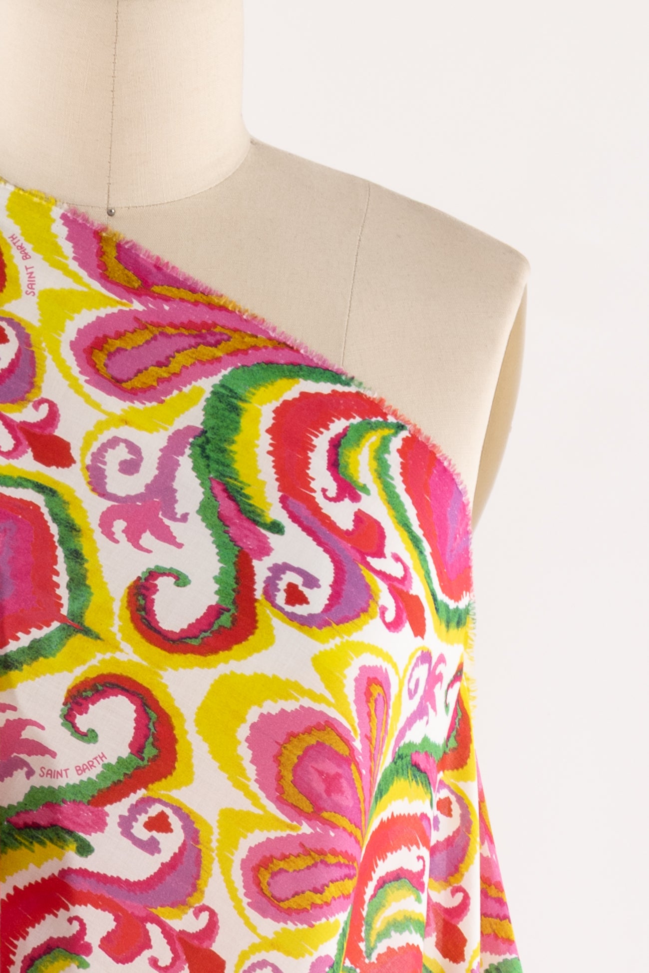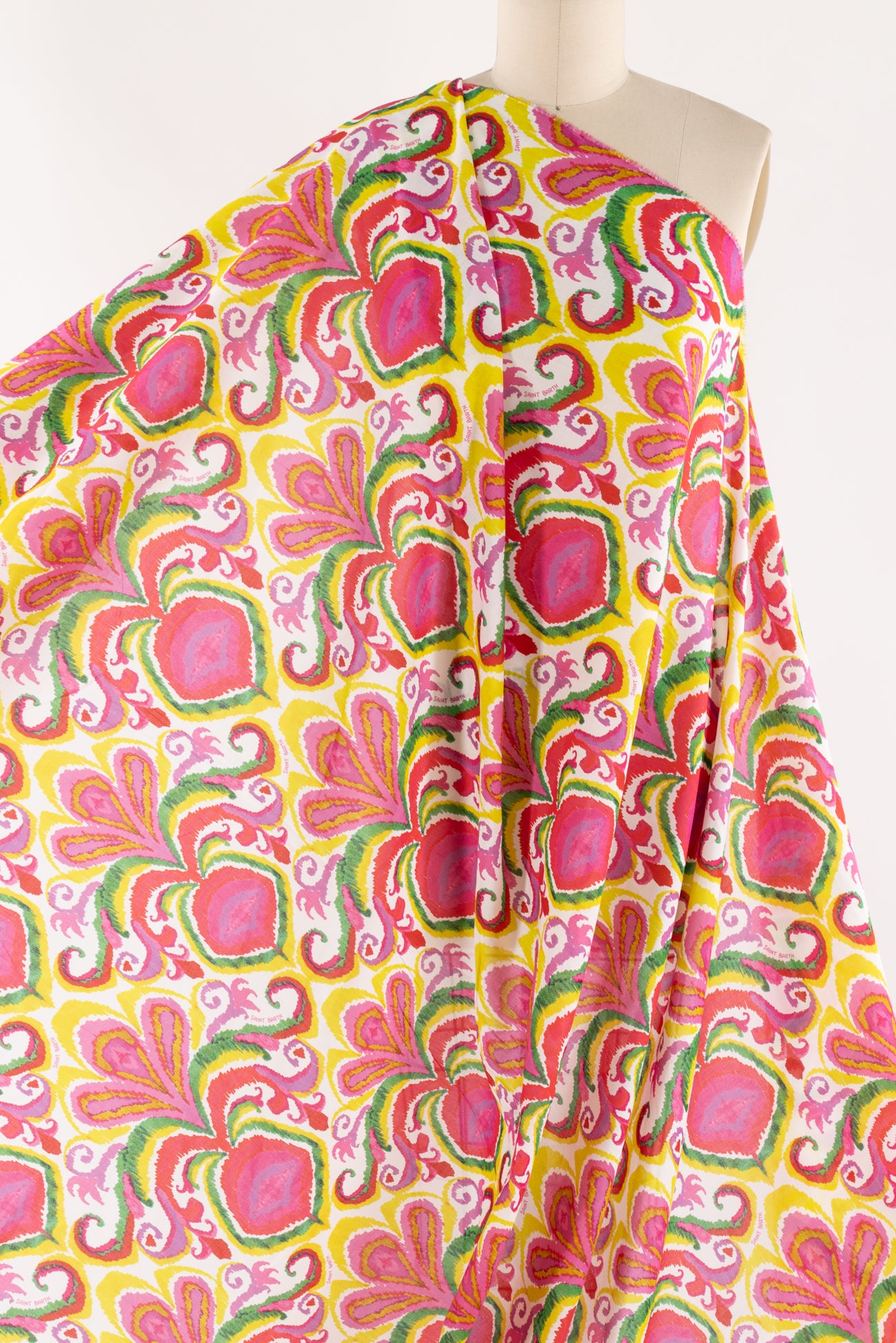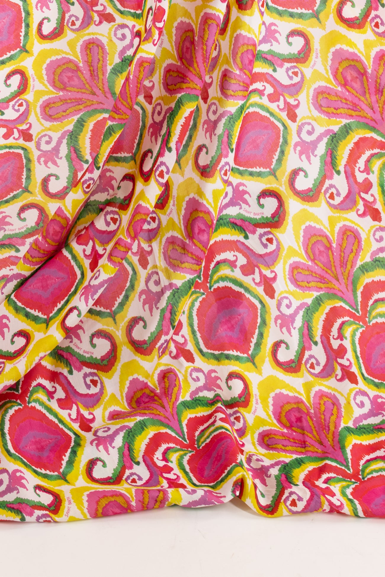 Bright stylized ikat print in fuchsia, with green, kiwi, and gold on cotton lawn, fine deadstock from boho chic brand MC2 Saint Barth, milled in Italy. Light shirting weight, with an appealing smooth hand, a 13" repeat, and a soft drape. Right for a dress, shirt, tunic, skirt, soft pants, caftan, kimono or children's.