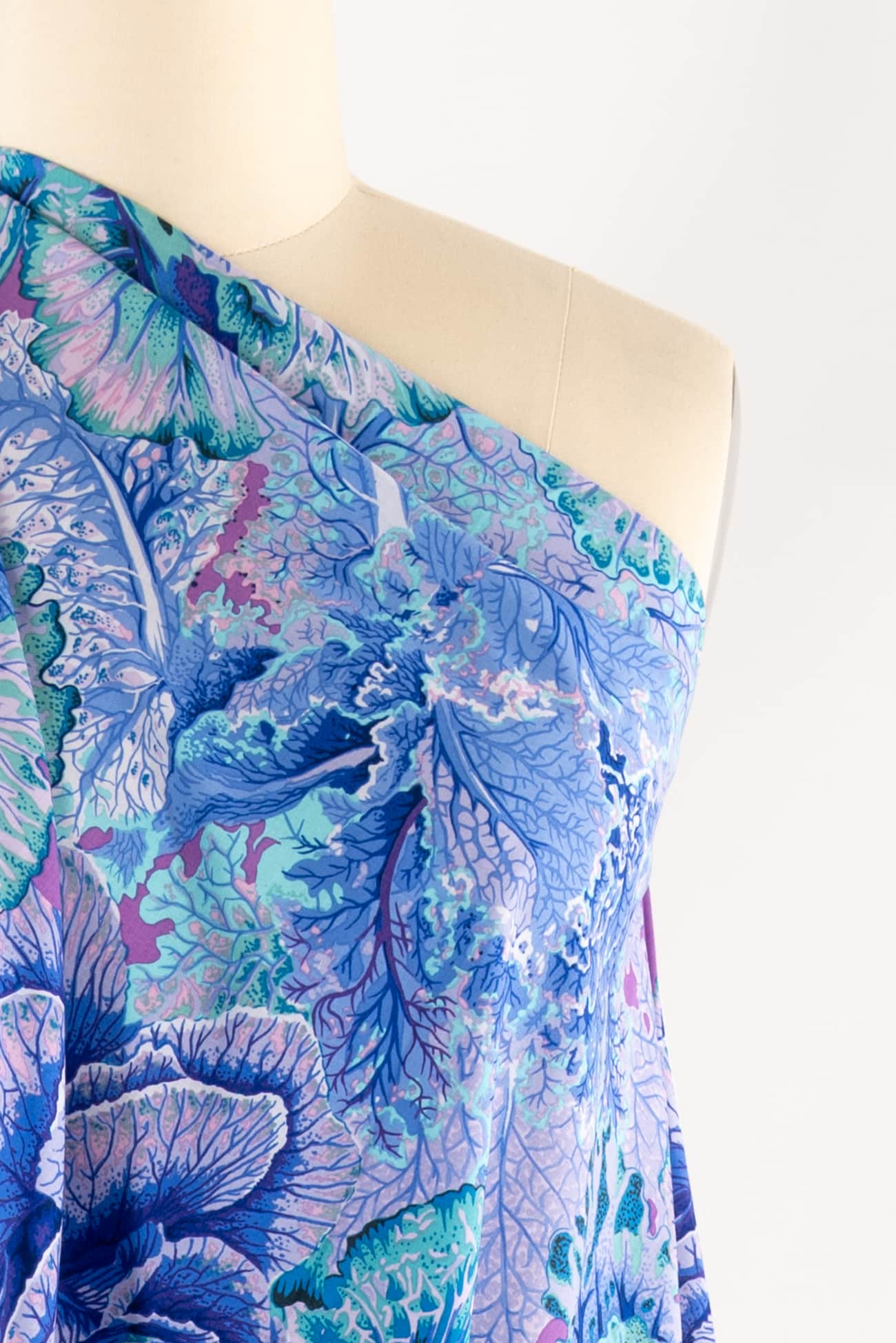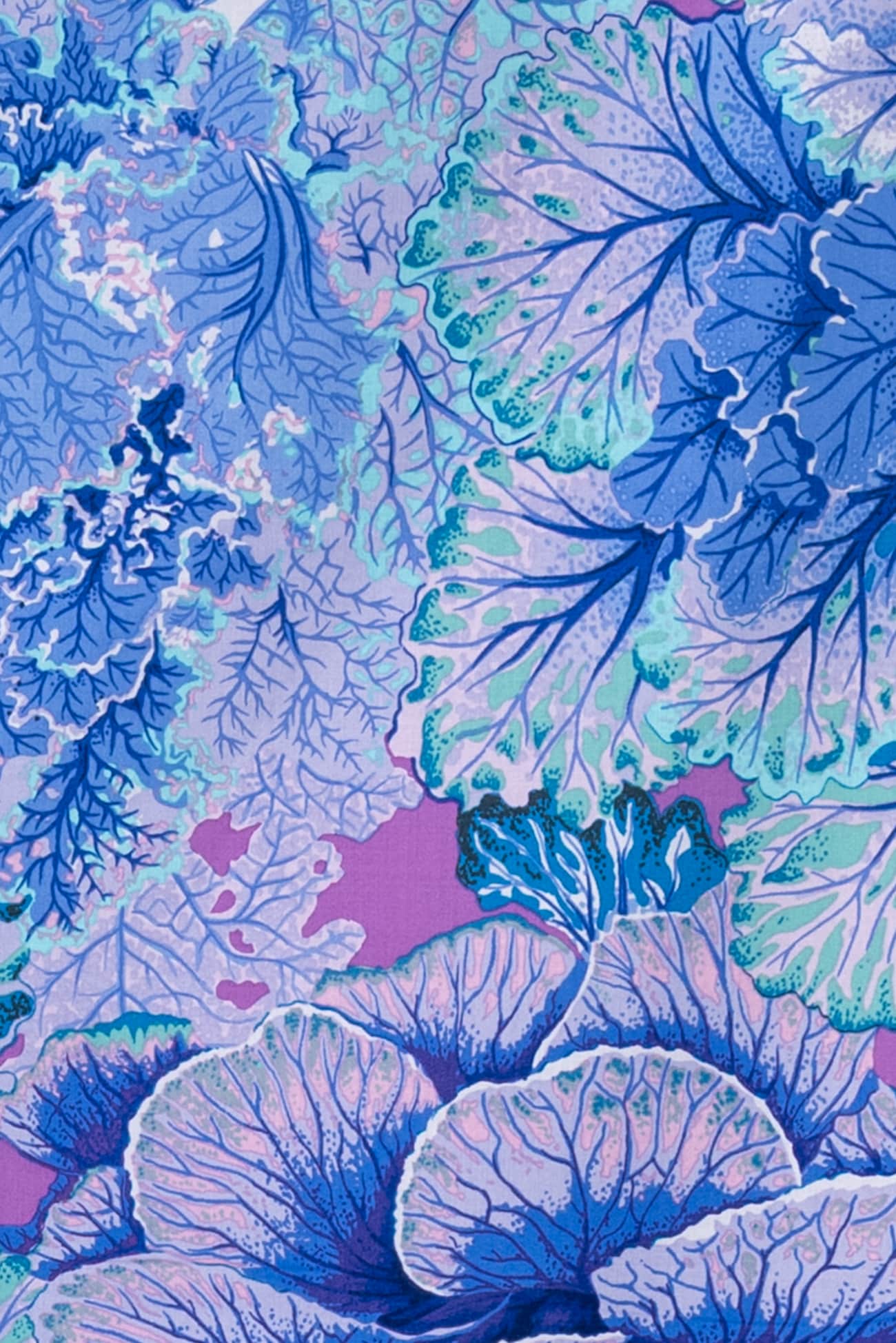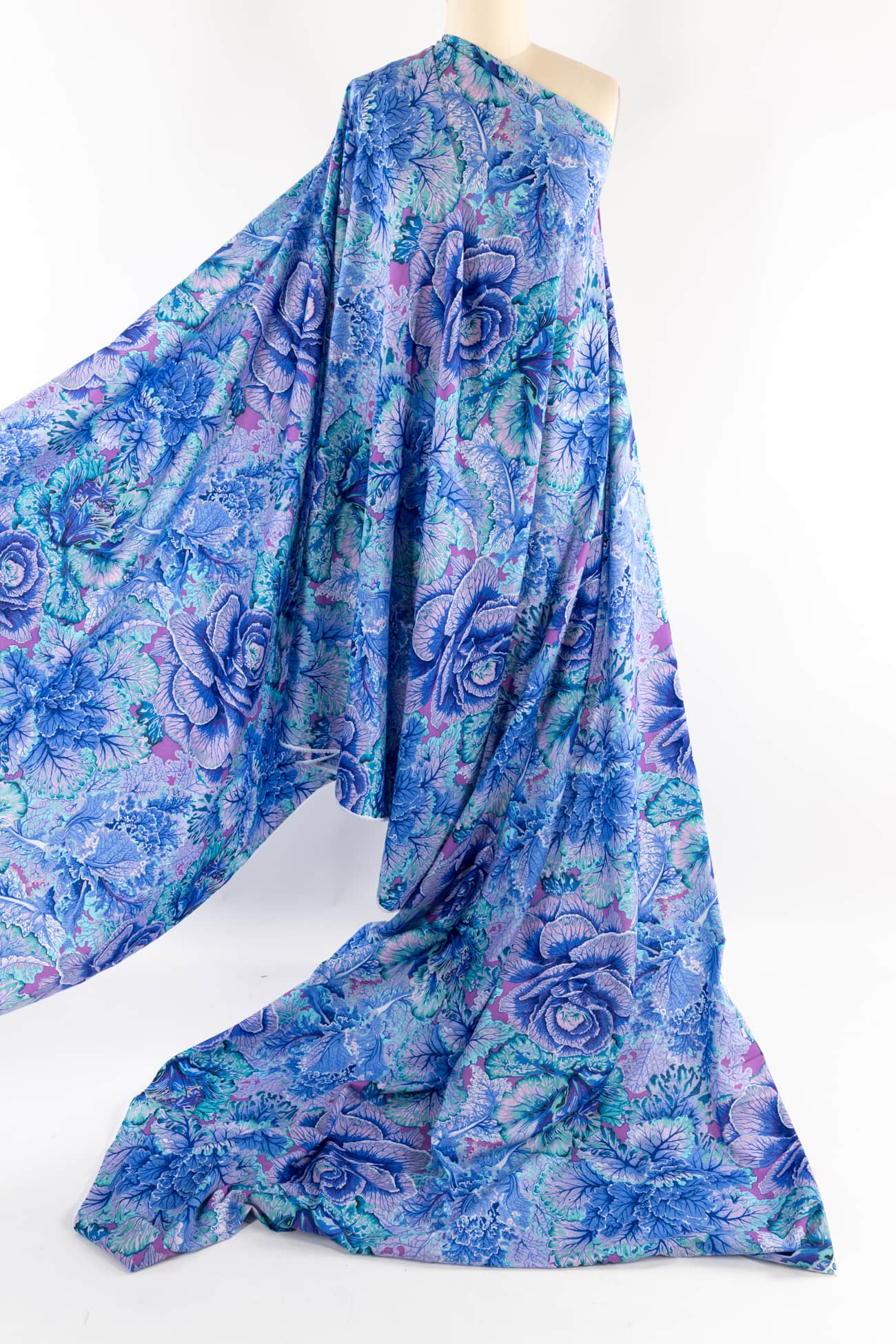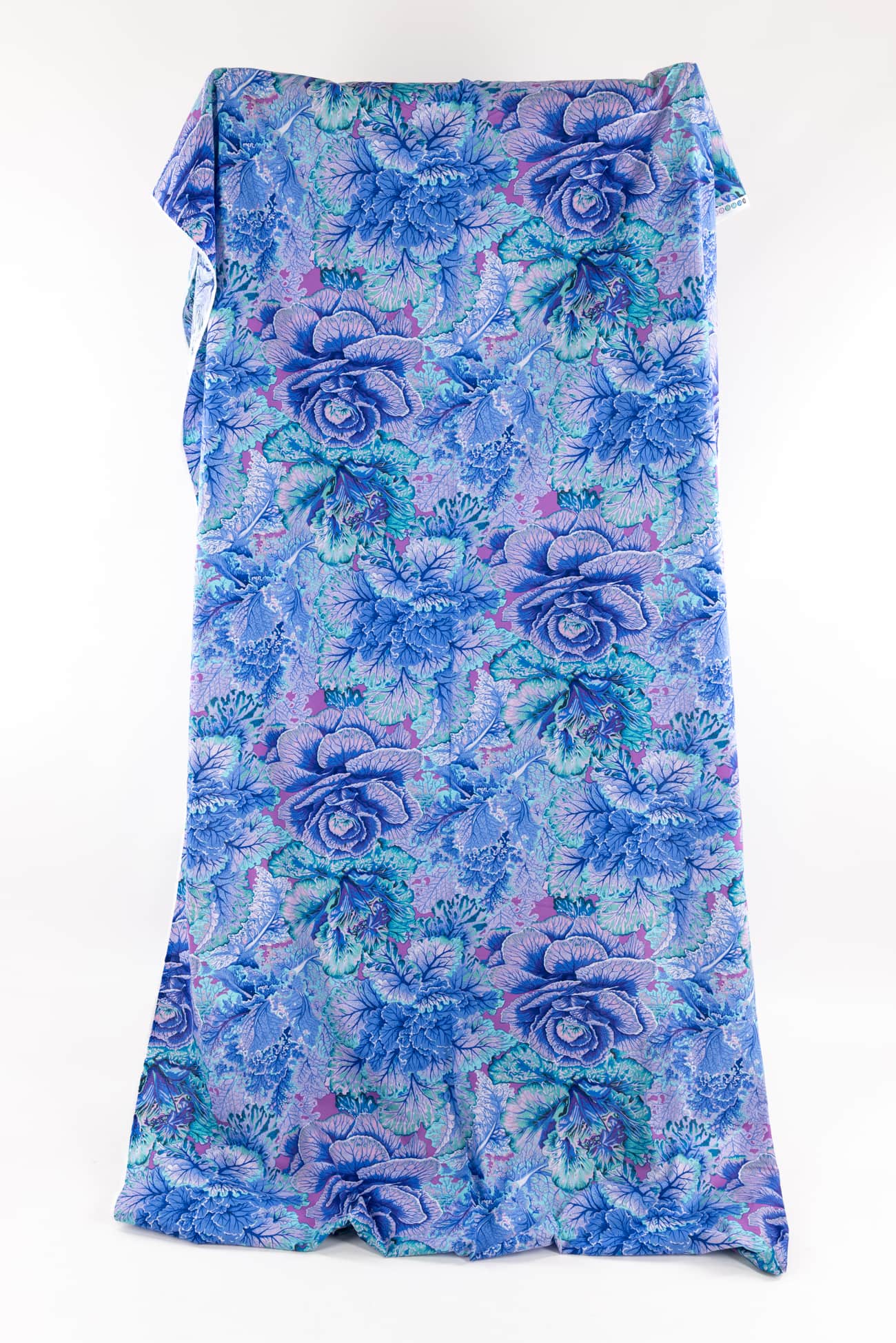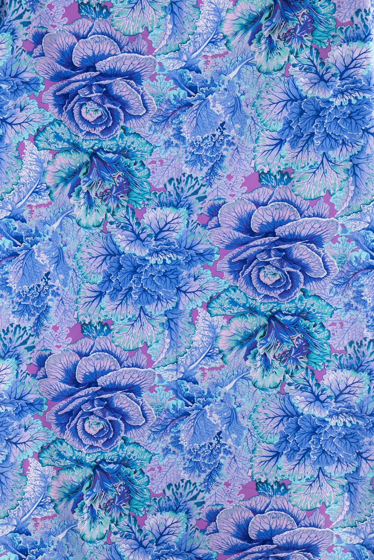 Vibrant lush floral in pastel shades of blue and purple in a fine-grained cotton woven, from the studio of renowned colorist Kaffe Fassett. Lightweight, opaque with a smooth matte hand, a 24¼" repeat and light drape. Right for a dress, shirt, skirt, tunic, top, soft pant, caftan, kimono, loungewear, men's or children's.