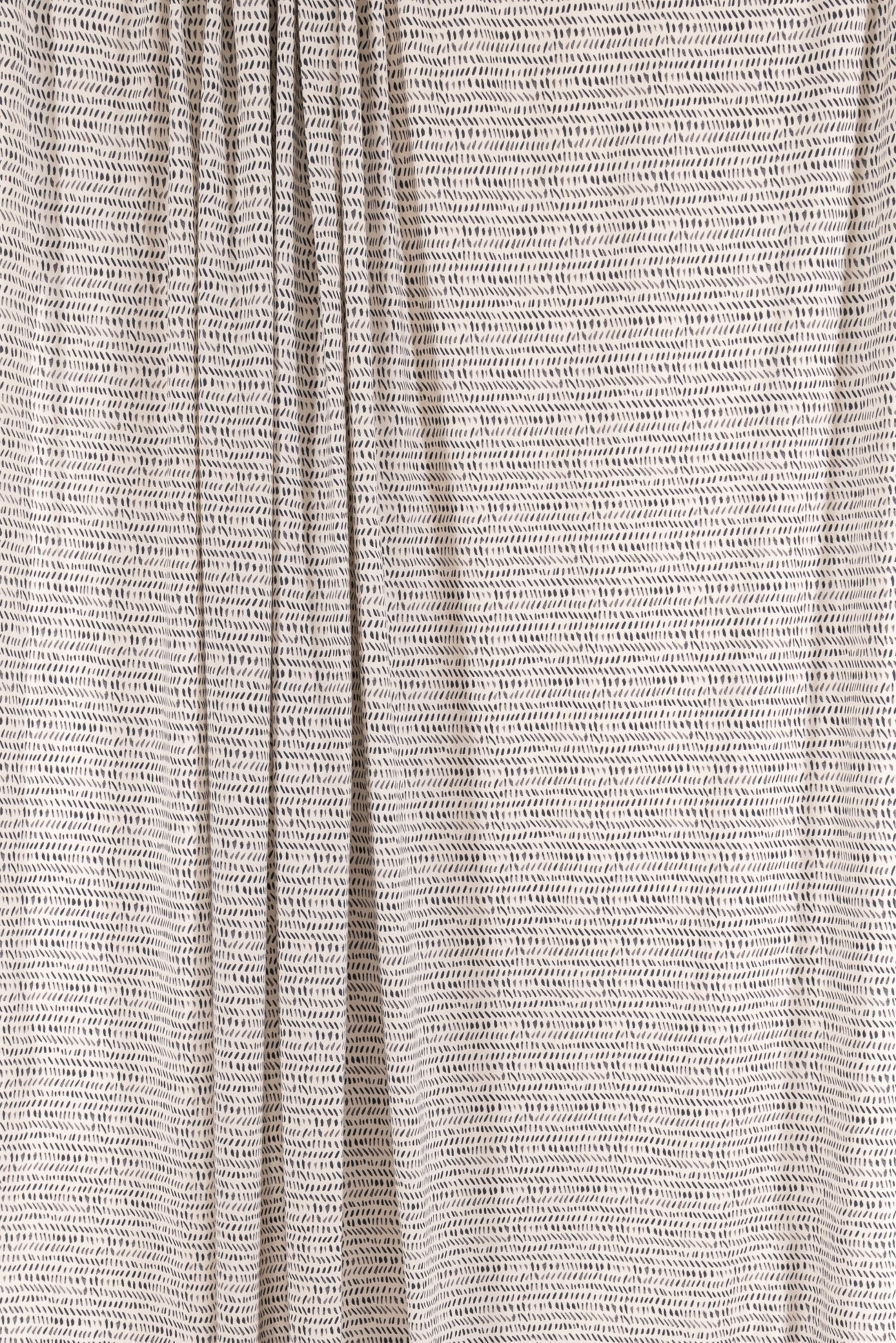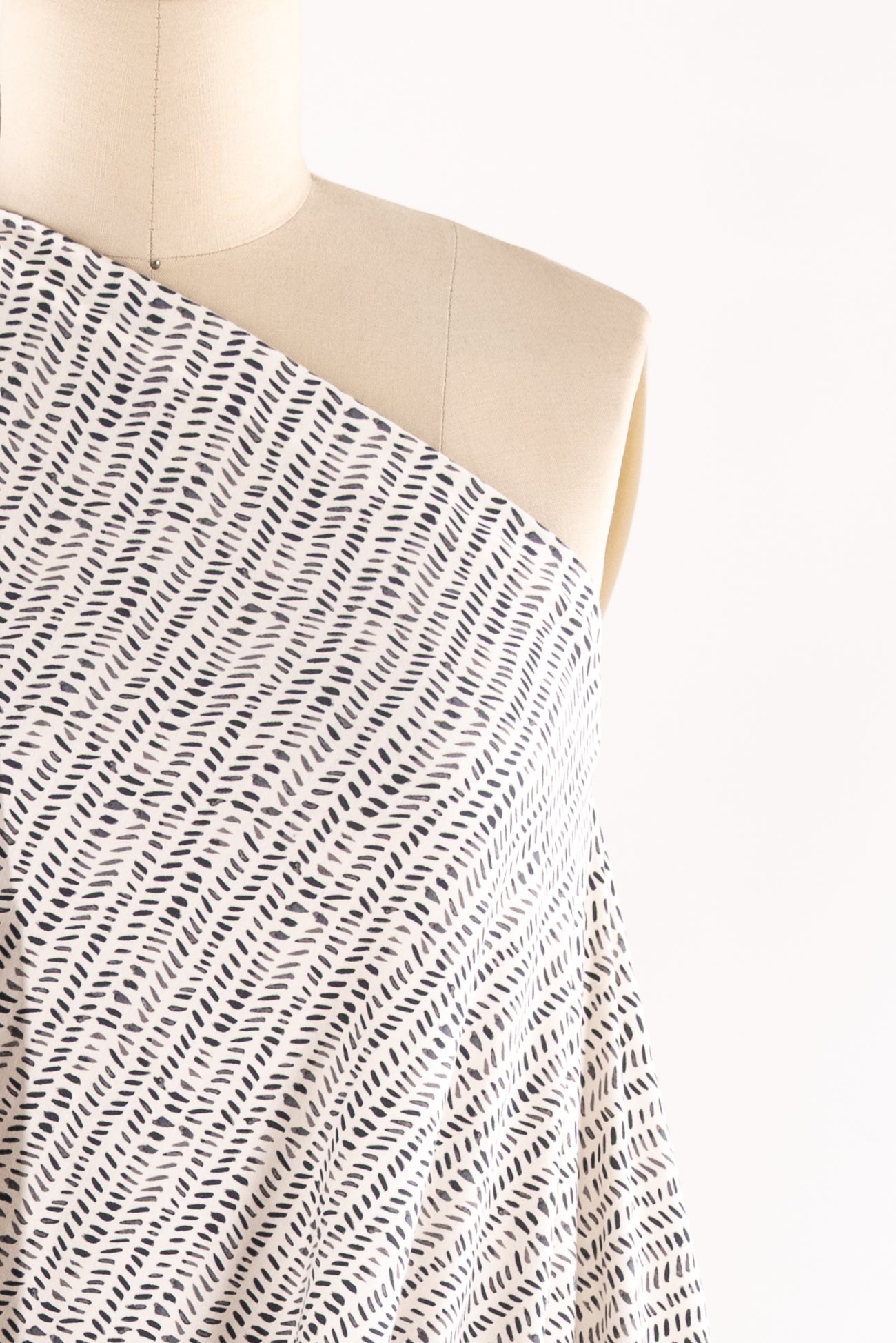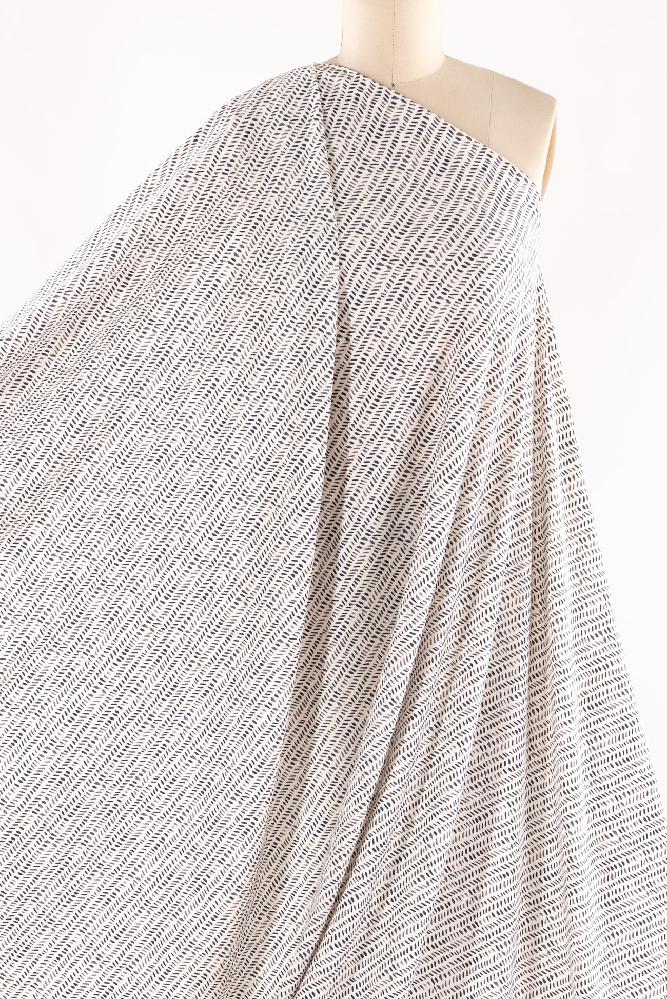 Rows and rows of small gray painterly hatch marks on parchment, printed on a fine quality cotton/spandex knit. Mid/lightweight, with an appealing soft hand and drape, 4-way stretch, and some rolling at the cut edge. Right for a t-shirt, top, tunic, dress, skirt, soft pants, leggings, loungewear, men's or children's. Oeko-Tex® certified.