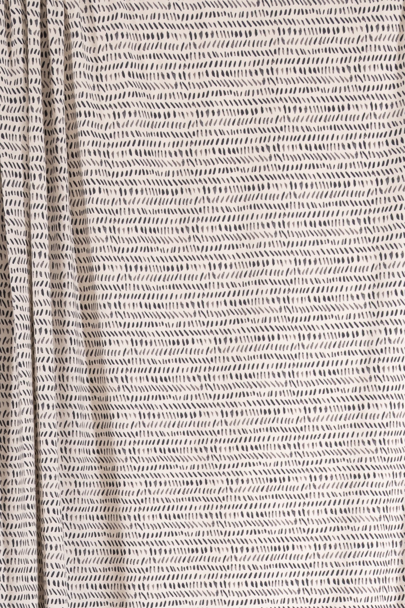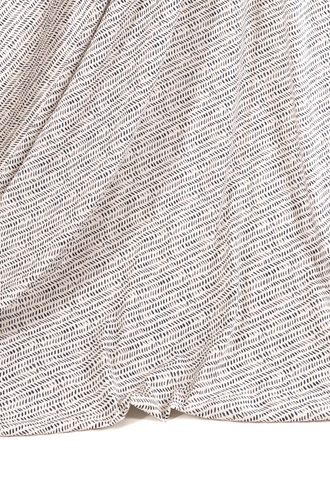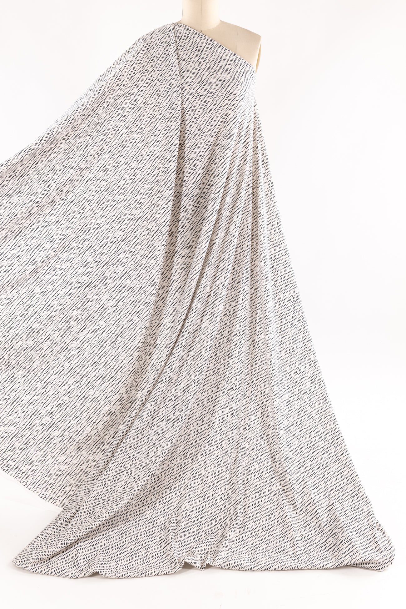 Rows and rows of small gray painterly hatch marks on parchment, printed on a fine quality cotton/spandex knit. Mid/lightweight, with an appealing soft hand and drape, 4-way stretch, and some rolling at the cut edge. Right for a t-shirt, top, tunic, dress, skirt, soft pants, leggings, loungewear, men's or children's. Oeko-Tex® certified.