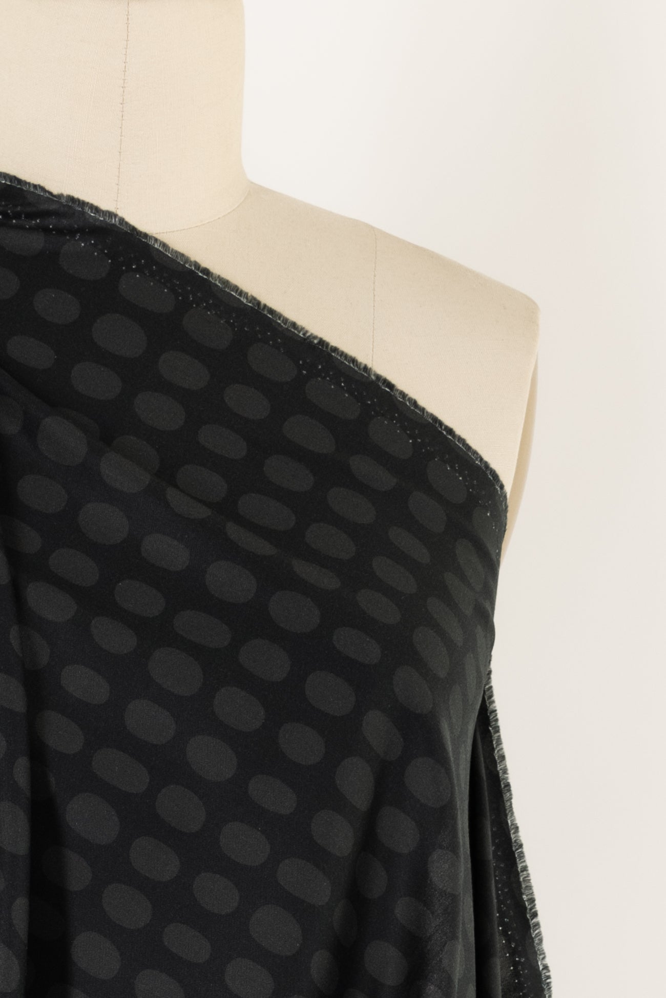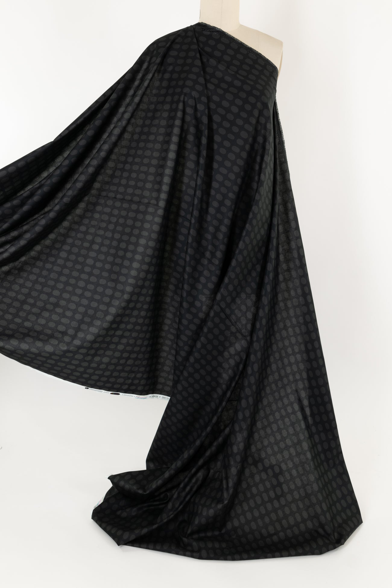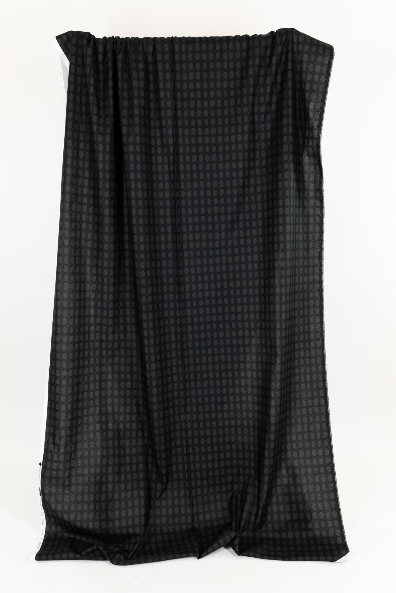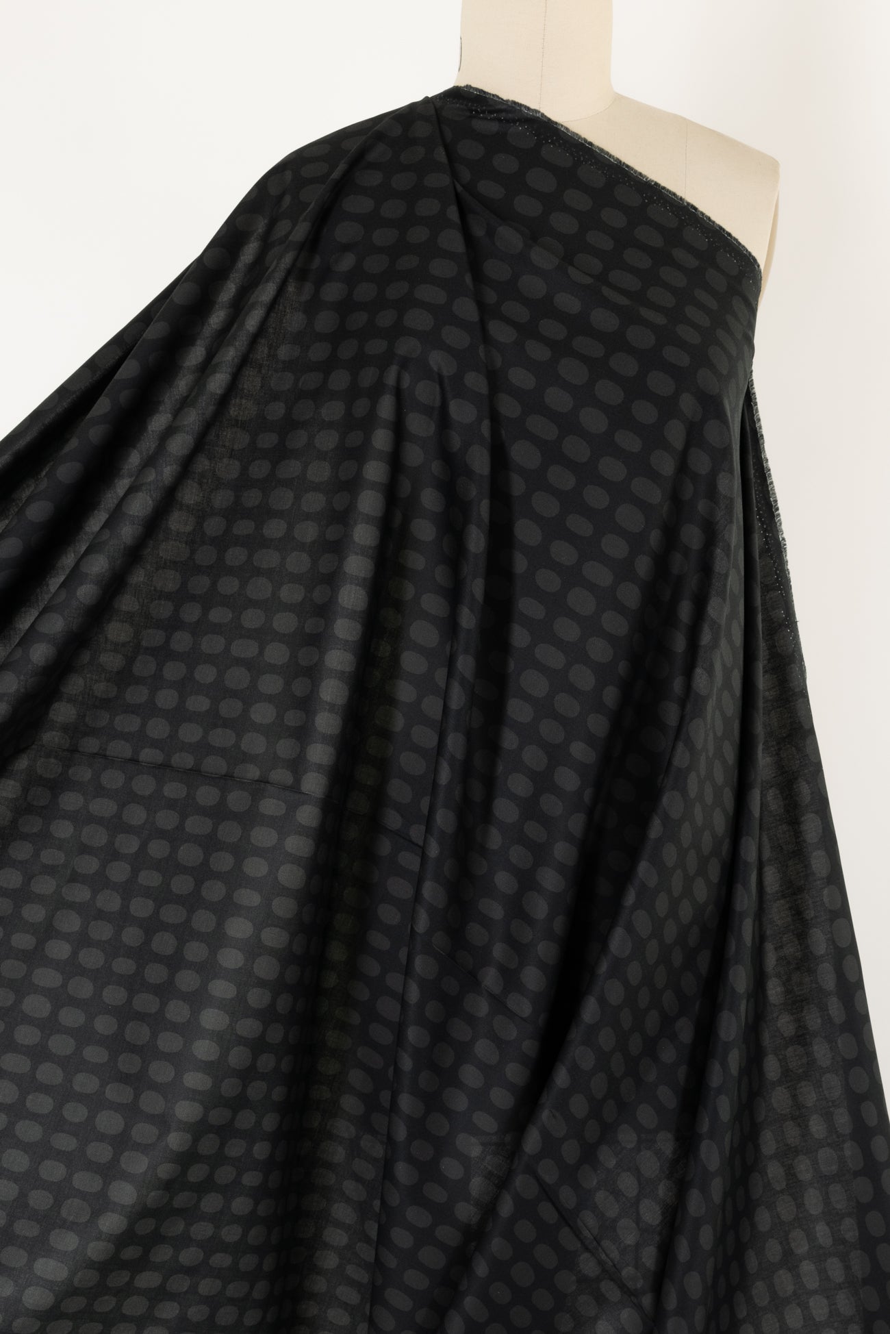Charming dark-toned dotty print in a fine-grained cotton features elongated charcoal dots on a black background. Silky shirting weight with a soft smooth hand and drape. Oeko-Tex® certified. Right for a dress, shirt, tunic, skirt, loungewear, kimono, caftan, men's or children's clothes, crafting too.